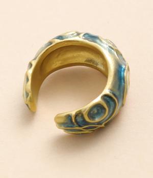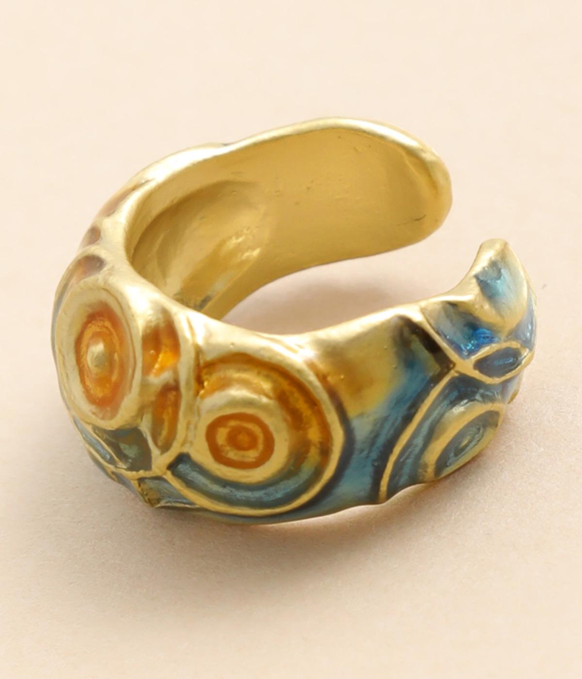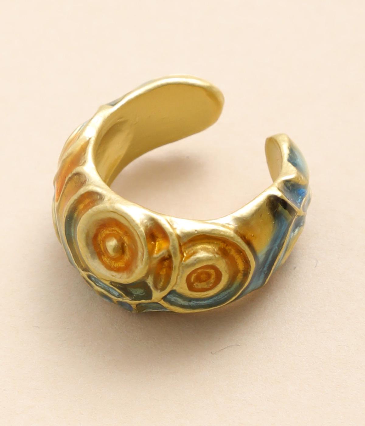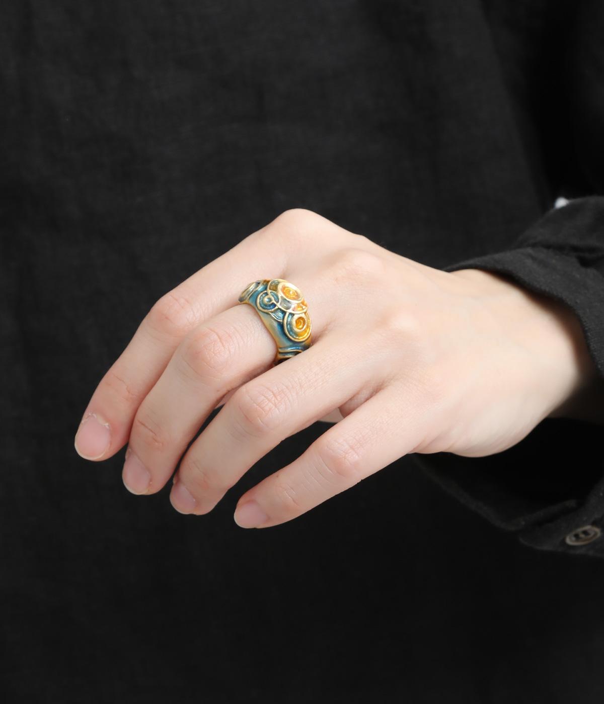 水たまりにぽつぽつと落ちる雨粒が水紋を描き、雲間からさし込む夕焼けが水面に鮮やかなオレンジ色のグラデーションを映す。そんな、夕方の通り雨が止んだ瞬間を表現しています。適度にボリューム感のあるリングで、単品使いでも存在感抜群。
