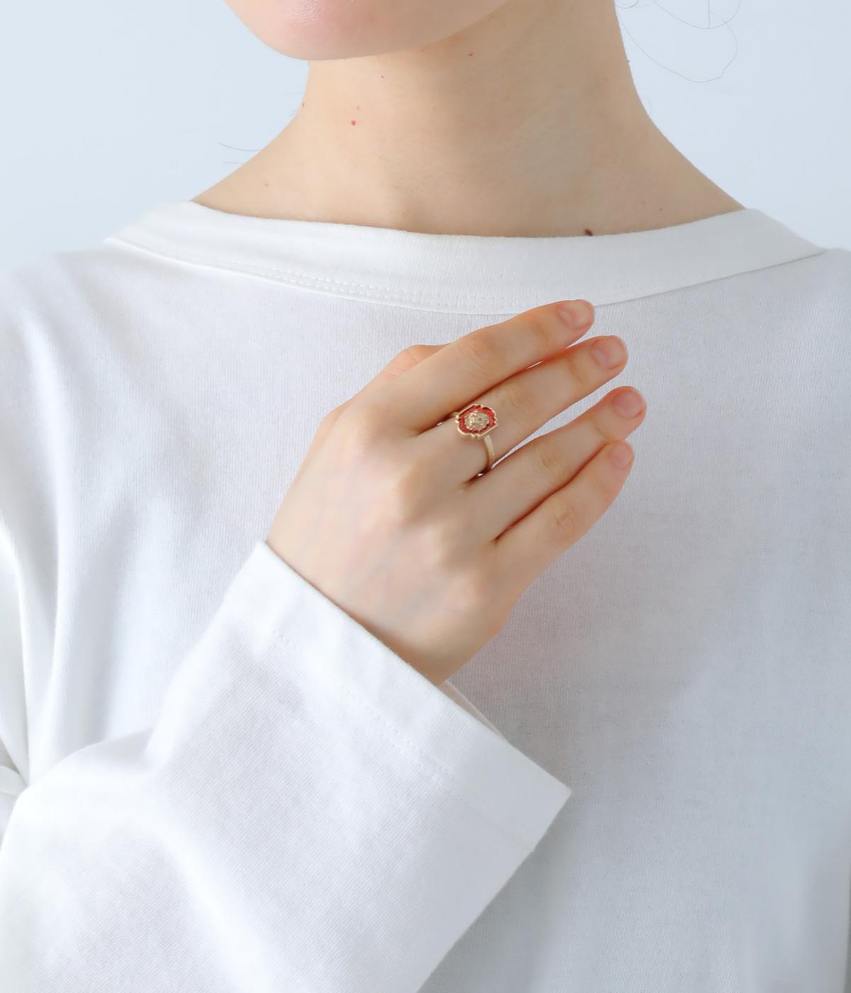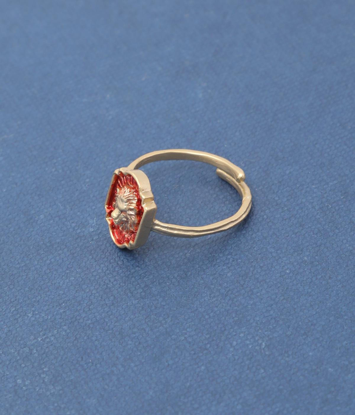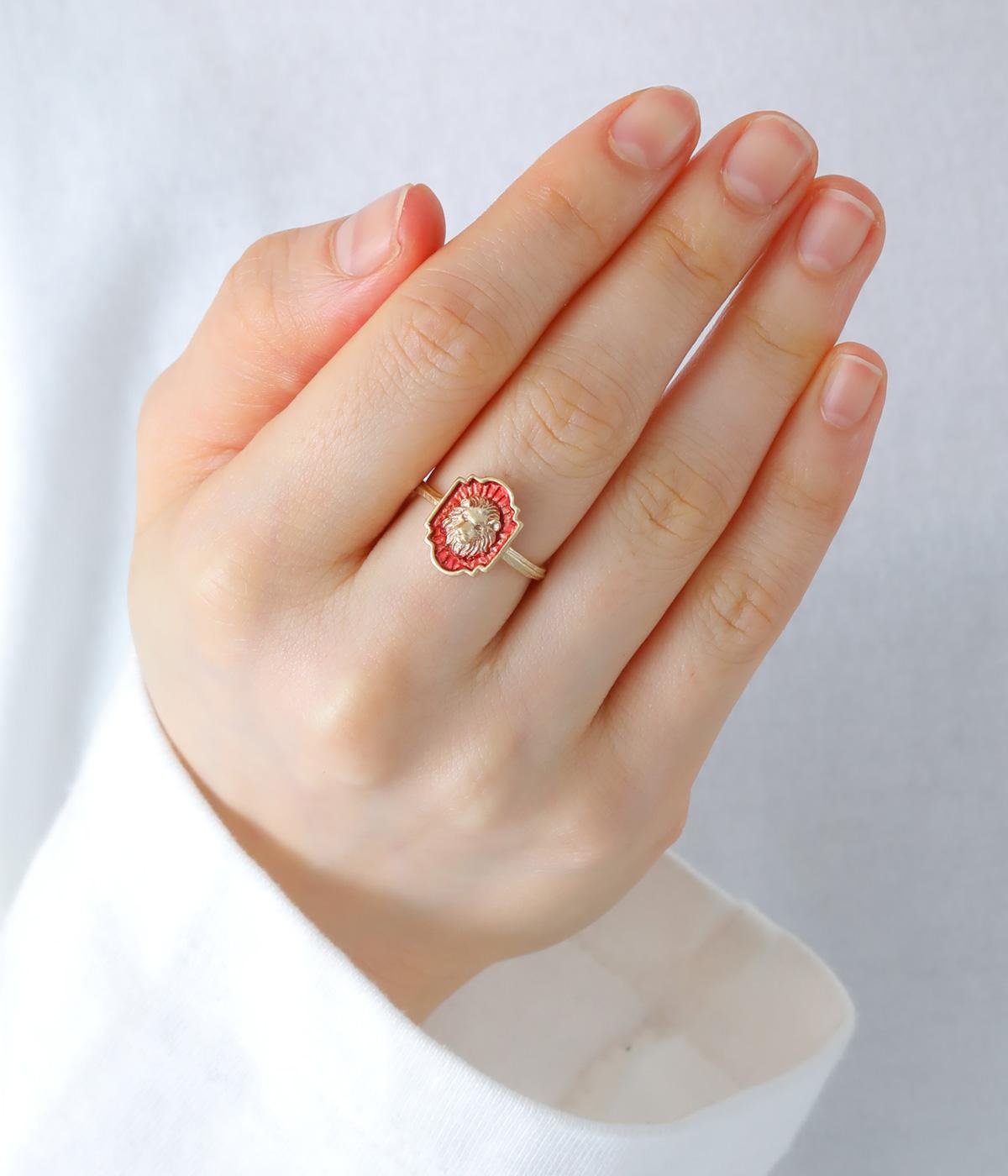 王者の風格を感じさせる赤とゴールドを基調にした、ライオンのエンブレムリング。エンブレムは、ライオンが持つ真っ直ぐで誠実な佇まいを象徴する、クラシックなシルエットにデザインしました。勝利を象徴するルビーを思わせるカラーが、指先を華やかに引き立てます。