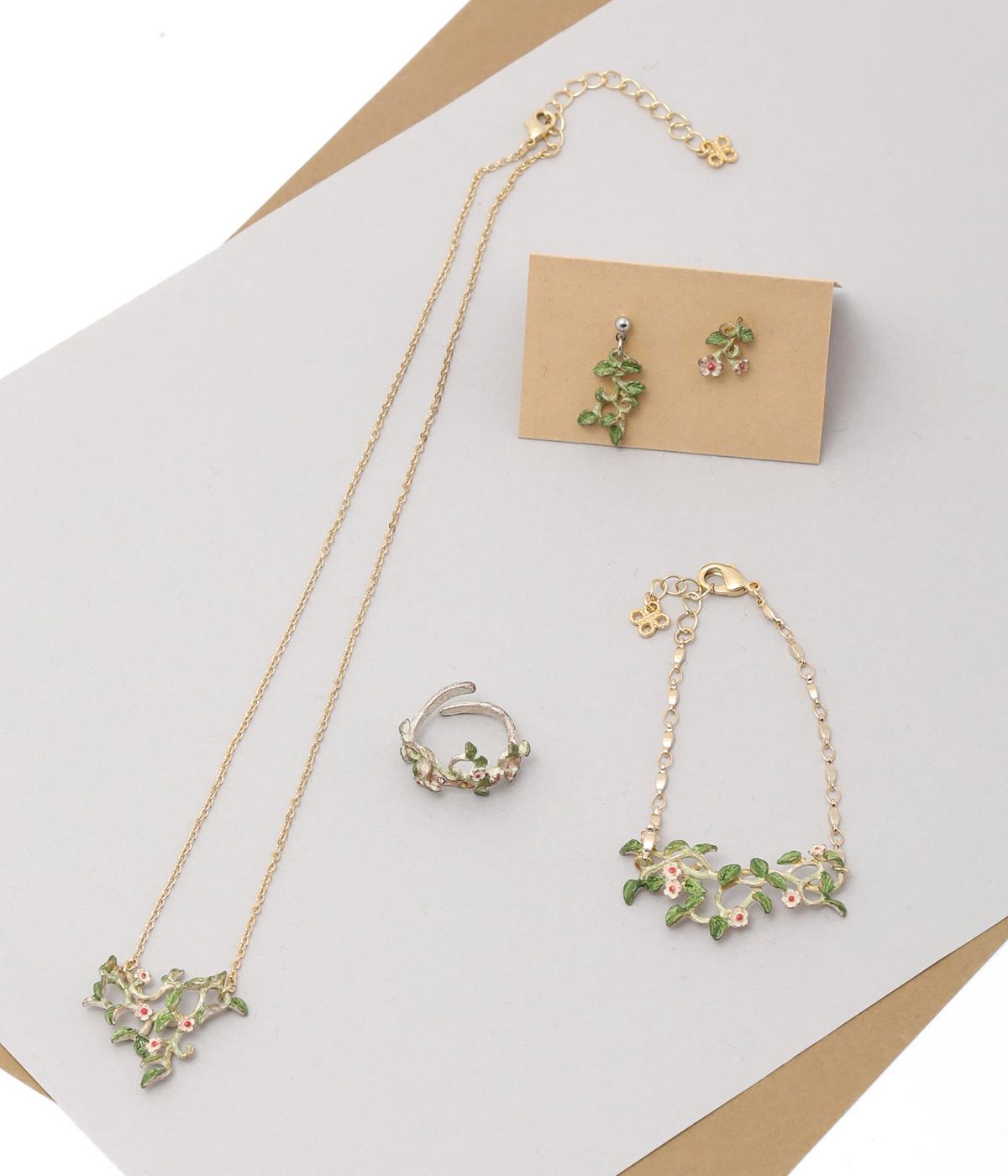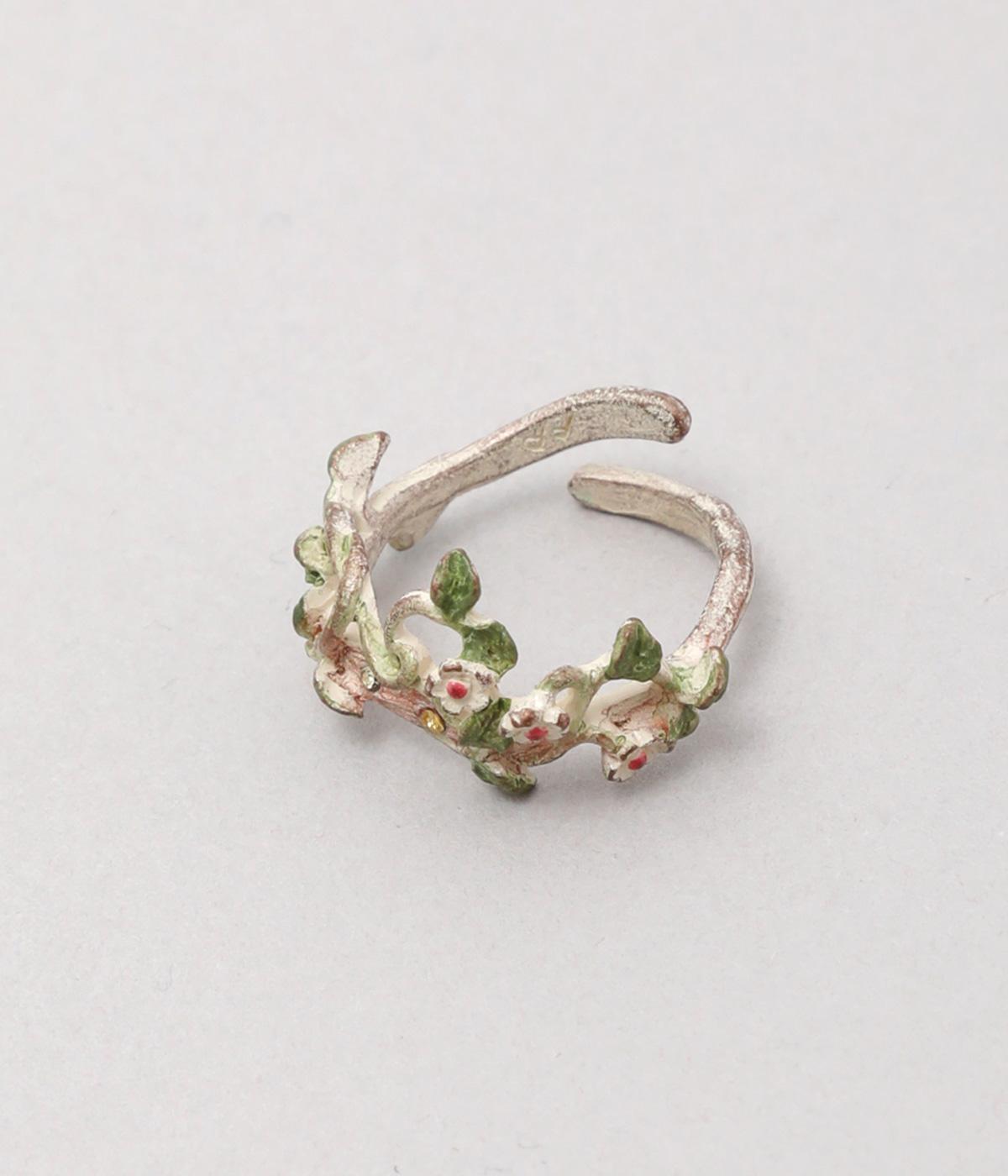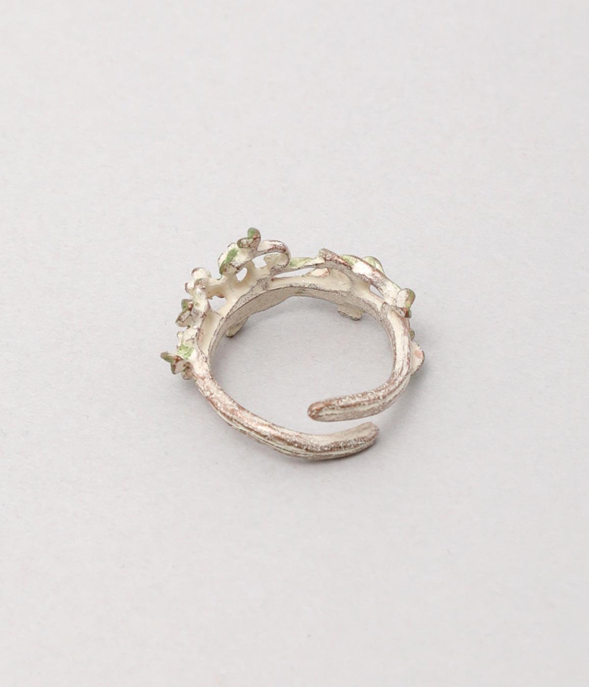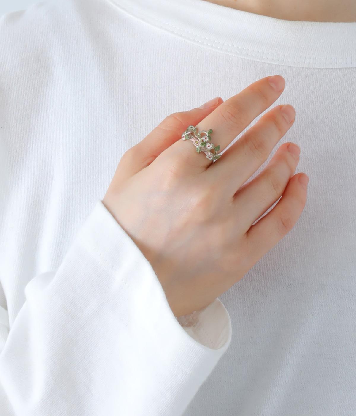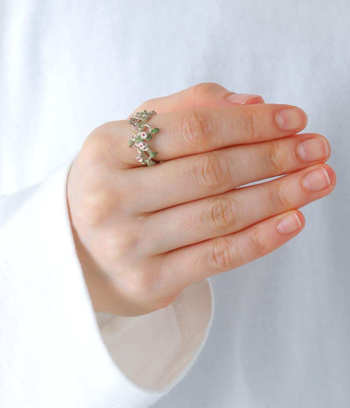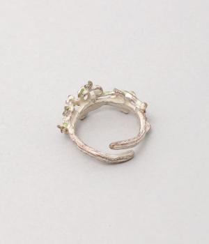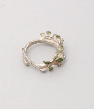 ゆるやかなツルのラインが優雅なサネカズラのリング。流れるような曲線を意識したデザインが印象的で、どこかアール・ヌーヴォーのような雰囲気をまとっています。イエローのカットガラスは、ツタの隙間からこぼれ落ちる木漏れ日をイメージしており、指先の動きに合わせてきらめきを放ちます。