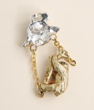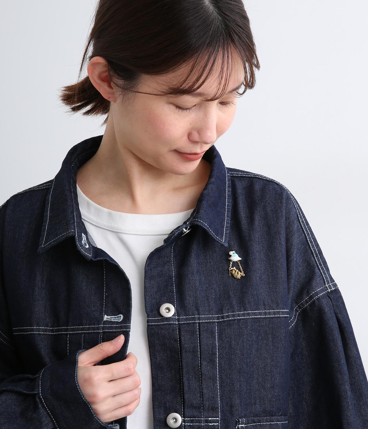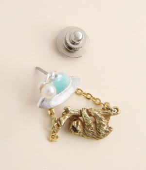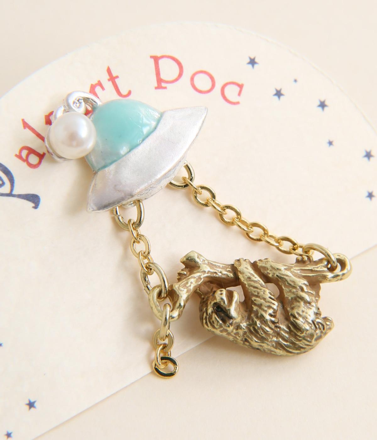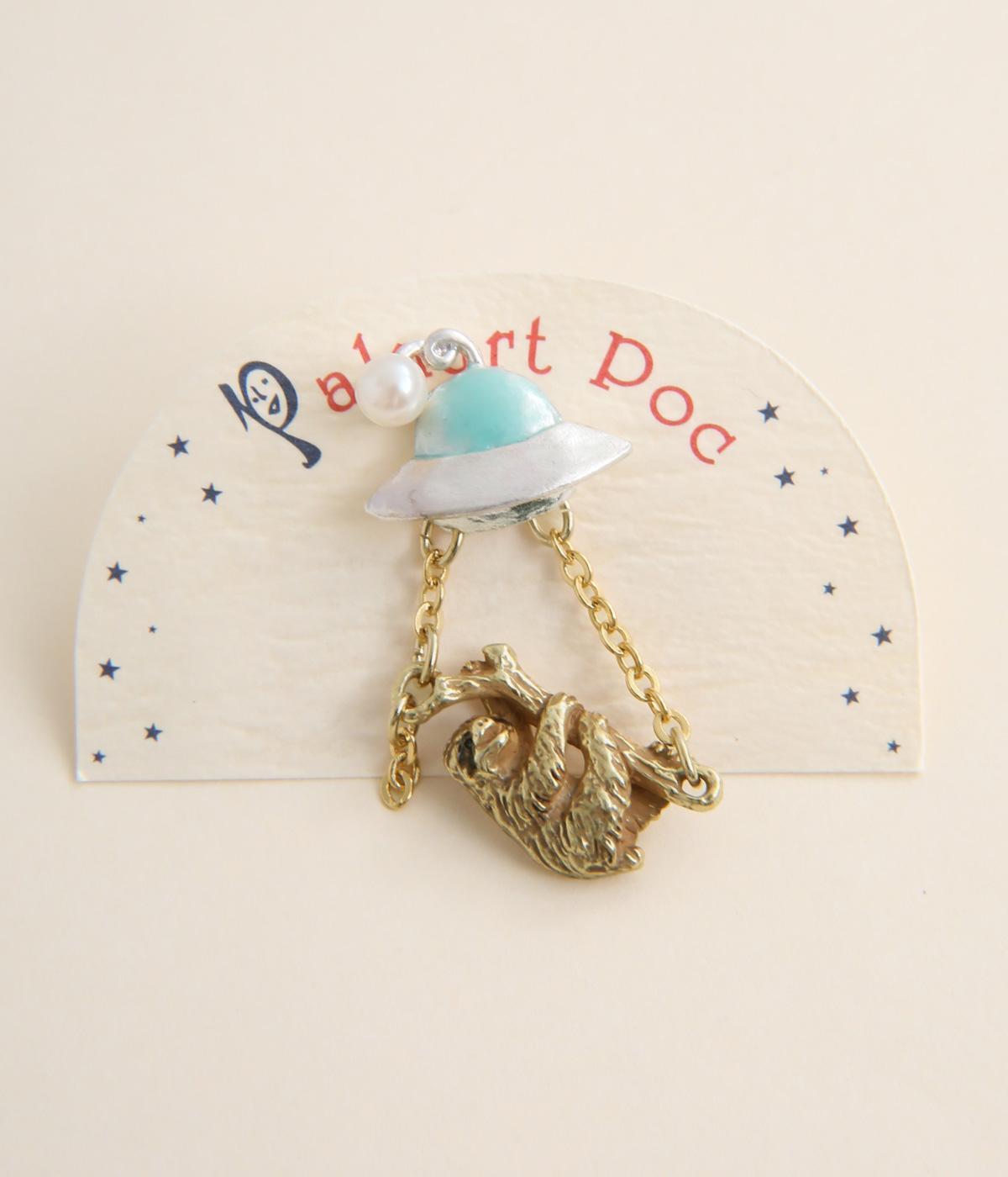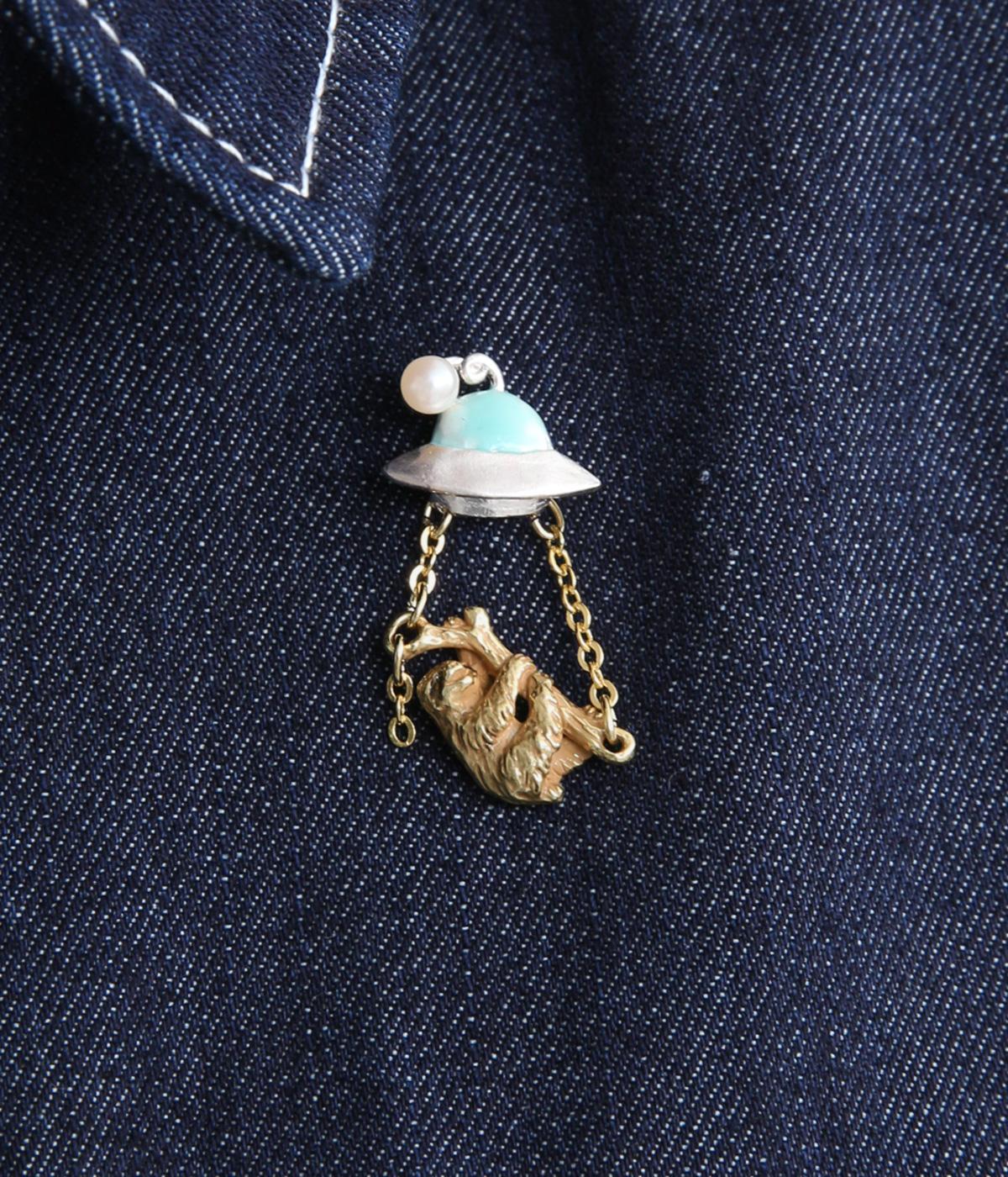 UFOにさらわれるナマケモノを描いた、ユニークなタックピンです。ナマケモノを囲う左右のチェーンは、UFOから降り注ぐ光を表現しています。いつものジャケットやバッグにつけるだけで、装いのアクセントになる、こだわりのつまったアイテムです。