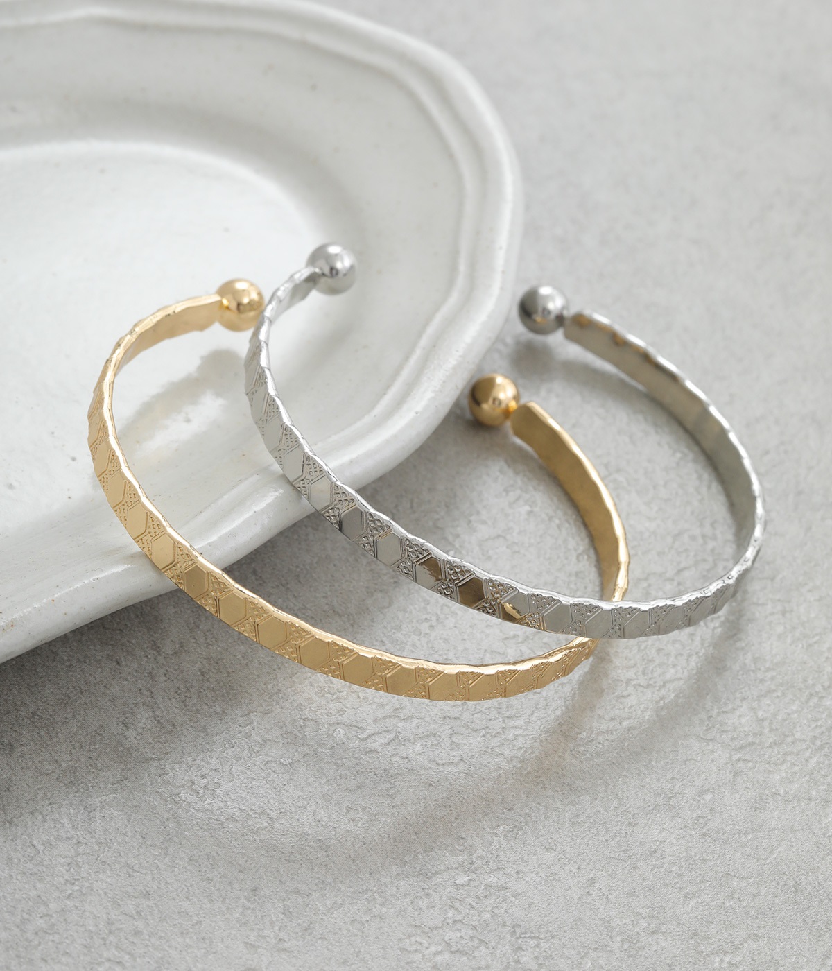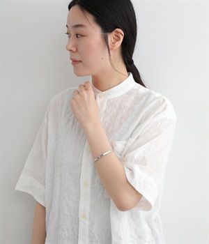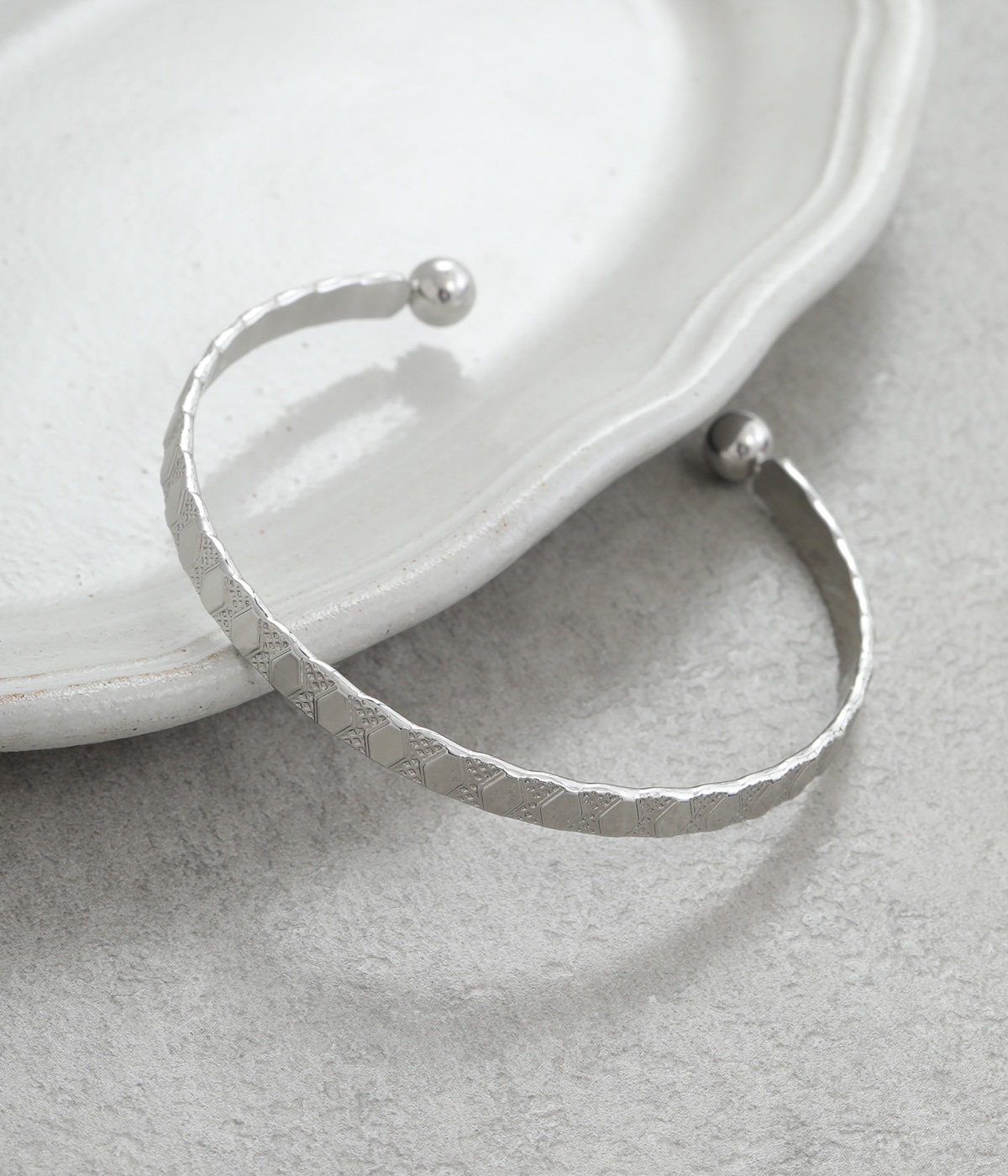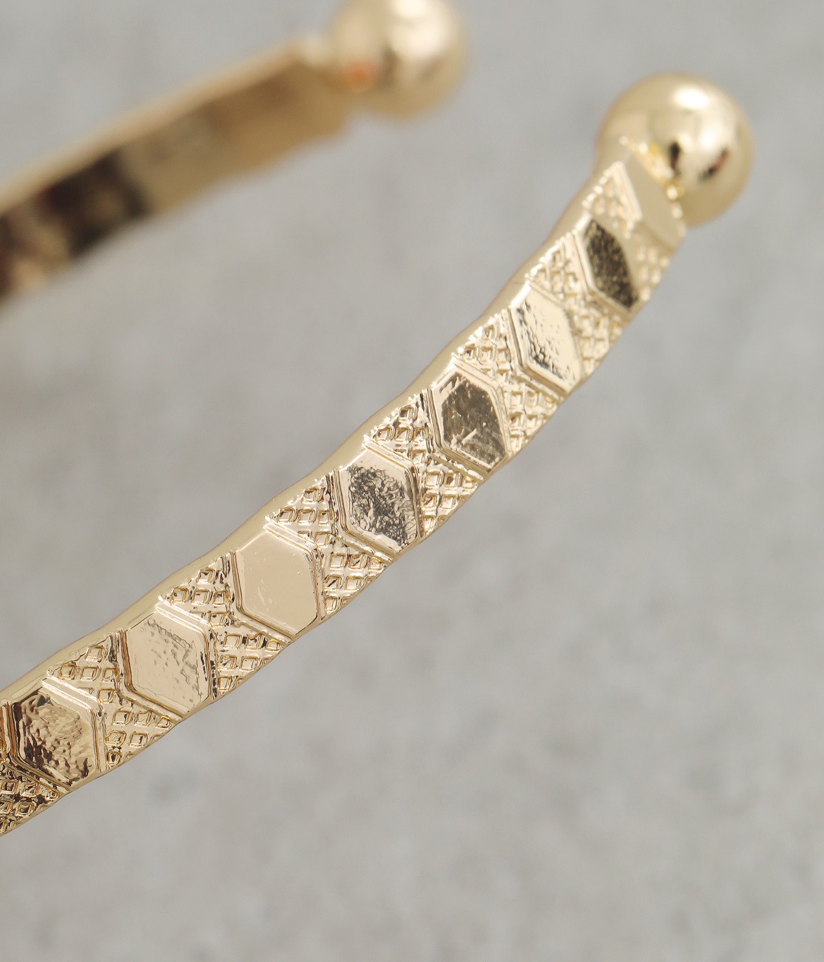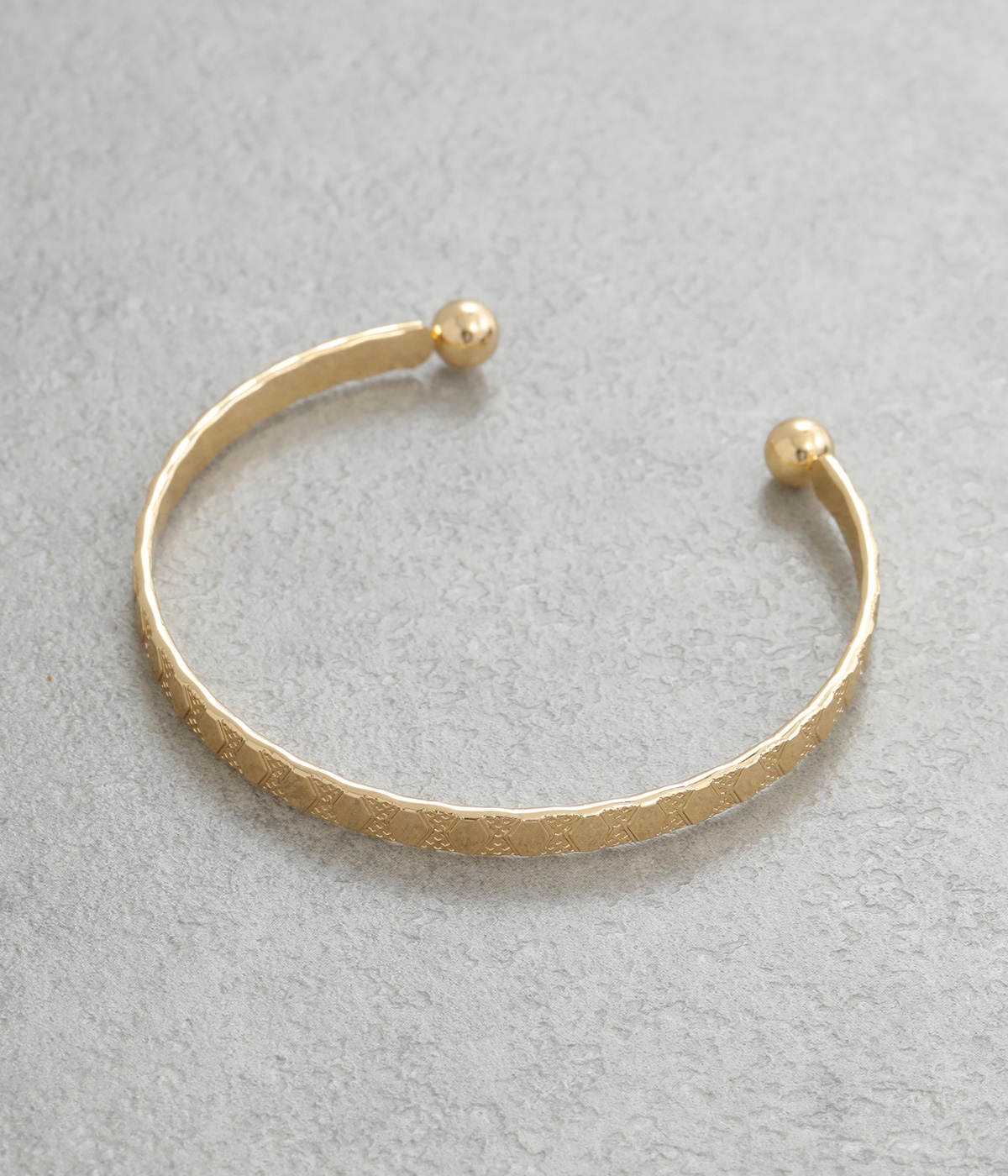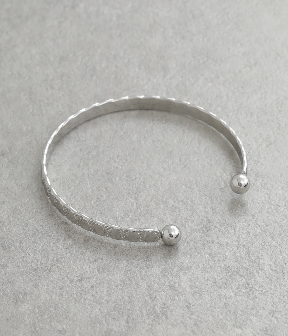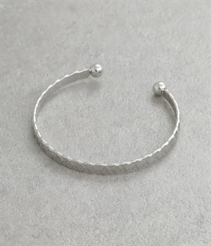 細身に作られているので手首を華奢に演出し、他のバングルやブレスレットとの重ねづけにもおすすめ。両端にボールのようなディテールをあしらっているのがポイントです。デザイン性を上げるこだわりのテクスチャーに注目を。