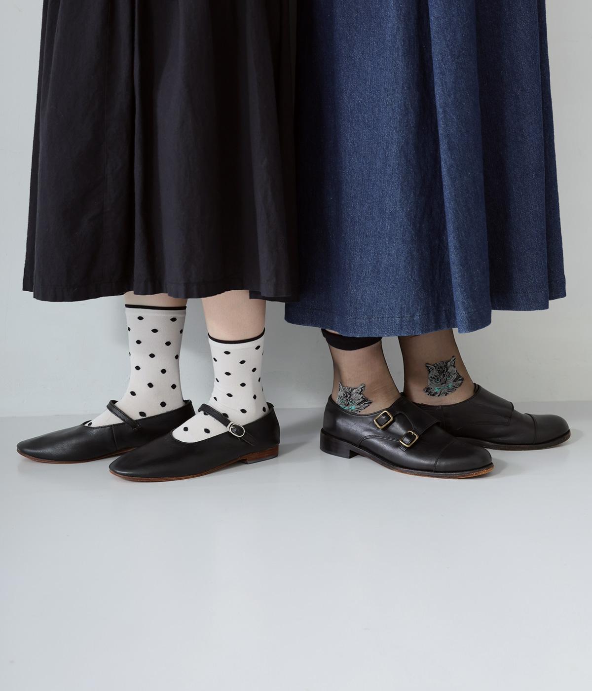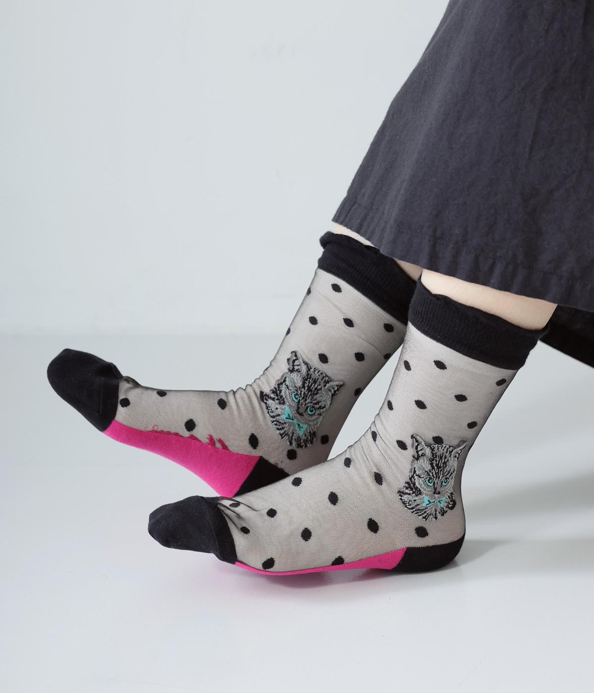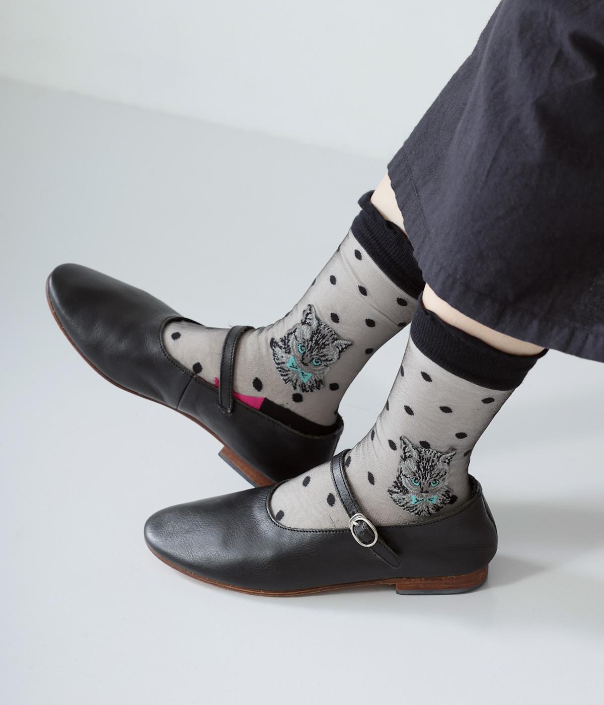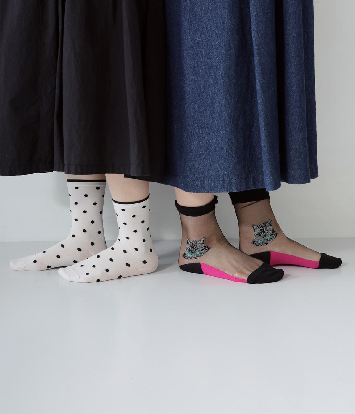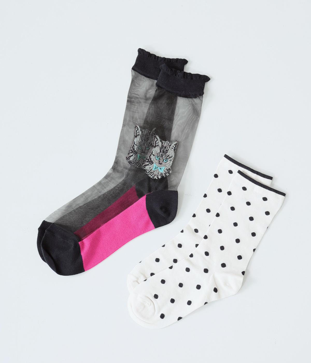ドット柄ソックスと、愛らしい猫をデザインしたシースルーソックスの2足セット。それぞれ一枚ではもちろん、重ねるとより華やかなデザインをたのしめます。サンダルやパンプスにも相性がよく、コーディネートのアクセントにぴったりです。