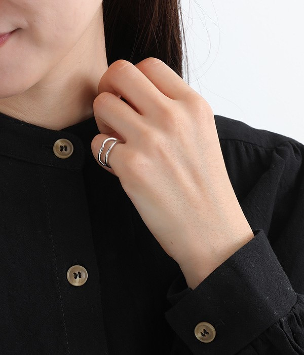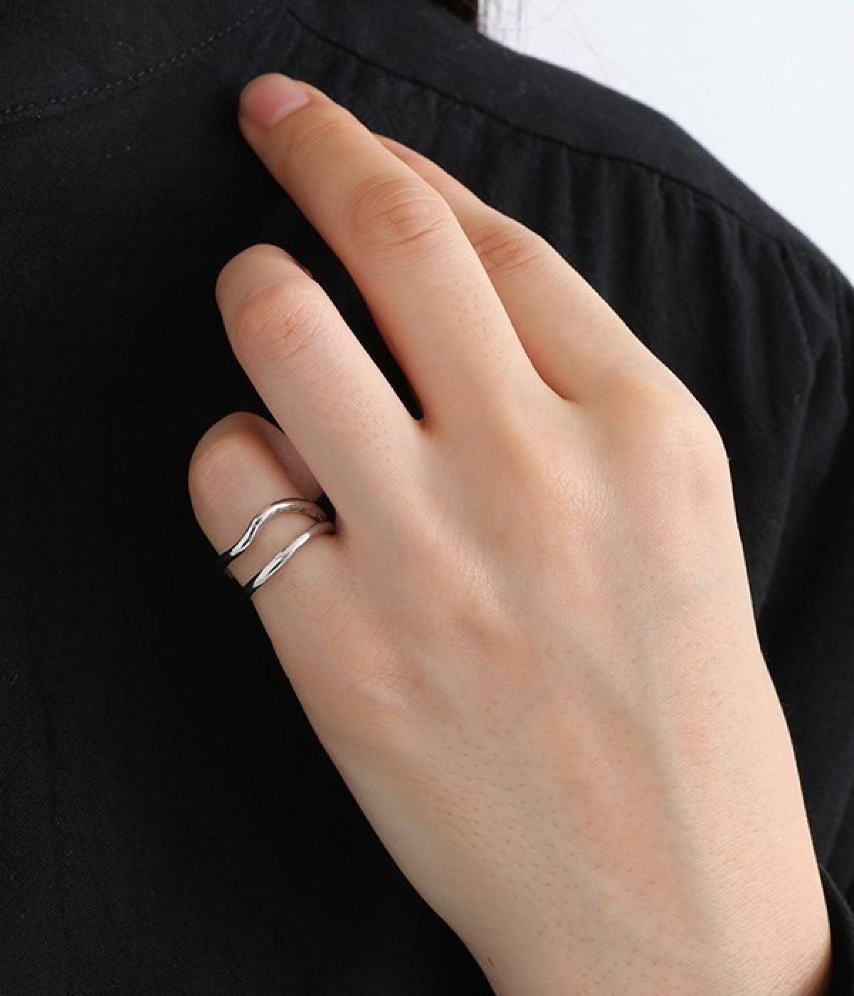 手元が引き締まるメタルのピンキーリング。ダブルのリングを組み合わせたシンプルなデザインがデイリーに使いやすく、1本をウェーブさせてほどよく動きをつけています。開きもあるので窮屈さも感じにくく着脱はイージー。きらりと光るメタルはきれいめからモード、デイリーなカジュアルコーデまで幅広い着こなしにマッチします。