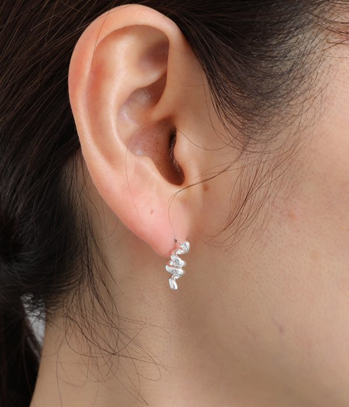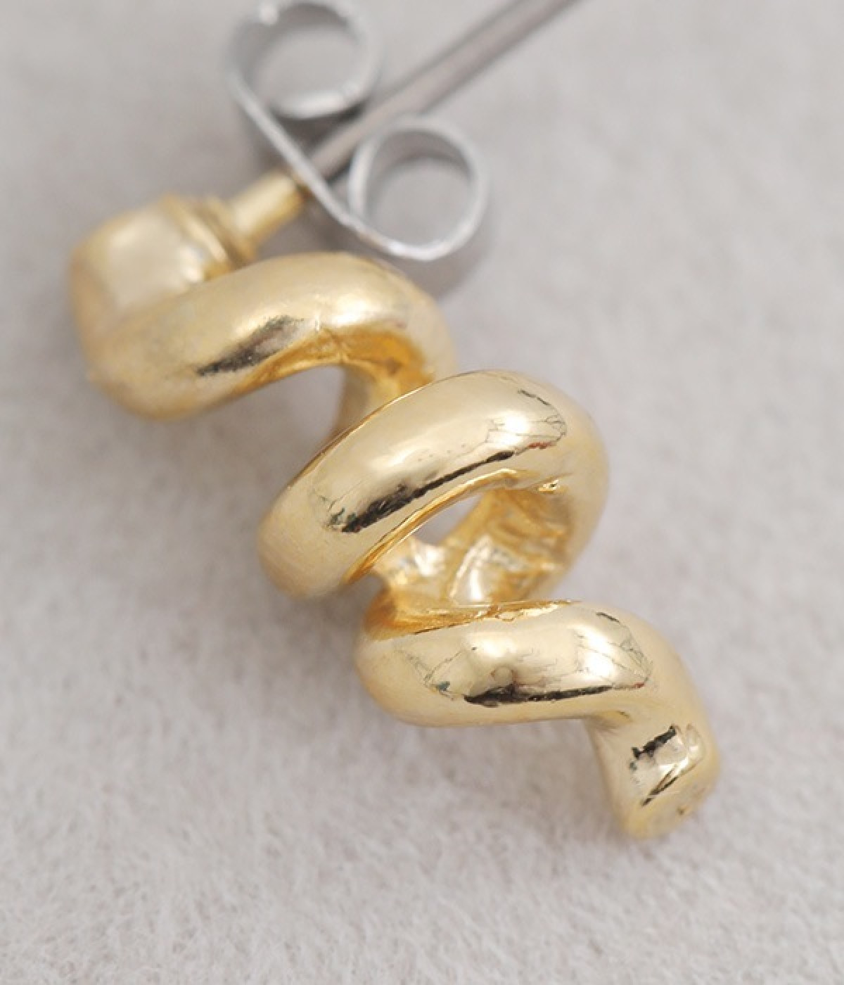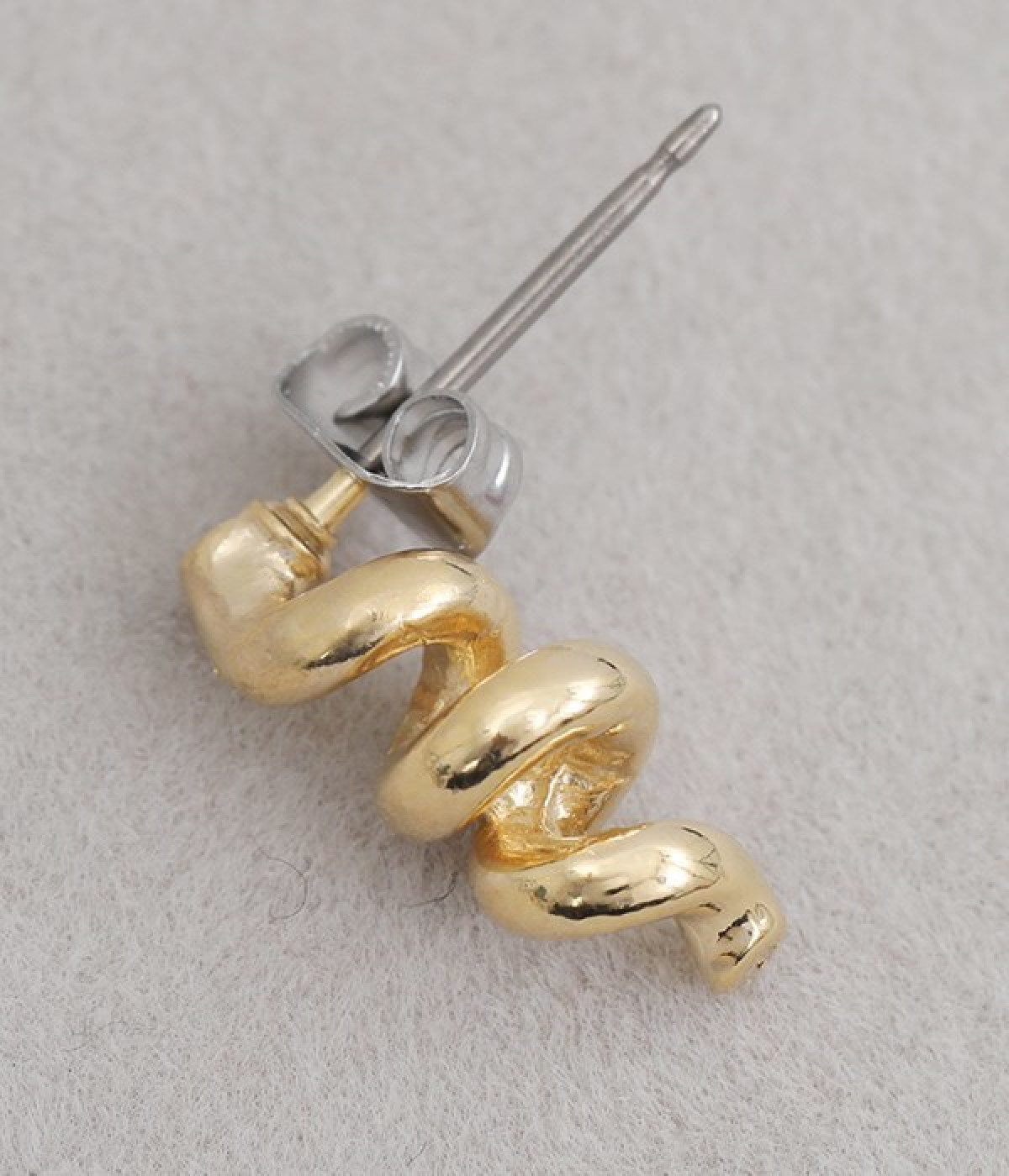 くるくるとねじれたフォルムがかわいらしいピアスです。小ぶりなサイズ感で、耳元でさりげなく存在感を発揮します。ビジューやパールなどのパーツがないシンプルさが魅力で、カジュアルからきれいめまで幅広い着こなしに馴染みます。ポスト部分はチタン、キャッチはニッケルフリーを採用した、毎日身につけたくなるアクセサリーです。