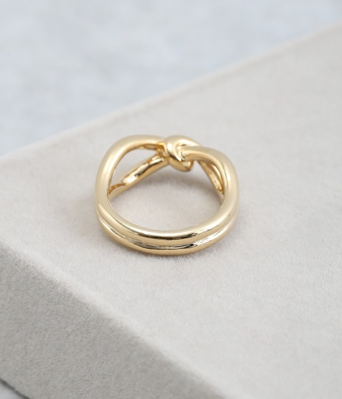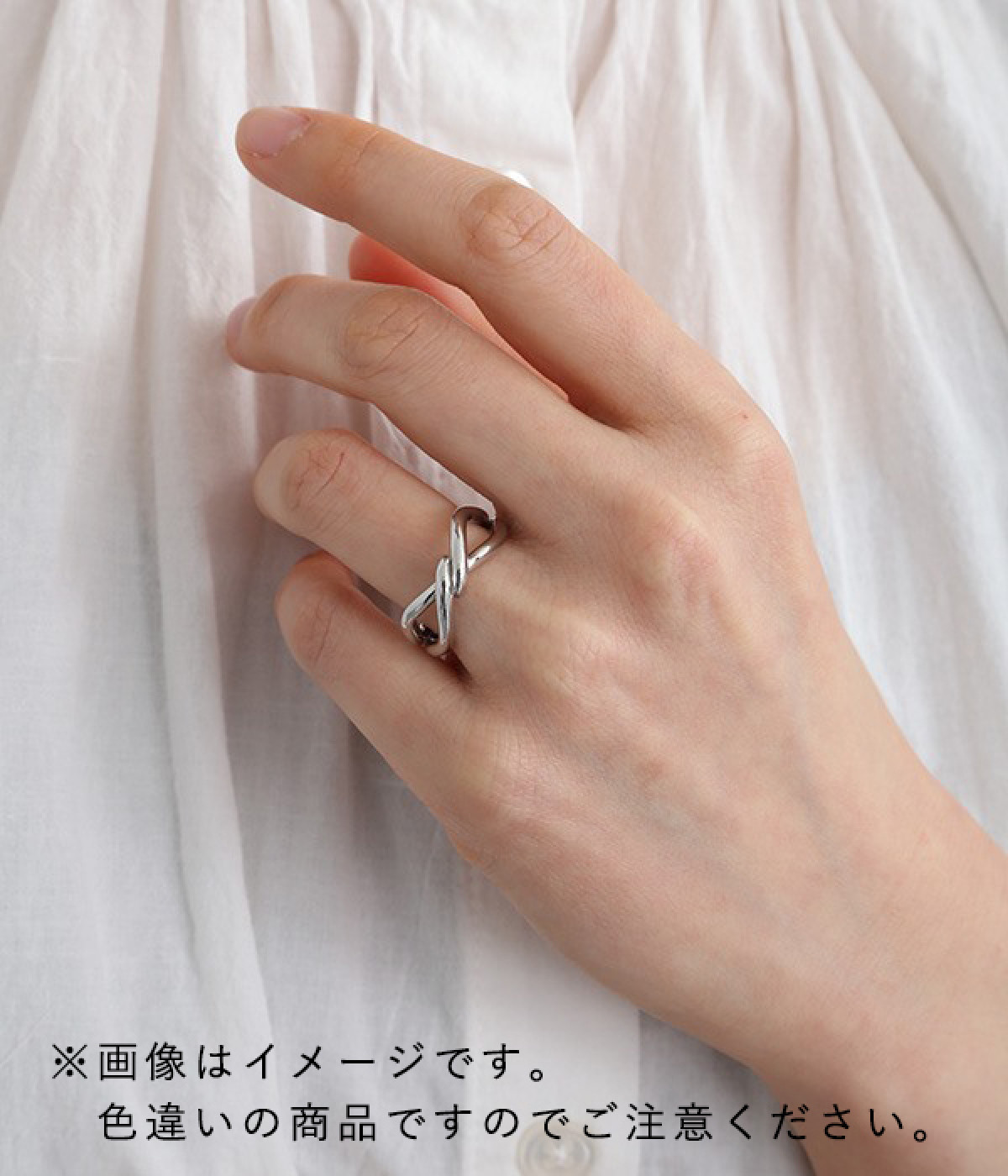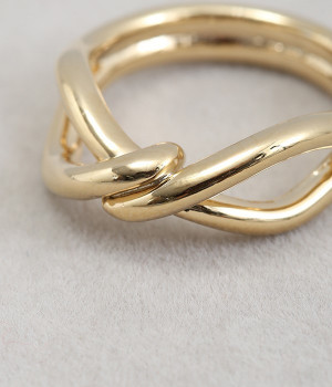 ウェーブのような動きをつけたフォルムが印象に残るリング。なんだか縁起のよさそうな結び目が交差したラインデザインが特徴です。カーブが多いフォルムのため、メタルカラーの反射がより強くなり存在感を増しています。ちょっと物足りないシンプルな装いのワンポイント使いにもどうぞ。