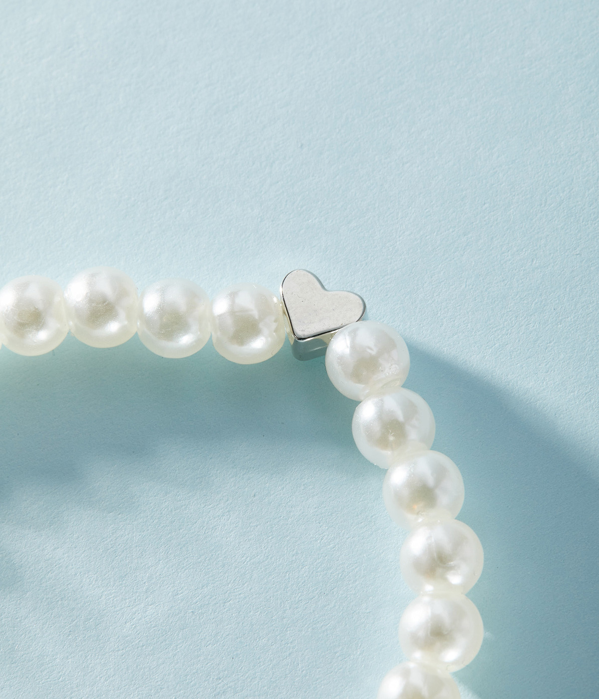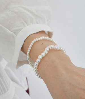 合金のハートモチーフがアクセントになる大きめパールと、シンプルな小さめパールのブレスレットの2本セット。重ねて手首に身につけるのはもちろん、お手持ちのバングルなどと組み合わせて使うことも◎。