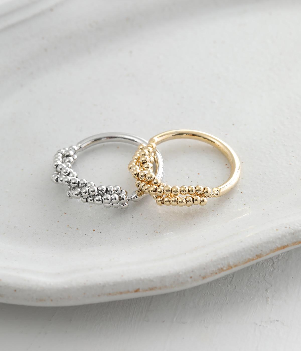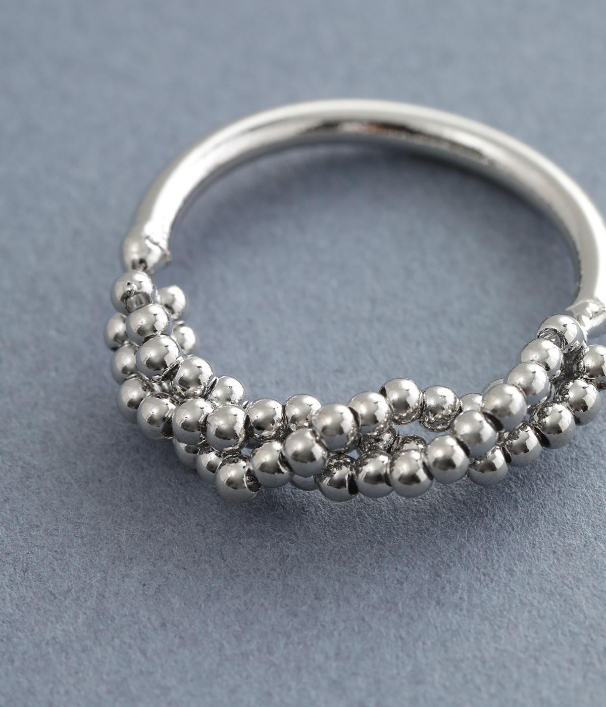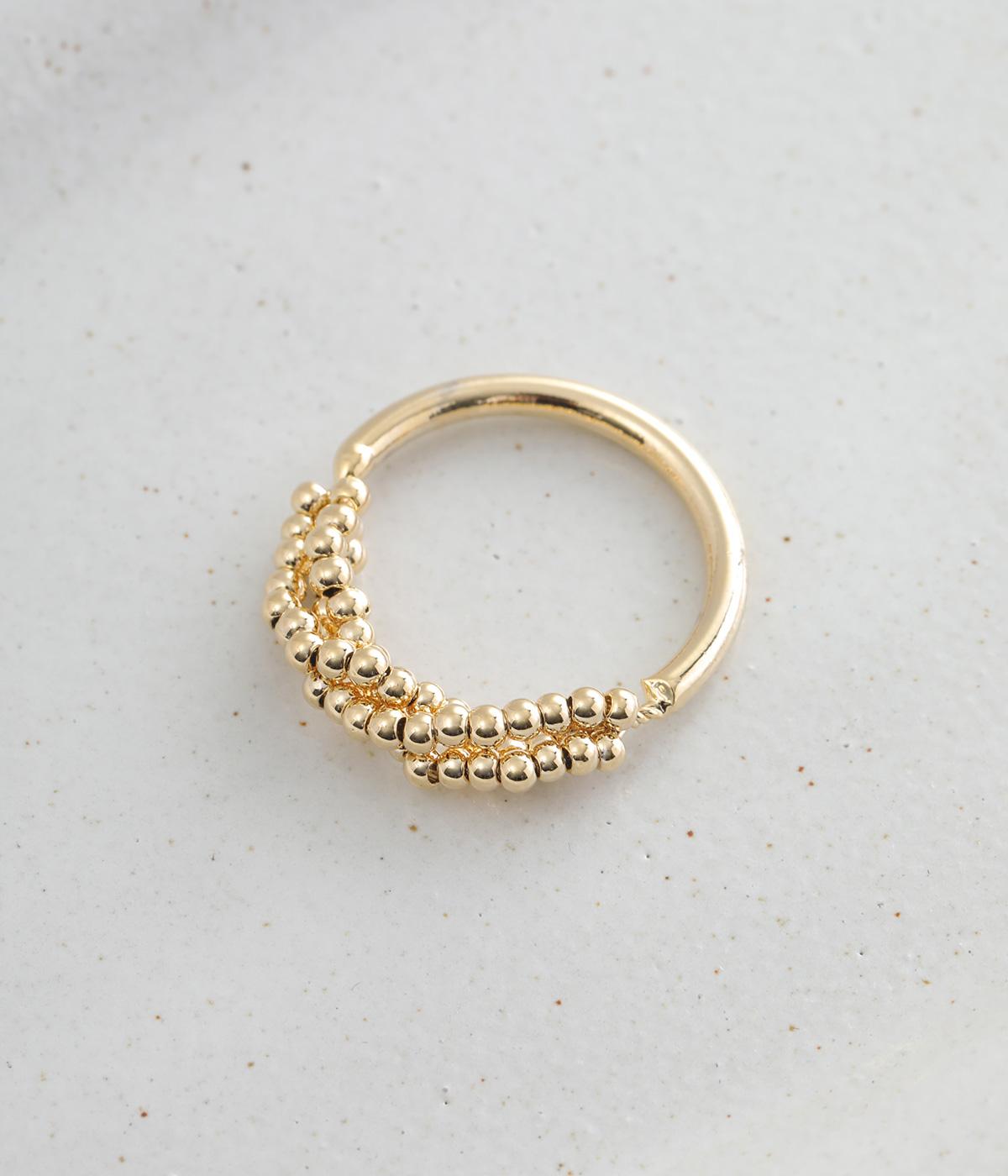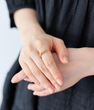 とても小さなメタルボールをふんだんにあしらった、繊細な輝きを放つリングです。ボリュームをおさえ上品で大人っぽく仕上げているので、普段使いにもフォーマルシーンにもぴったり。シンプルなリングとの重ねづけもサマになります。
