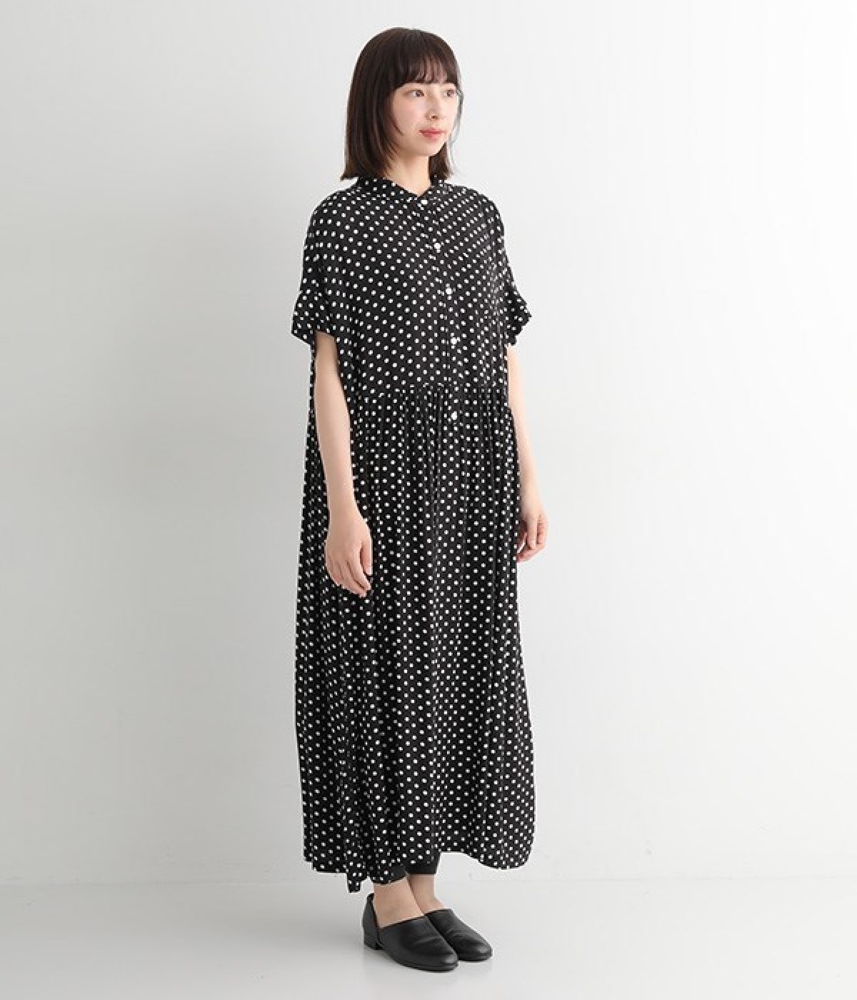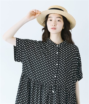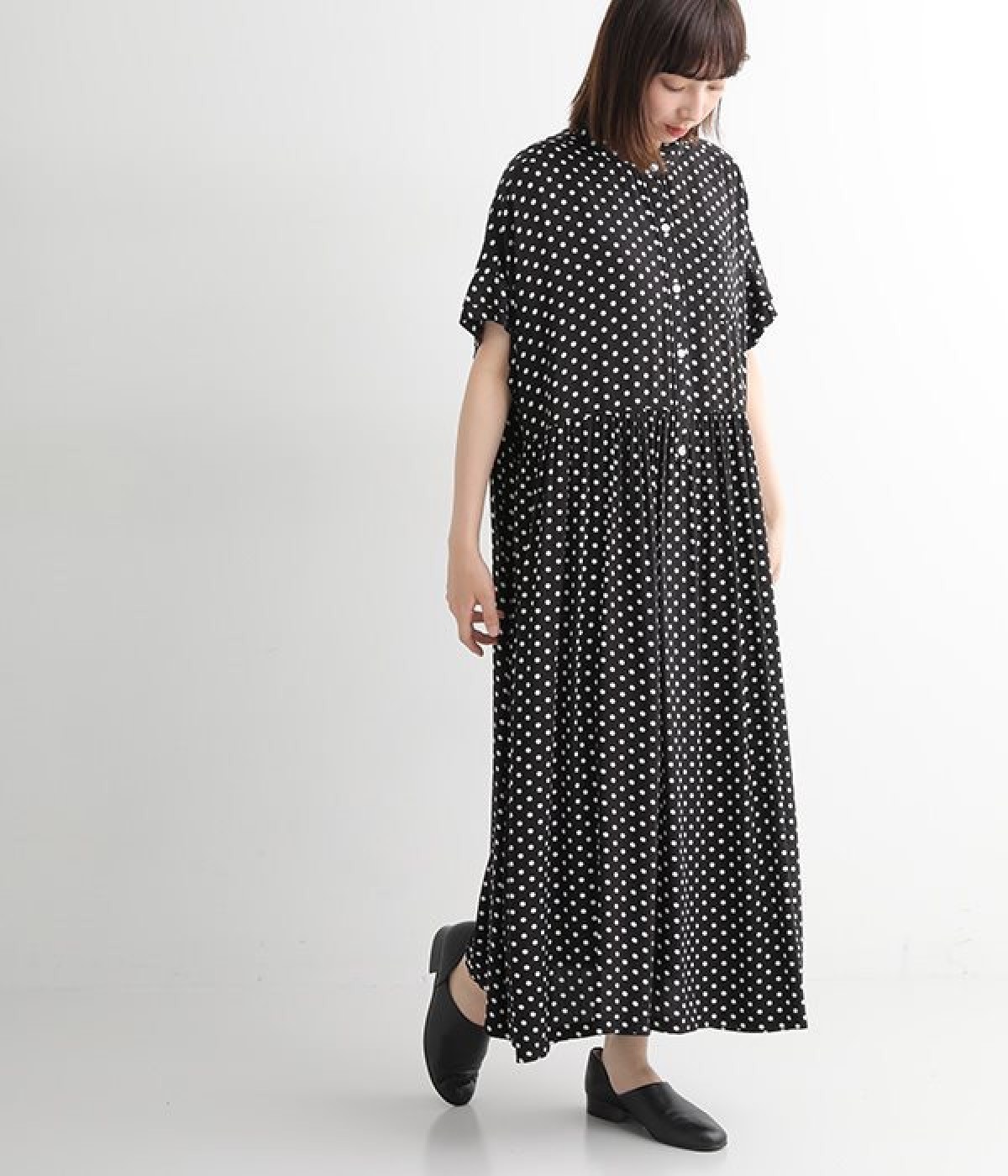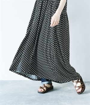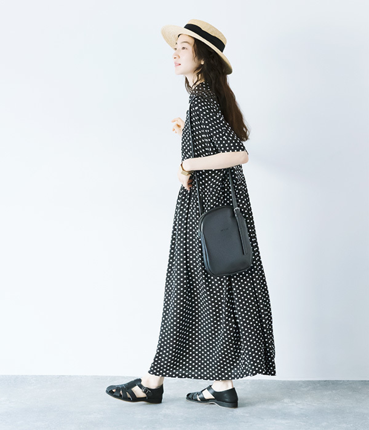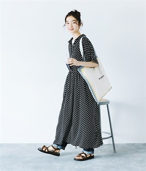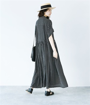 凛とした印象のブラックは、一枚でさらりと着こなして。小物もブラックで揃えれば、ドット柄が引き立つ、大人っぽいコーディネートに。