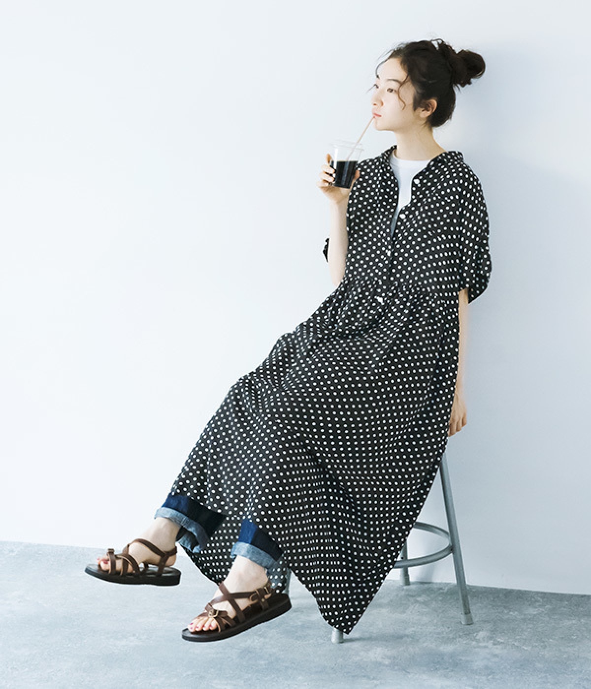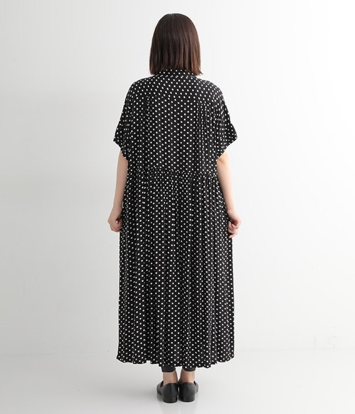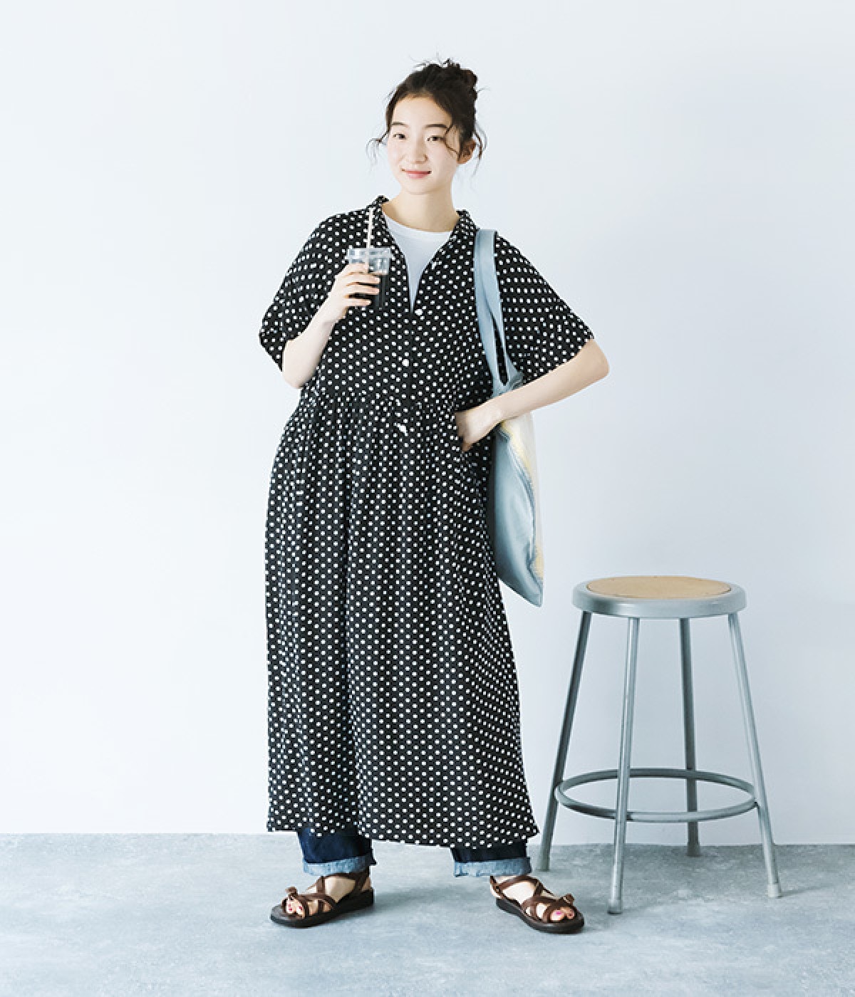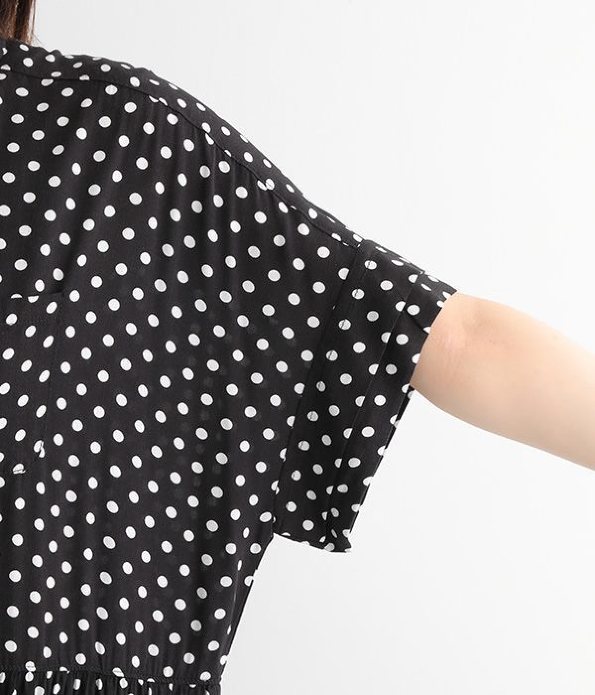凛とした印象のブラックは、一枚でさらりと着こなして。小物もブラックで揃えれば、ドット柄が引き立つ、大人っぽいコーディネートに。