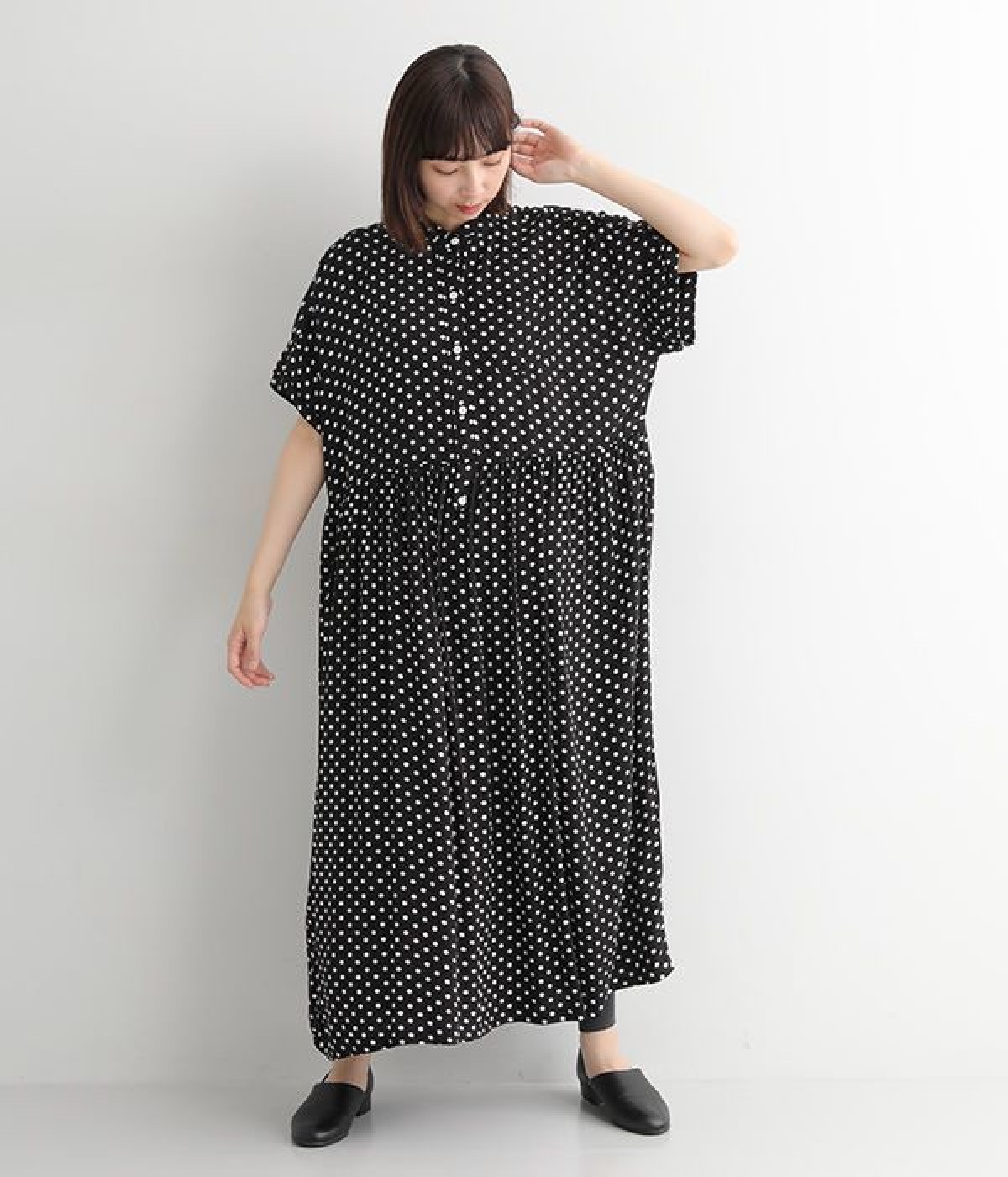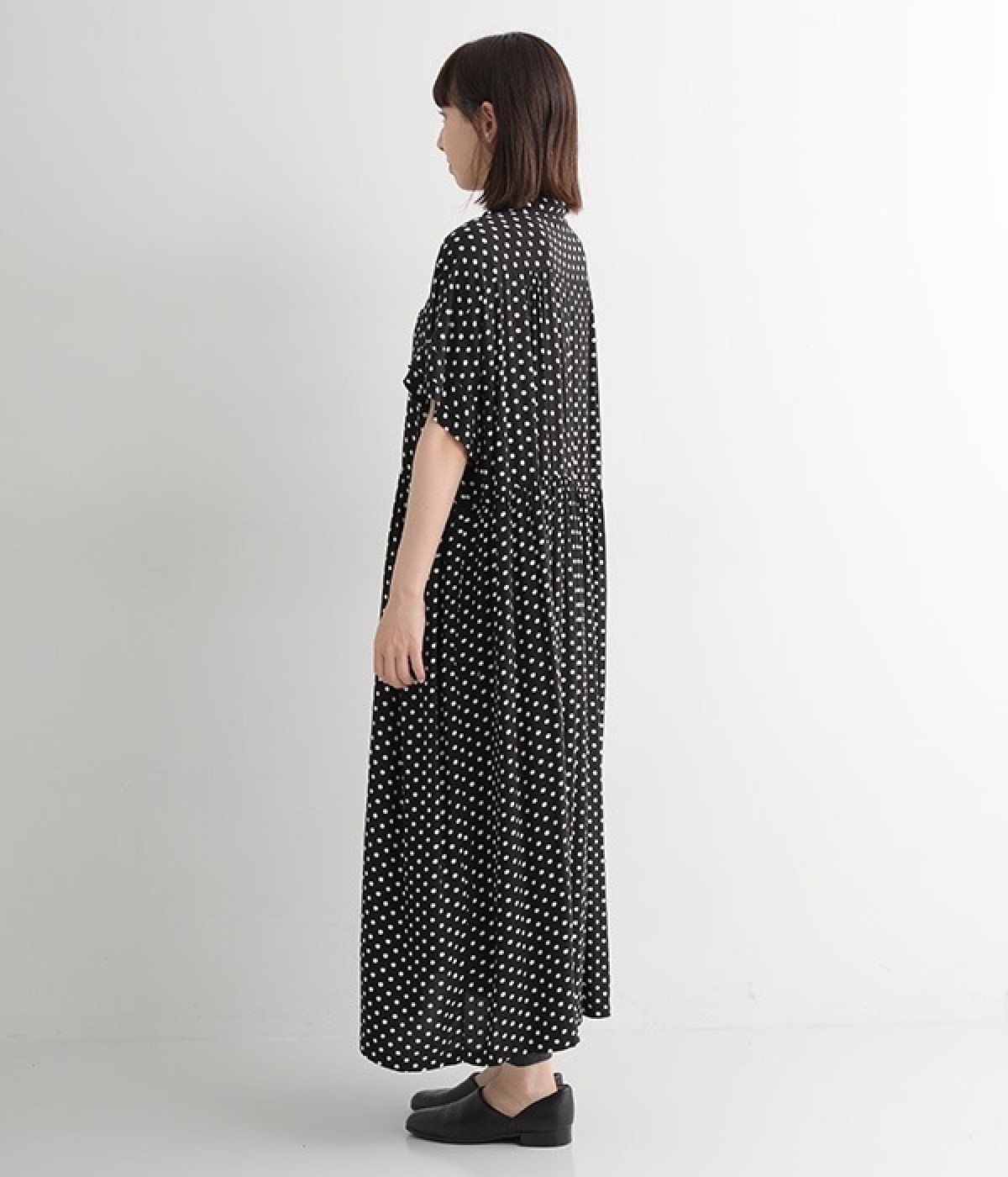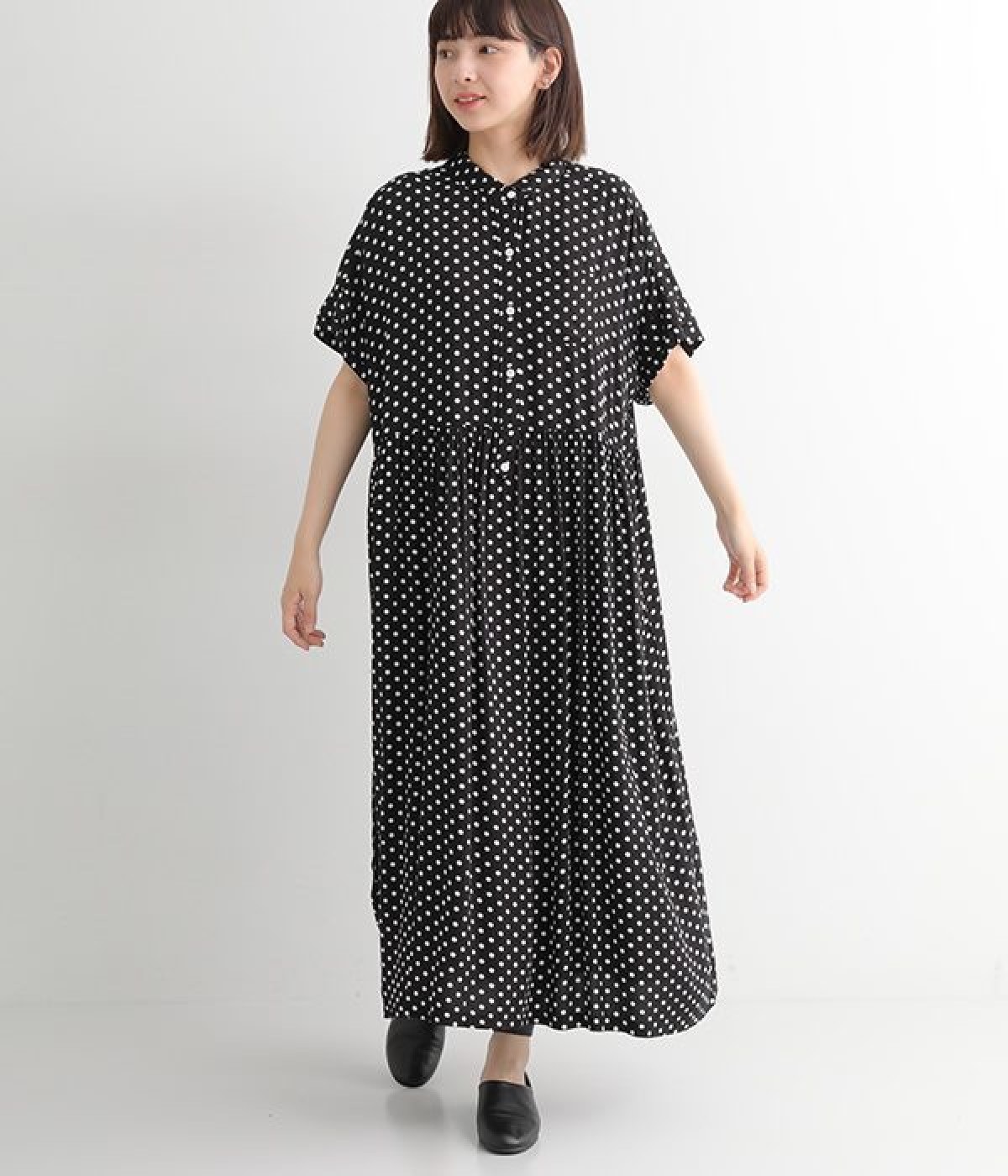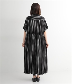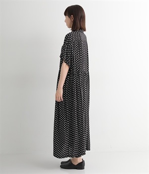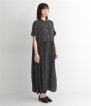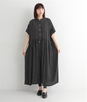 小さめのドット柄プリントが全面に施された、かぶりのワンピースです。生地をたっぷりと使用したリラクシーなサイズ感で、ウエストの程よいギャザーと小さな襟がひとさじのかわいらしさをプラス。