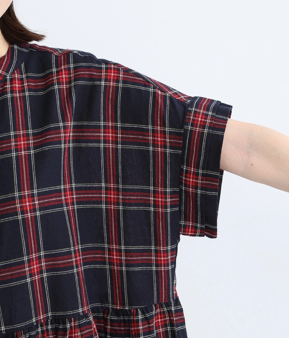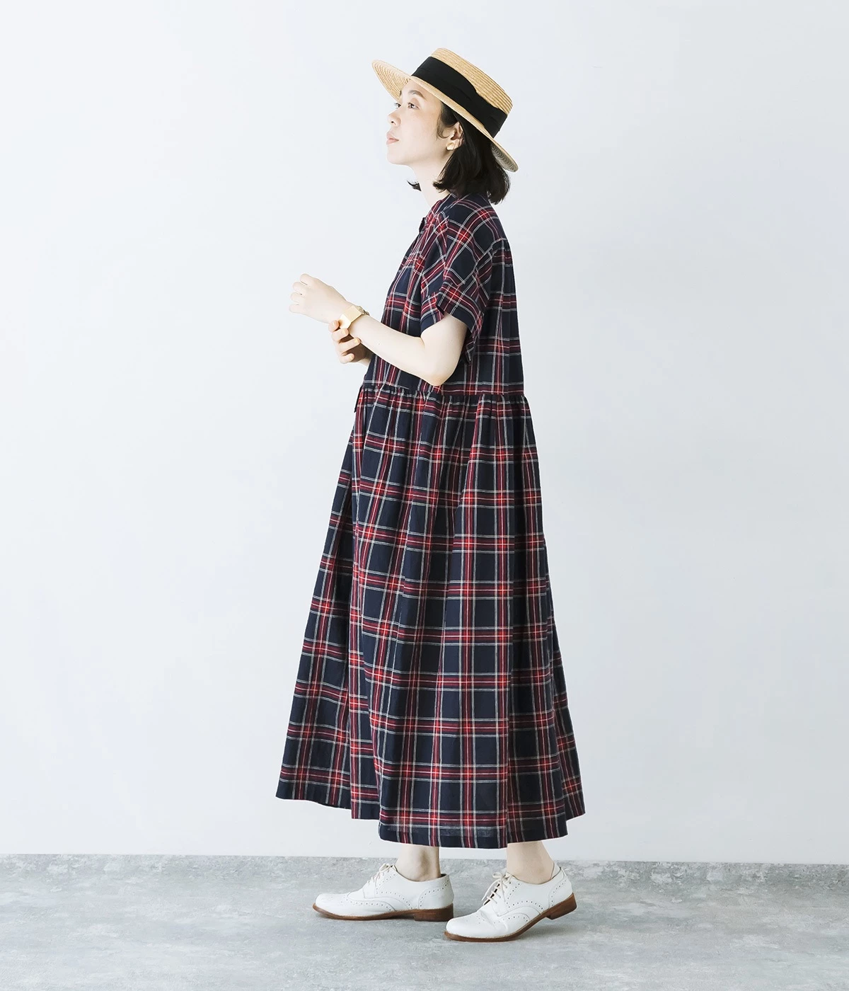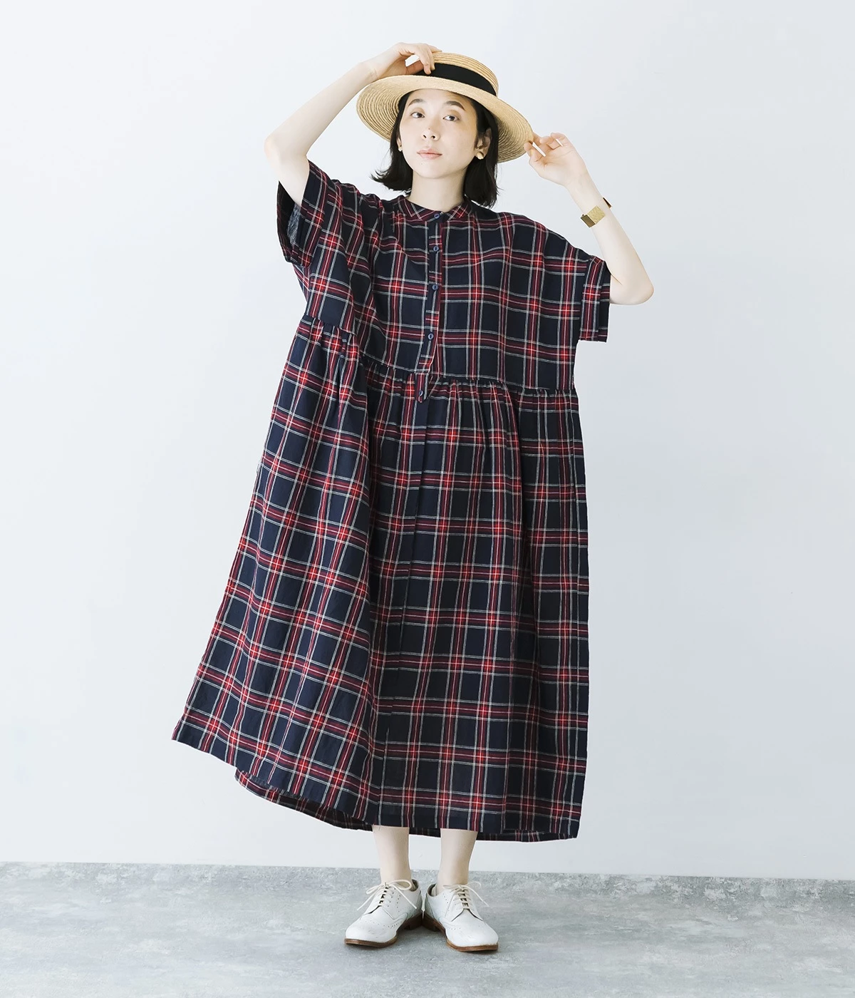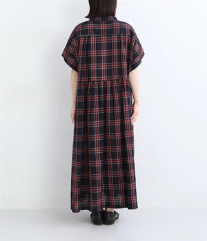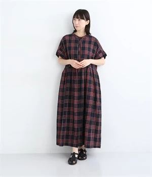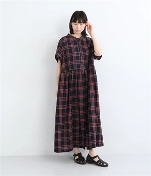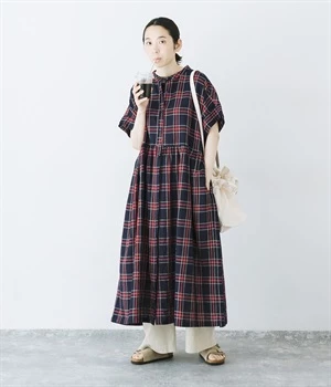 絶妙な個性が光るチェック柄ワンピース。リラックス感のあるゆったりとしたシルエットに、ウエストギャザーでメリハリをつけバランスのいいスタイルをつくります。