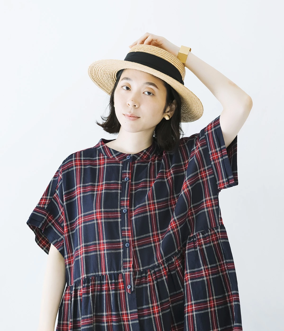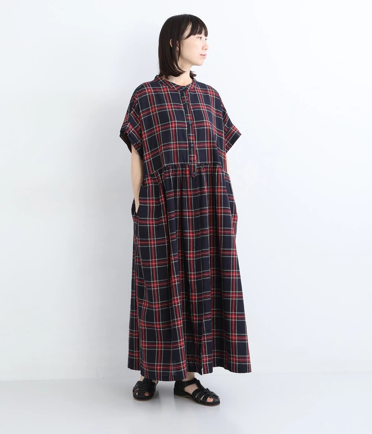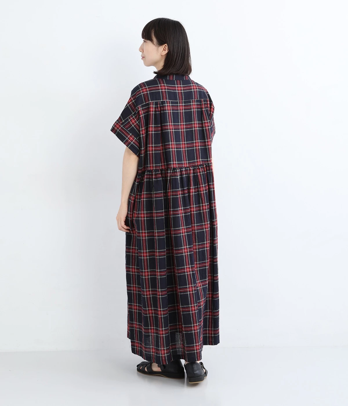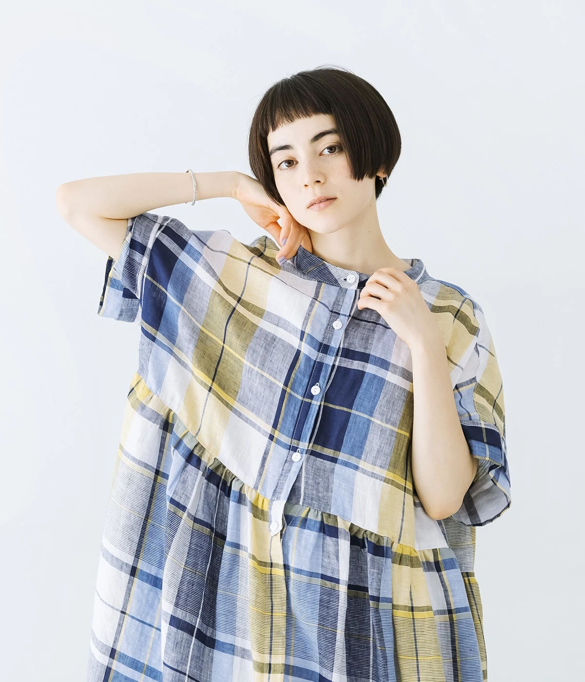 絶妙な個性が光るチェック柄ワンピース。リラックス感のあるゆったりとしたシルエットに、ウエストギャザーでメリハリをつけバランスのいいスタイルをつくります。
