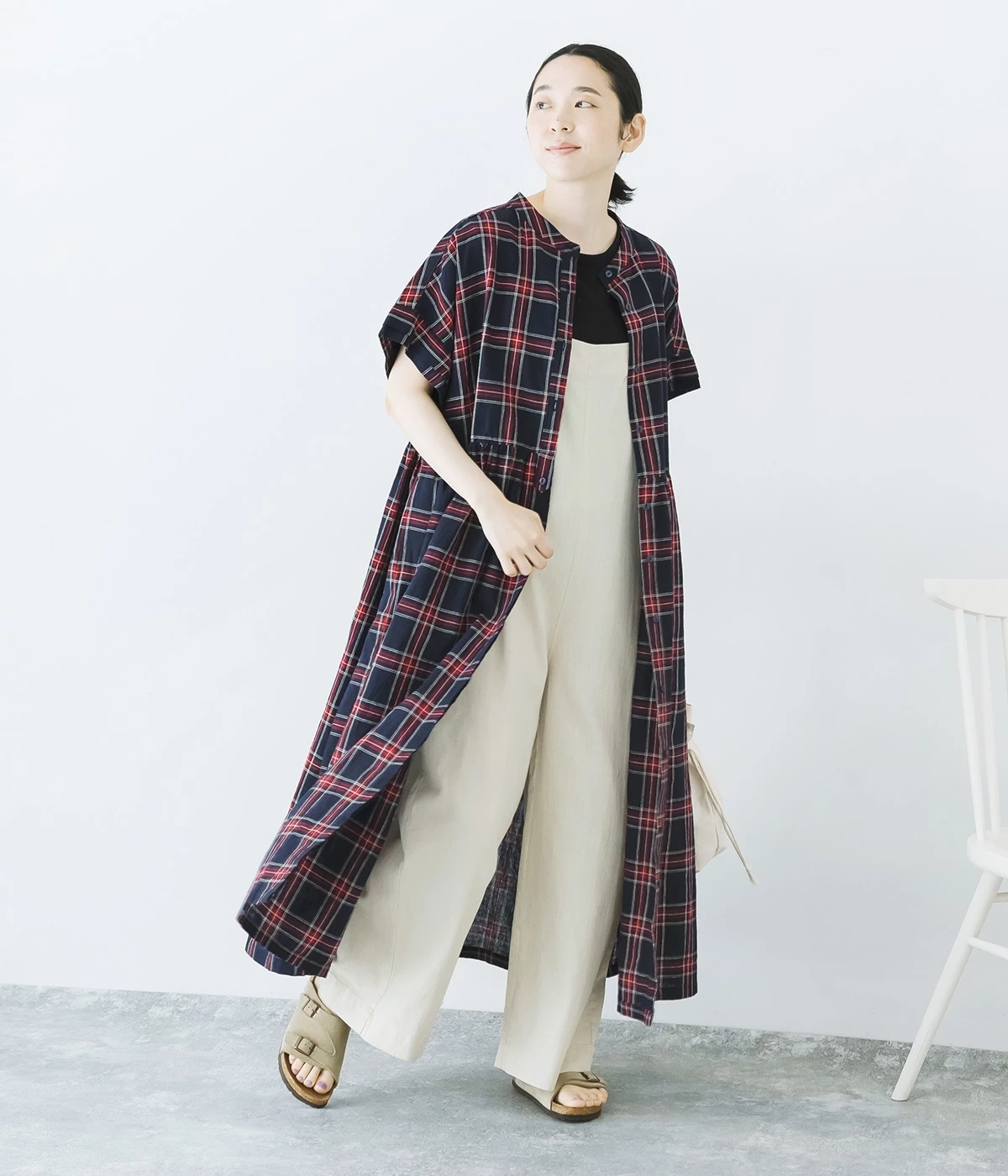 サロペットを合わせて、程よくカジュアルな装いにまとめました。襟元のボタンを外せば抜け感が加わり、リラックスした雰囲気が楽しめます。