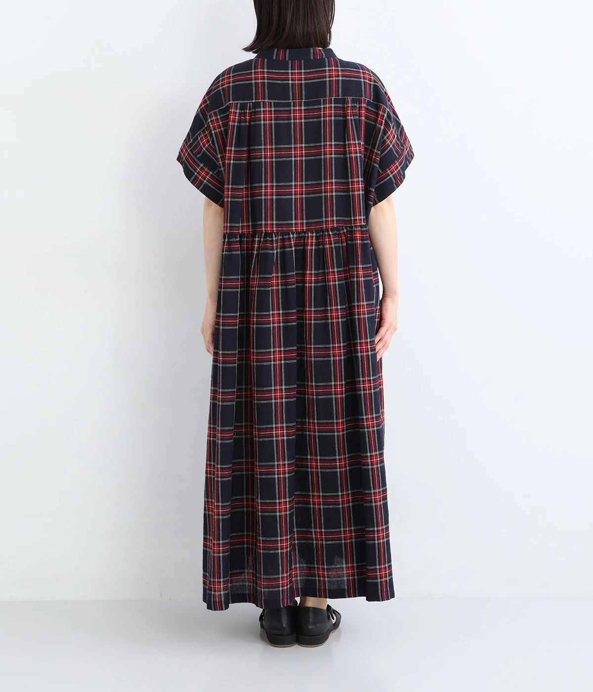 背中のギャザーが、さりげなく華やぎを添えるポイントに。襟元はバンドカラーで、すっきりと上品な印象にまとめました。