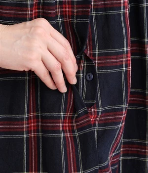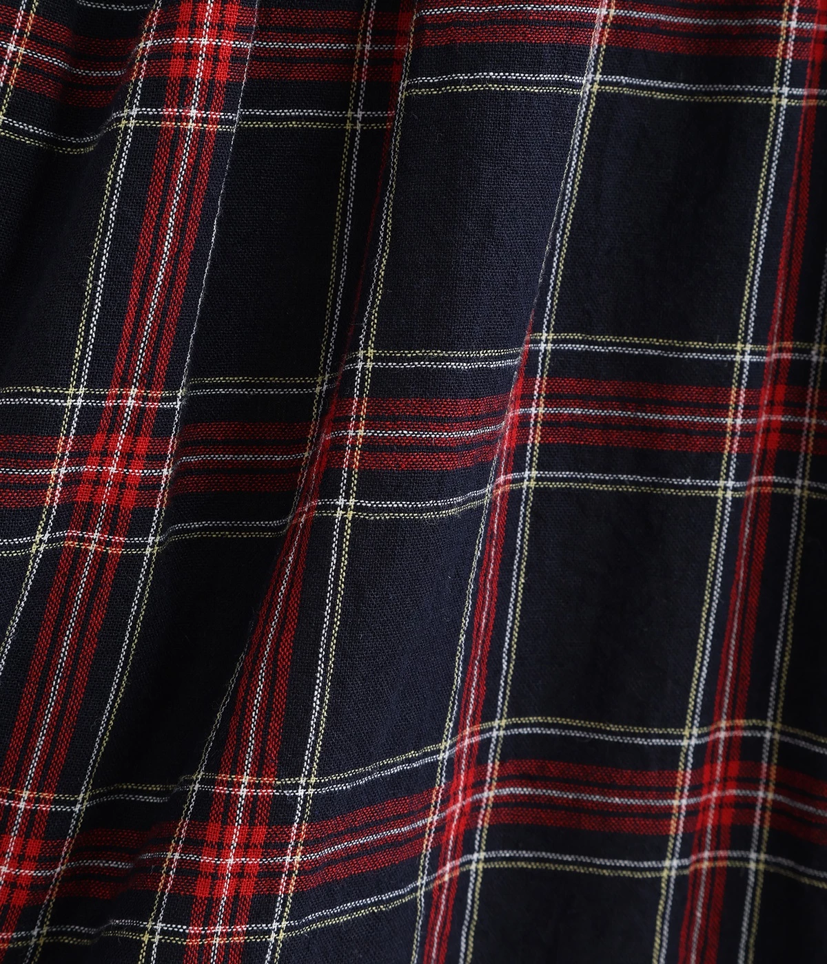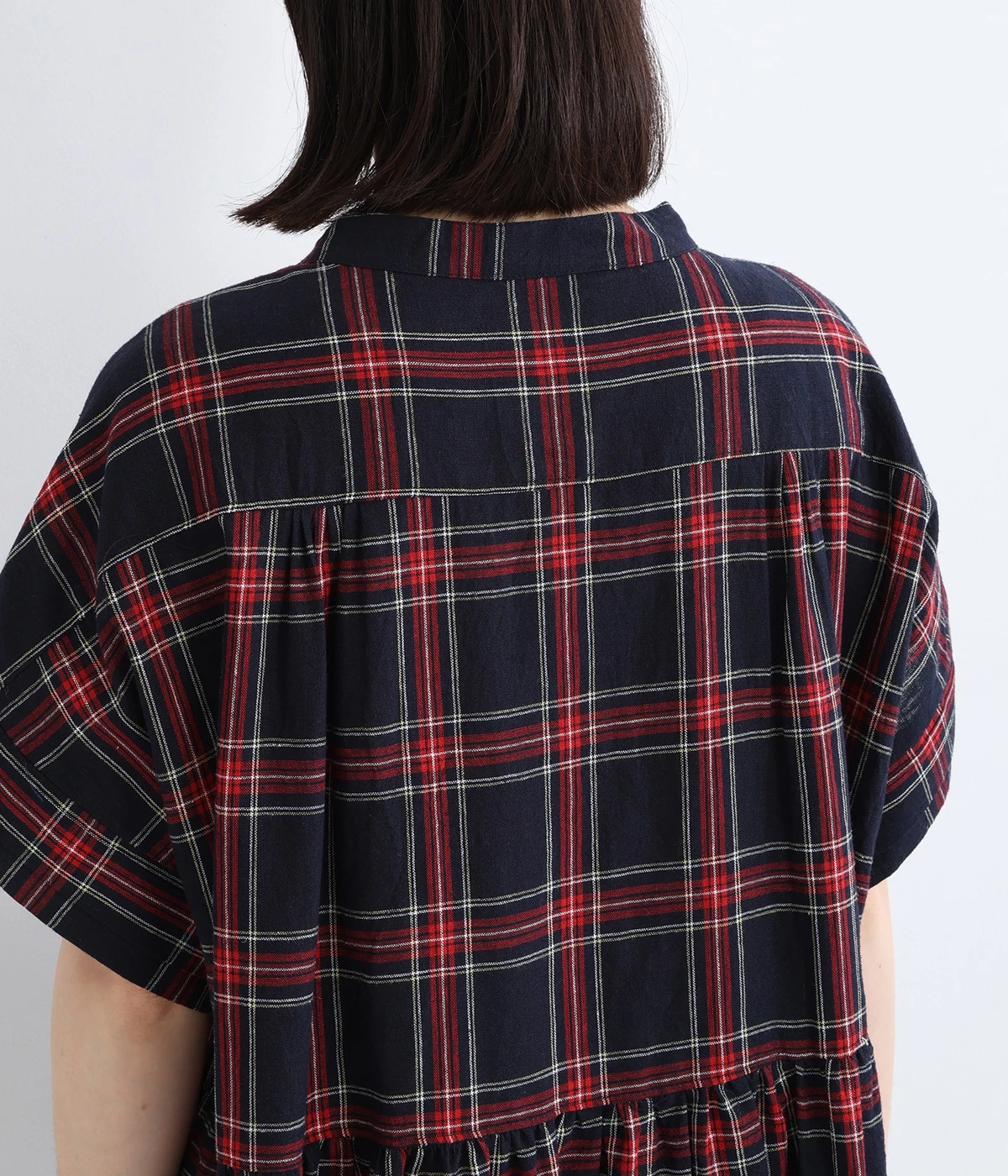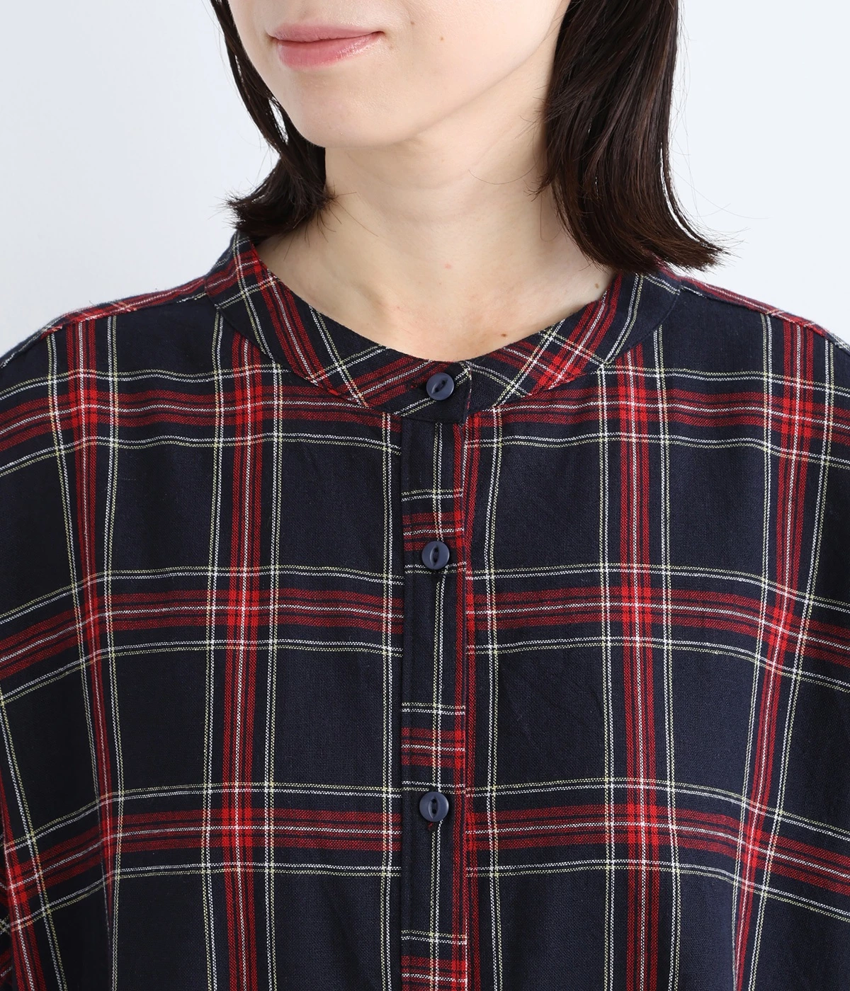 シックなネイビーに、鮮やかなレッドでアクセントを効かせたチェック柄。さっと着るだけでコーディネートが完成するため、重ね着いらずで汗ばむ季節にぴったりなアイテムです。