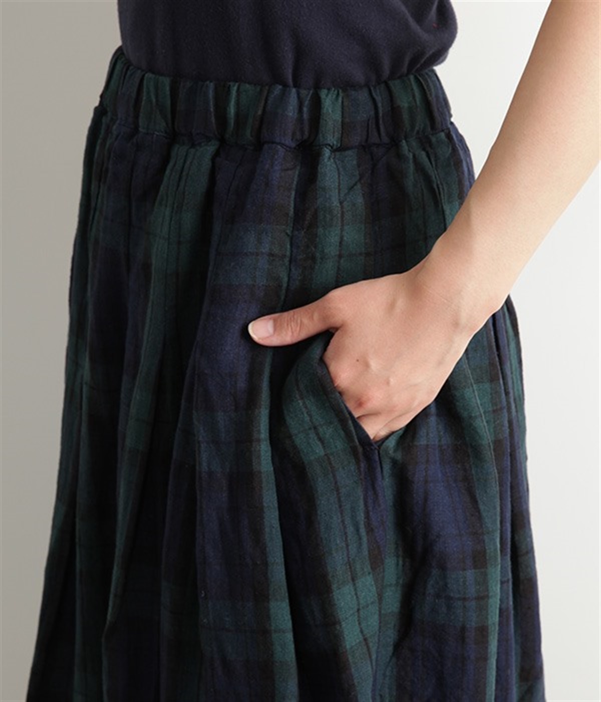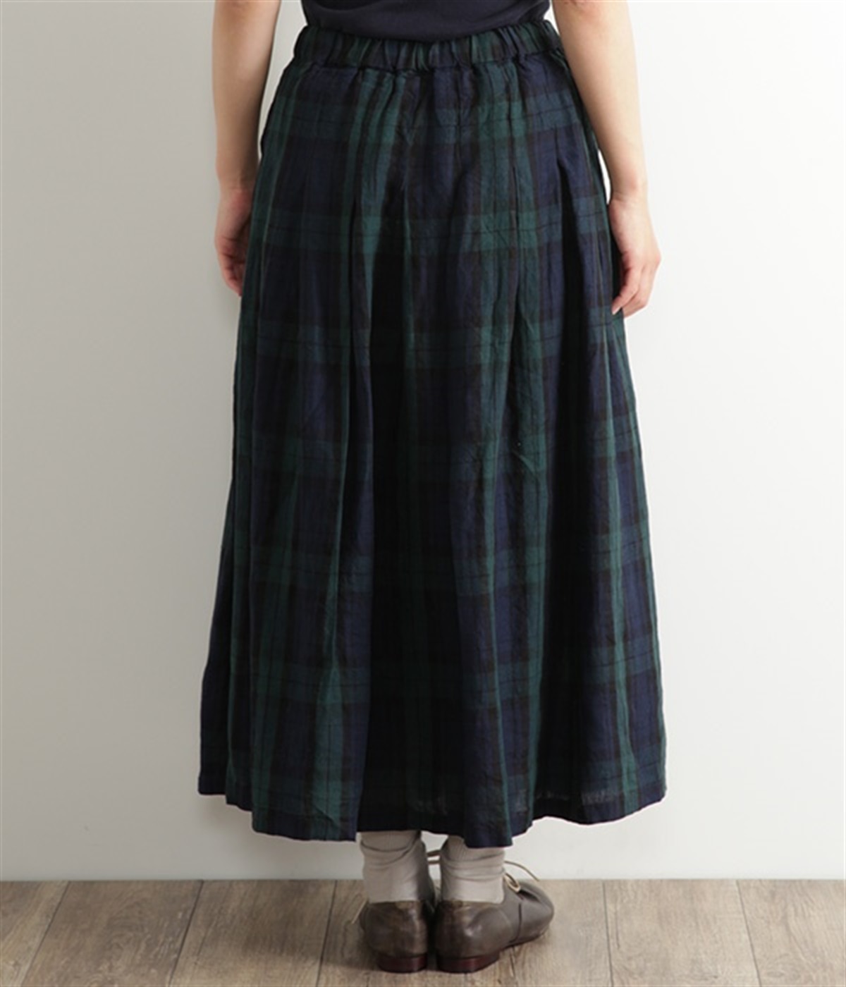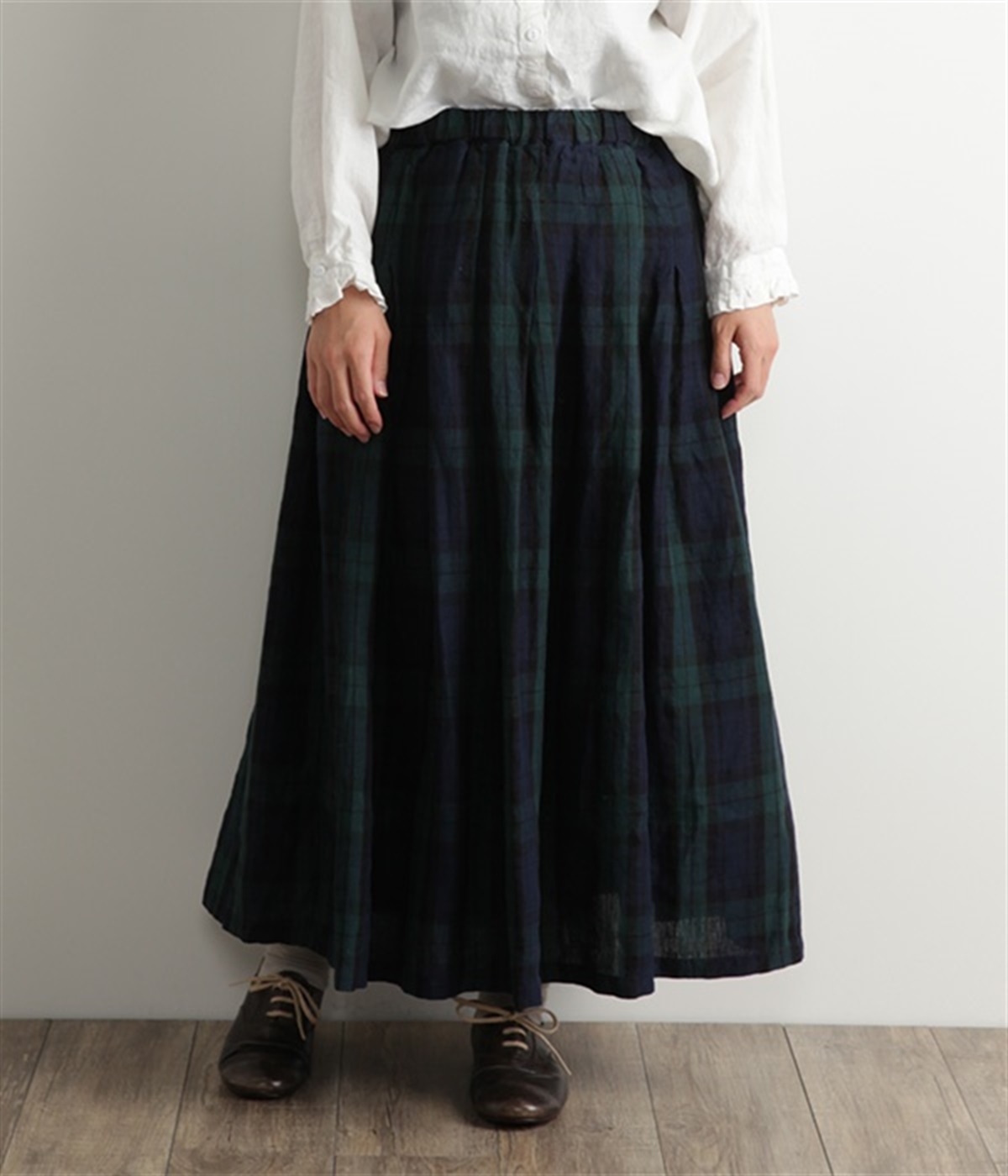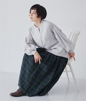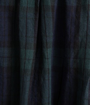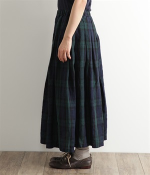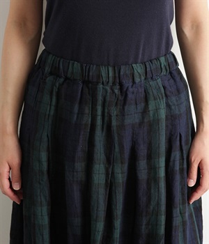 英国風のチェック柄が、クラシカルな雰囲気のスカートです。リネン特有のシャリ感と、くたっとしたナチュラルな素材感を生かし、表情豊かな風合いに仕上がりました。ウエストからたっぷりとタックを入れて、適度なボリューム感のある女性らしいシルエットを作り出しています。ウエストは総ゴム仕様でリラックスしたはき心地。内側のヒモによってサイズ調節も可能です。両サイドにはポケット付き。