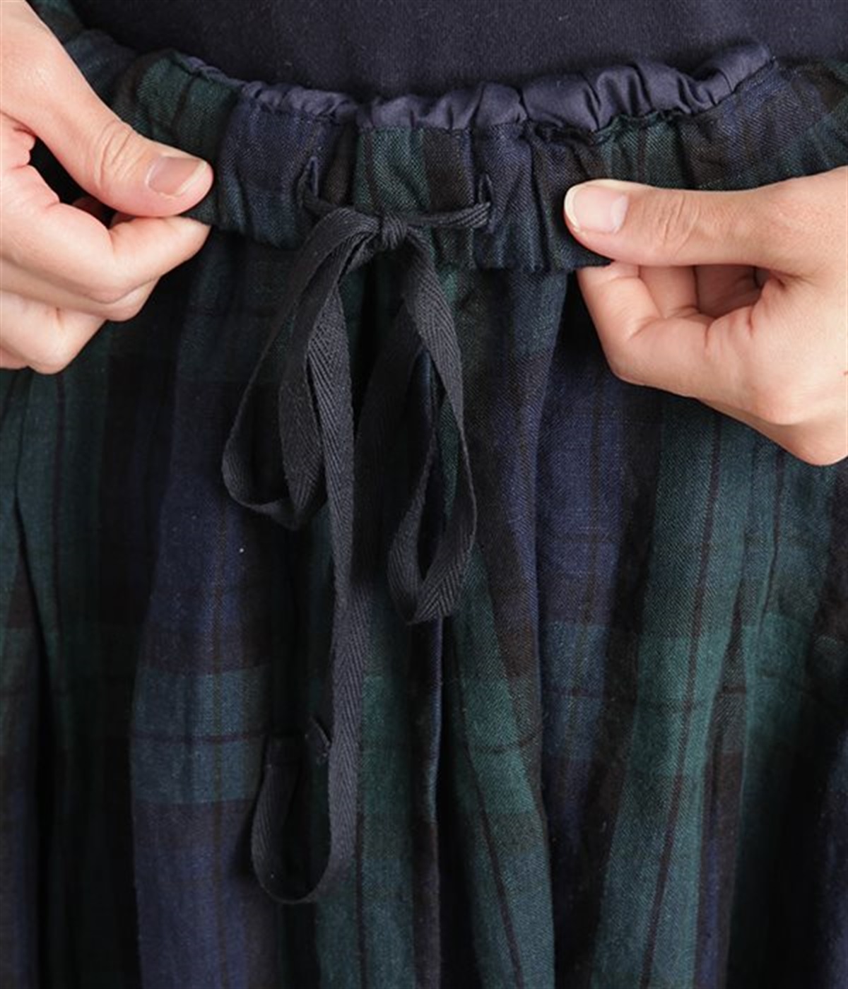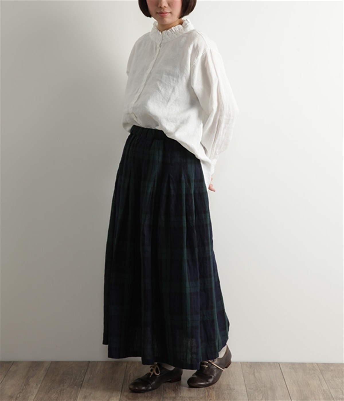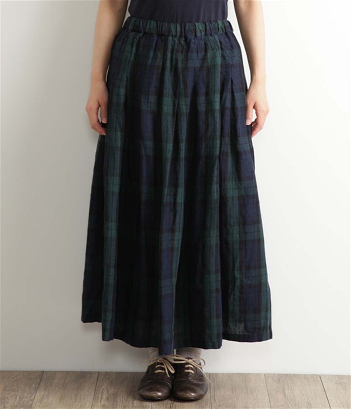 英国風のチェック柄が、クラシカルな雰囲気のスカートです。リネン特有のシャリ感と、くたっとしたナチュラルな素材感を生かし、表情豊かな風合いに仕上がりました。ウエストからたっぷりとタックを入れて、適度なボリューム感のある女性らしいシルエットを作り出しています。ウエストは総ゴム仕様でリラックスしたはき心地。内側のヒモによってサイズ調節も可能です。両サイドにはポケット付き。