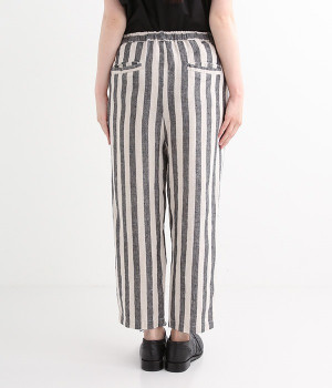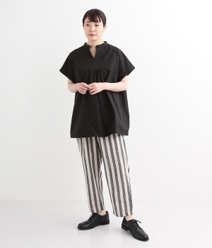 先染め特有の深い色合いが特徴的なリネンパンツです。ウエスト下にはタックを施すことでボリュームを抑え、立体感のあるつくりに仕上げました。足首周りがすっきりと見えるテーパードシルエットを採用し、ワンピースやチュニックなどのアンダーパンツとしてもおすすめな一枚。ほどよいゆとりを持った着心地で、大人のデイリースタイルにぴったりです。