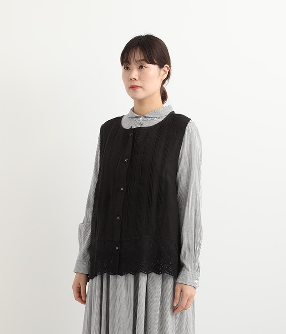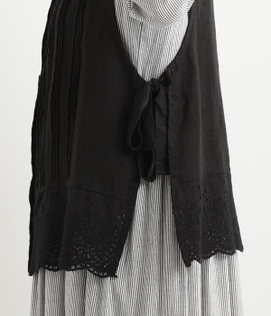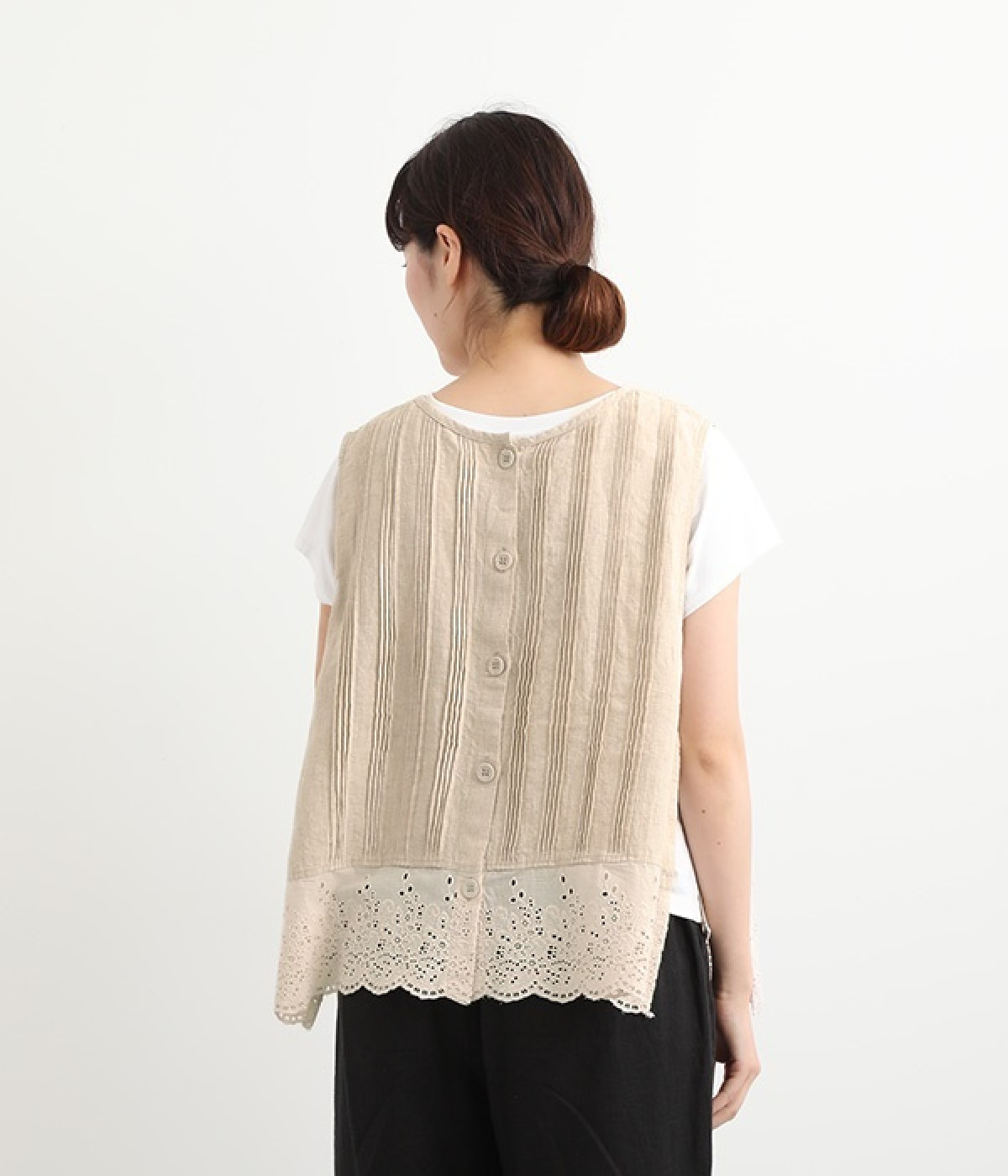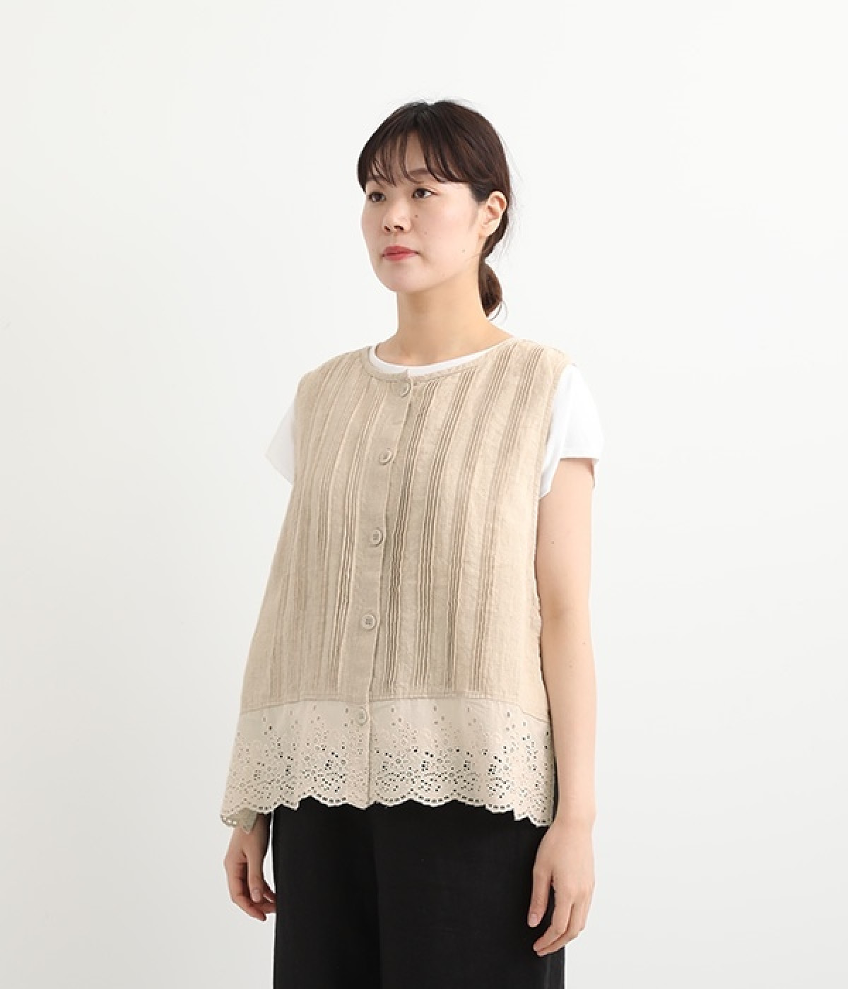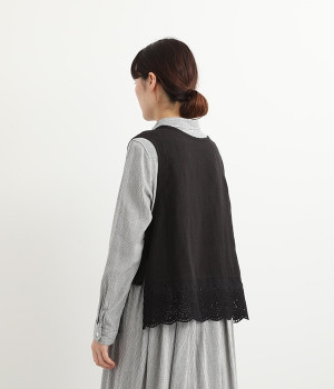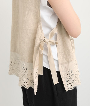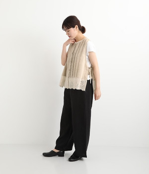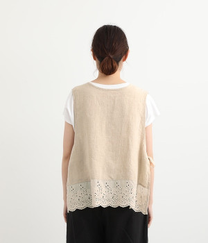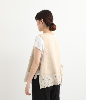 コーディネートを新鮮に仕上げてくれる、前後着用が可能な2wayベスト。ピンタックが施された華やかなデザインと、シンプルなプルオーバーデザインを気分に合わせて選べます。裾にあしらわれた刺繍レースは、いつものカジュアルスタイルに女性らしさをプラス。サイドはリボンを結ぶデザインになっていて、インナーとのバランスを楽しむことができます。