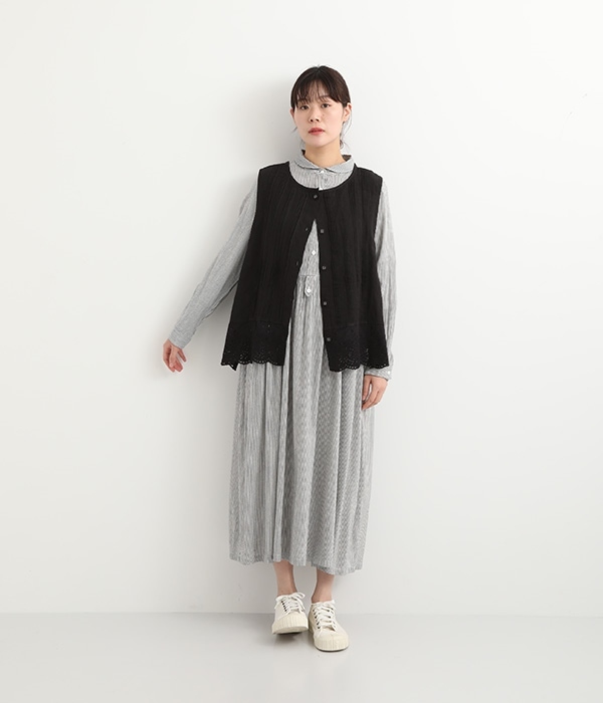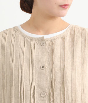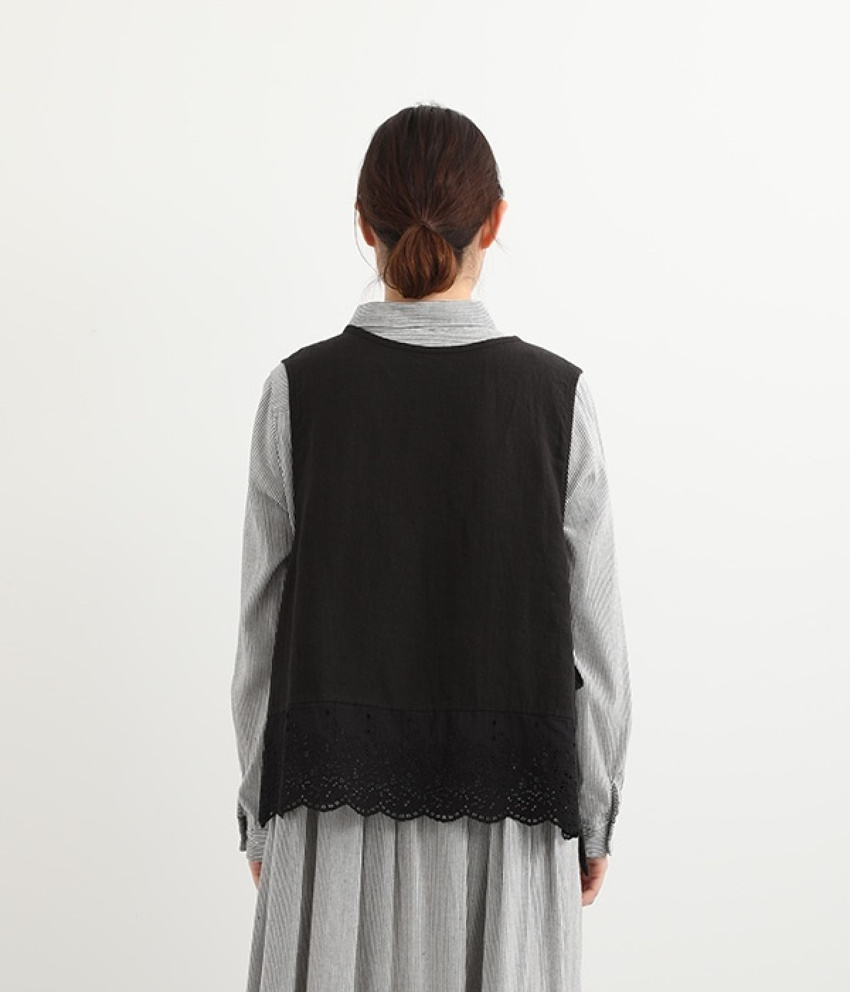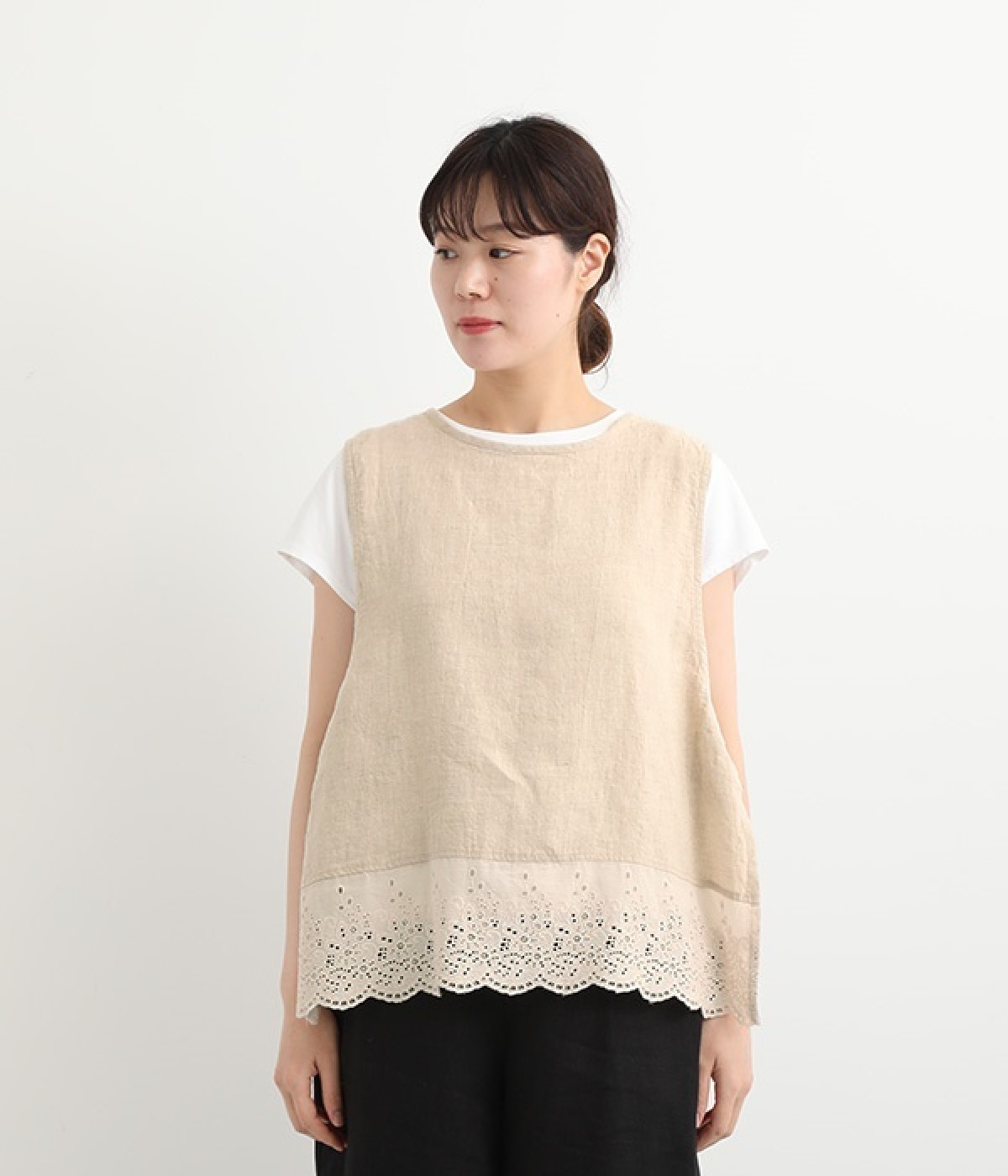 コーディネートを新鮮に仕上げてくれる、前後着用が可能な2wayベスト。ピンタックが施された華やかなデザインと、シンプルなプルオーバーデザインを気分に合わせて選べます。裾にあしらわれた刺繍レースは、いつものカジュアルスタイルに女性らしさをプラス。サイドはリボンを結ぶデザインになっていて、インナーとのバランスを楽しむことができます。