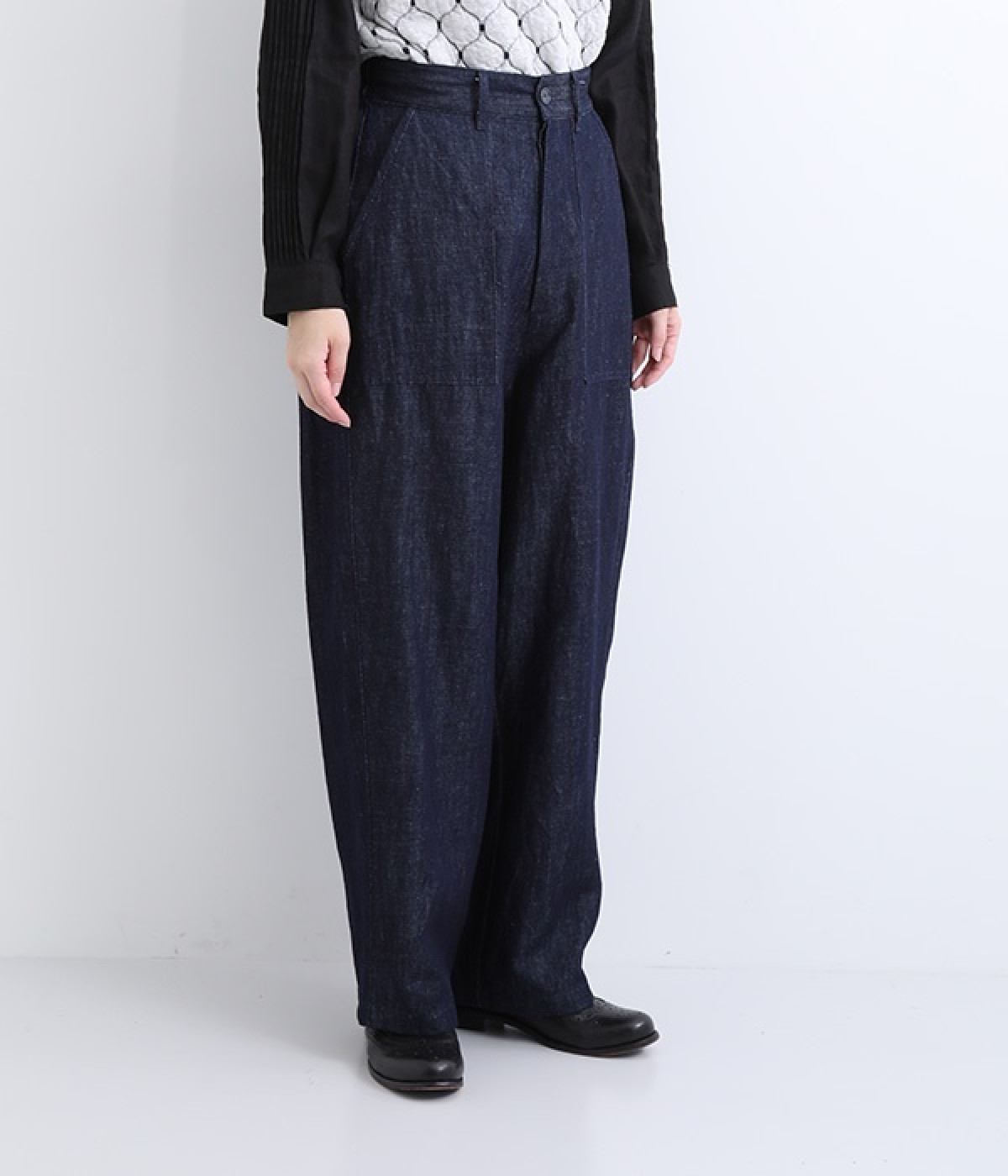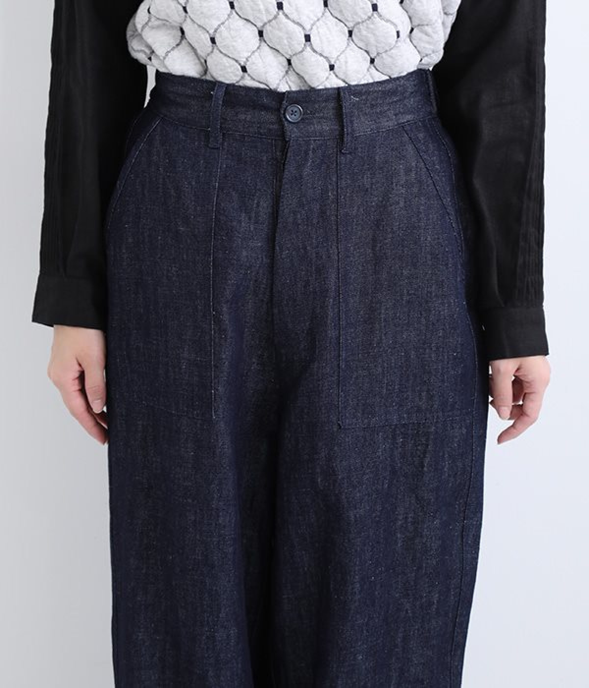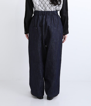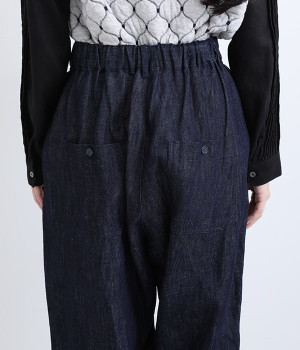 しっかりと丈夫なコットンリネンのデニム素材で仕立てたパンツです。ゆったりとしたシルエットがラフな雰囲気を醸し出し、大人のデイリーカジュアルに重宝する一本。フロントボタンと大きなポケットがポイントです。ウエストは後ろがゴム仕様のイージータイプで締めつけにくく、心地良く穿きこなせます。