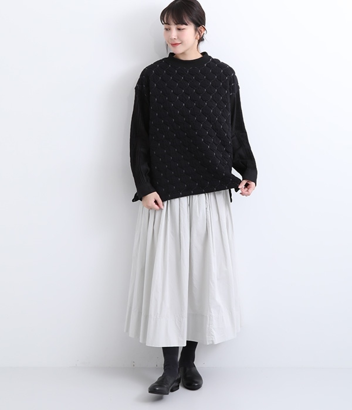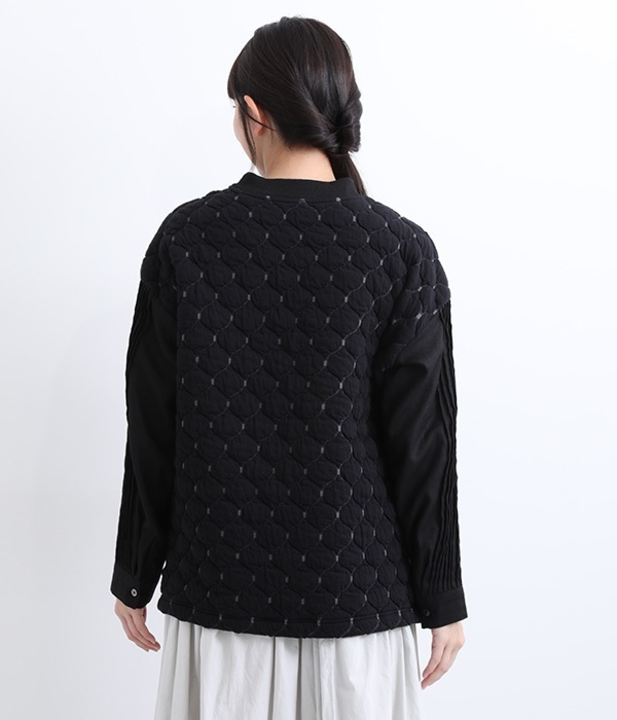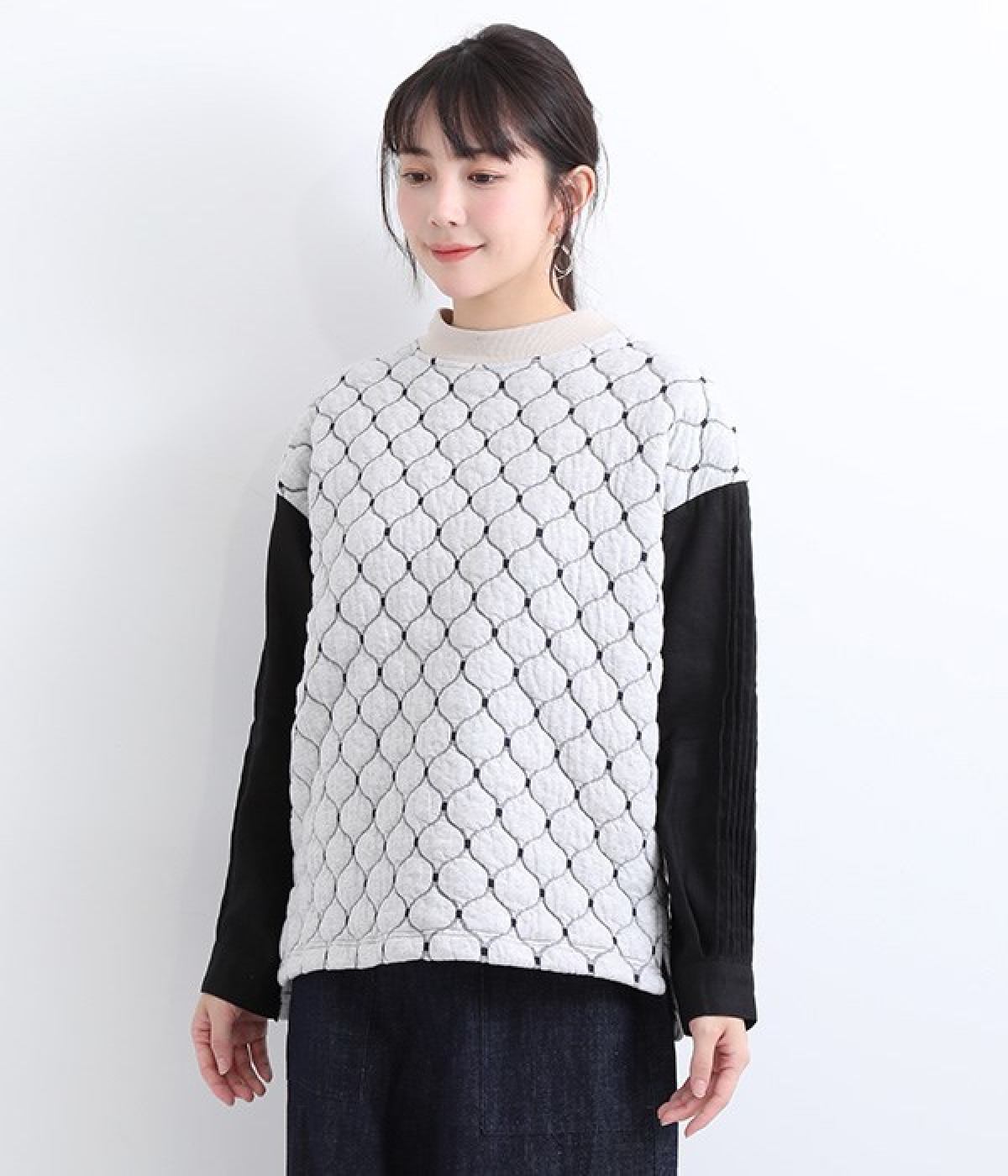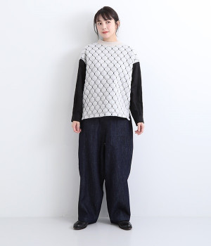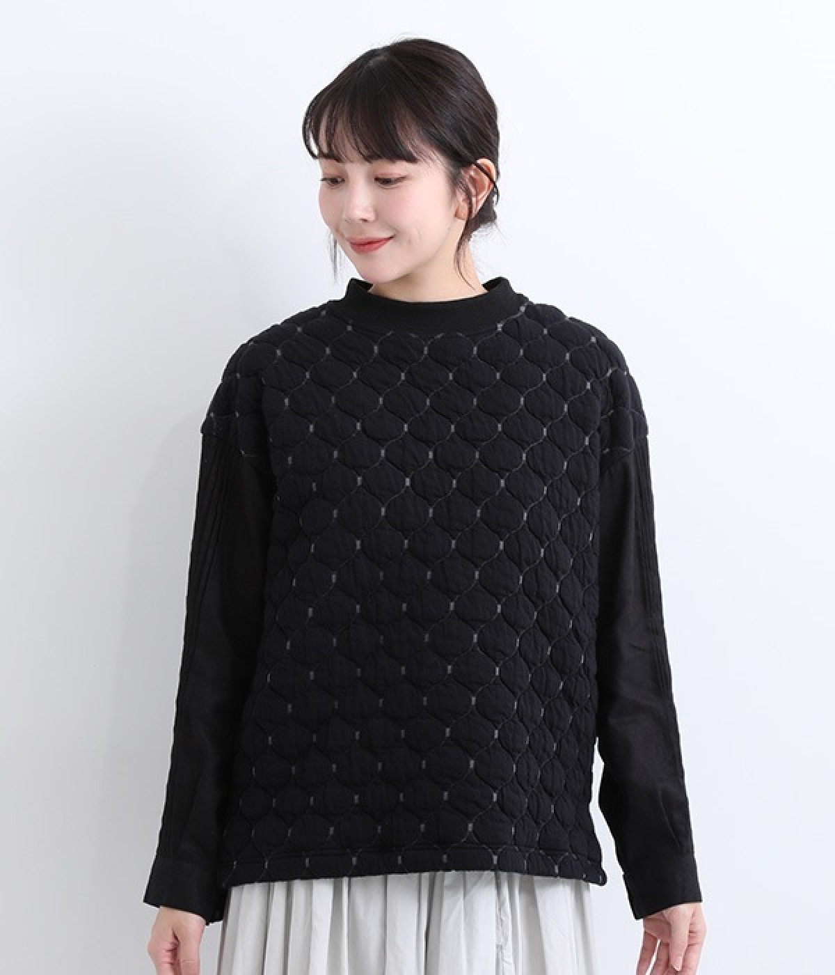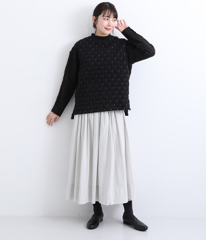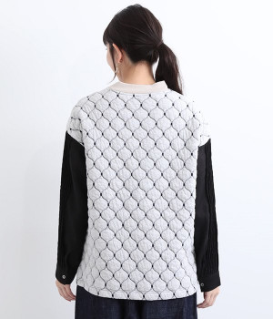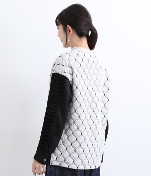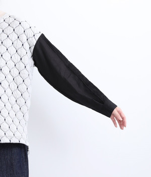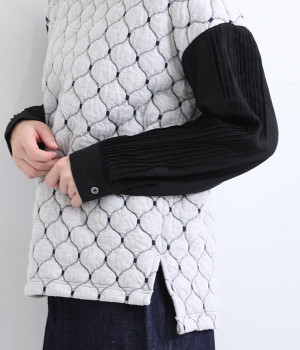 袋状になった柄がふっくらと浮き上がる「ブリスター編み」の生地を使用したプルオーバー。ピンタックをあしらったリネン素材で袖を切り替えた、レイヤード調のこだわりデザインがポイントです。ゆったりとした身幅のシルエットとドロップショルダーが抜け感もプラス。サイドスリットと前後差をつけた裾は、ボトムとのバランス調整も楽にできます。
