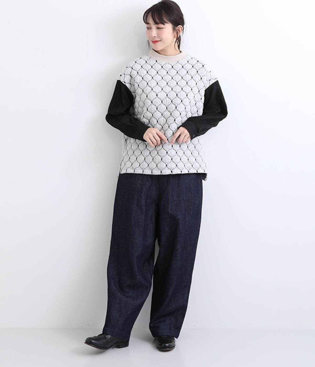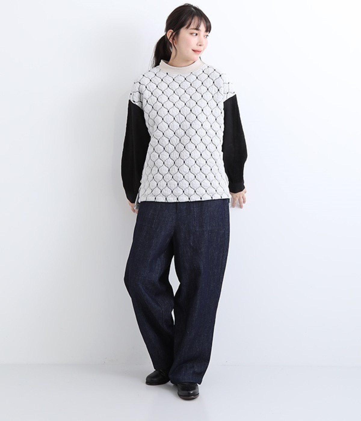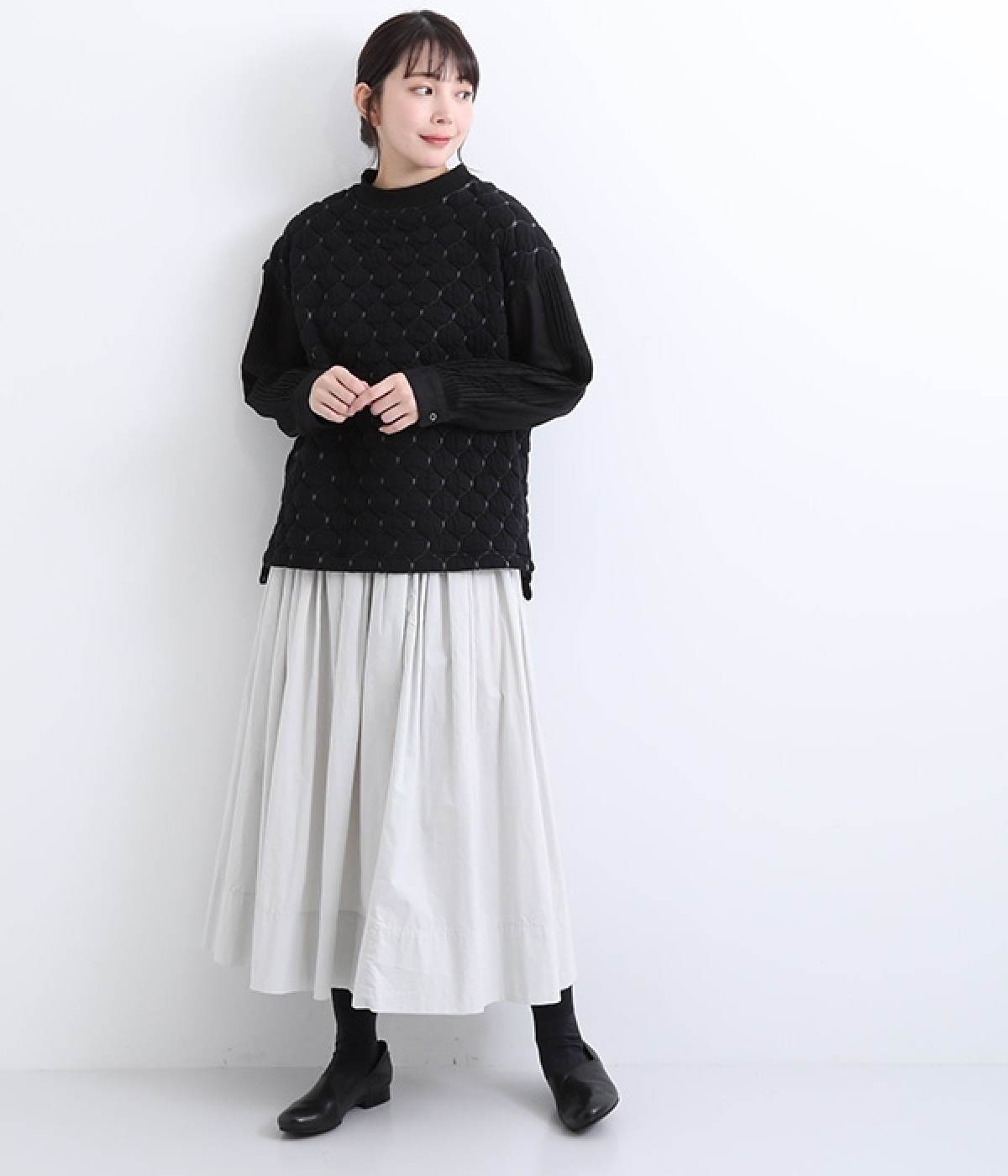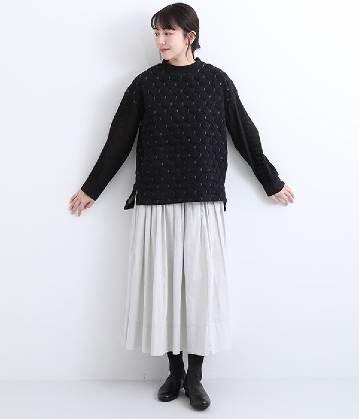 袋状になった柄がふっくらと浮き上がる「ブリスター編み」の生地を使用したプルオーバー。ピンタックをあしらったリネン素材で袖を切り替えた、レイヤード調のこだわりデザインがポイントです。ゆったりとした身幅のシルエットとドロップショルダーが抜け感もプラス。サイドスリットと前後差をつけた裾は、ボトムとのバランス調整も楽にできます。