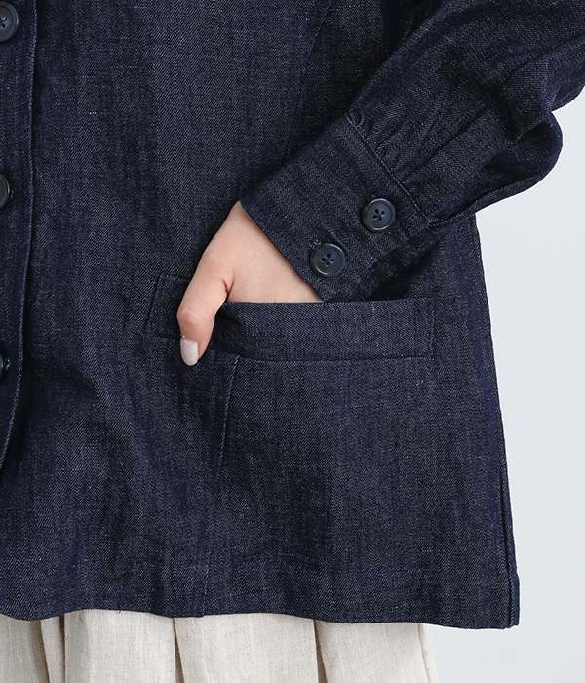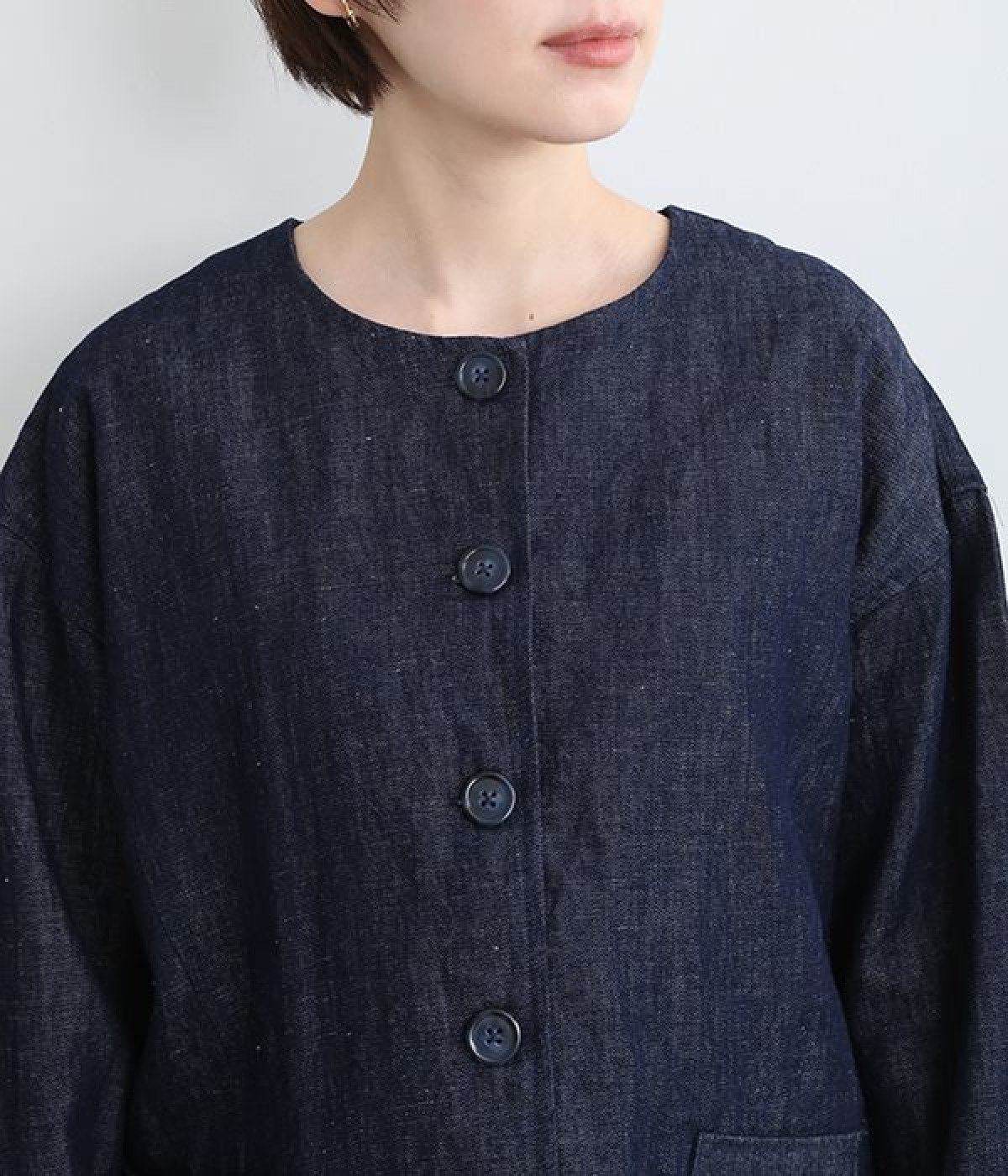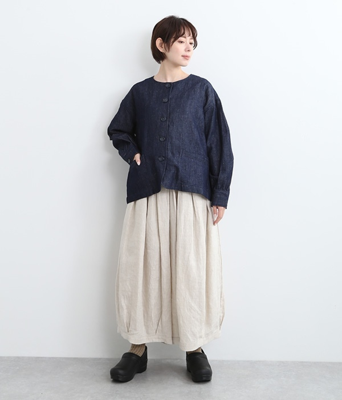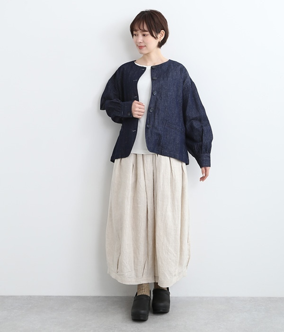 生地洗いをほどこすことで体になじむ風合いに仕上げたリネンコットンブルゾンです。袖口部分のギャザー使いにより、袖にふんわりとボリュームを持たせてかわいらしいシルエットに。首元をすっきり見せたいときに便利なノーカラーは、襟高のアイテムとも好相性なので重ね着も楽しくなりそう。着丈が長すぎない設定のため、ボトムの型を問わずにスタイリングが組めます。