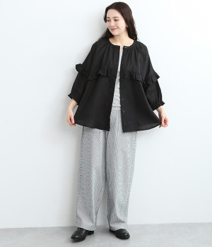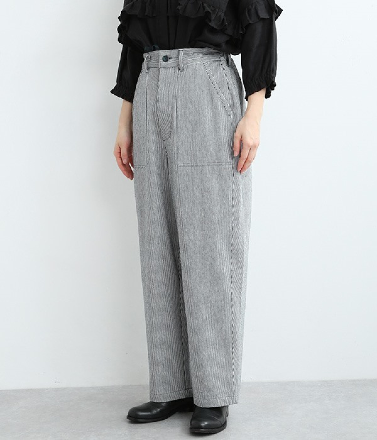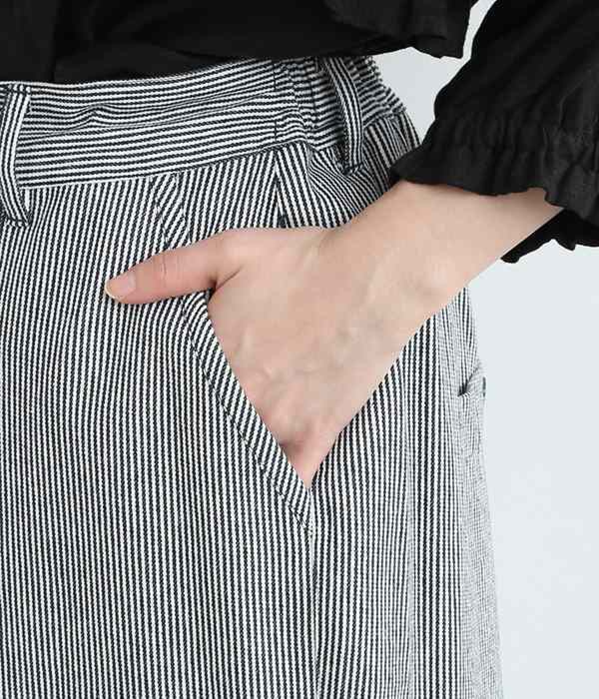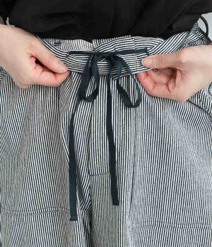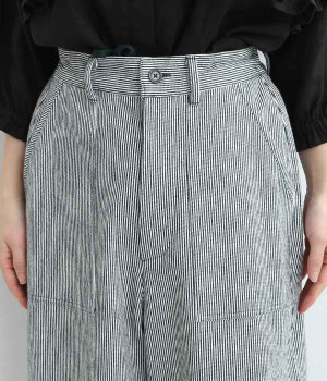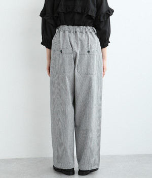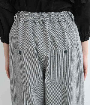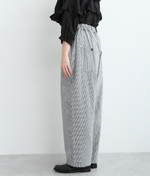 しっかりと丈夫な先染めヒッコリーストライプ仕立てのワイドパンツです。ゆったりとしたシルエットがラフな雰囲気で、前後の大きめポケットがデザインポイント。窮屈さを感じにくいウエストオールゴム仕様に加え、内ひも入りで細かな調整が可能です。どこかレトロさのある、リラックスムードがただよう大人スタイルをお楽しみください。