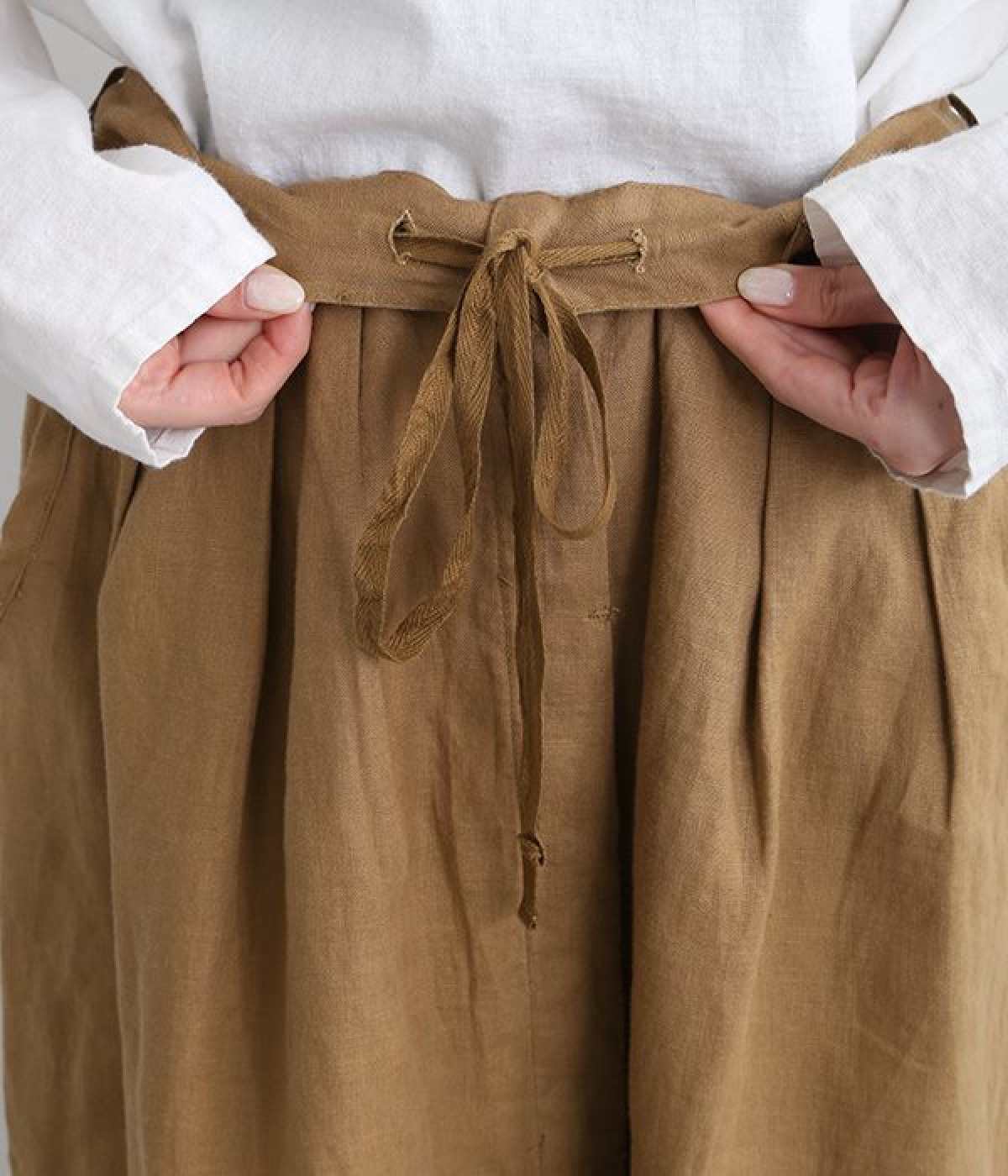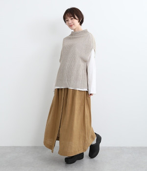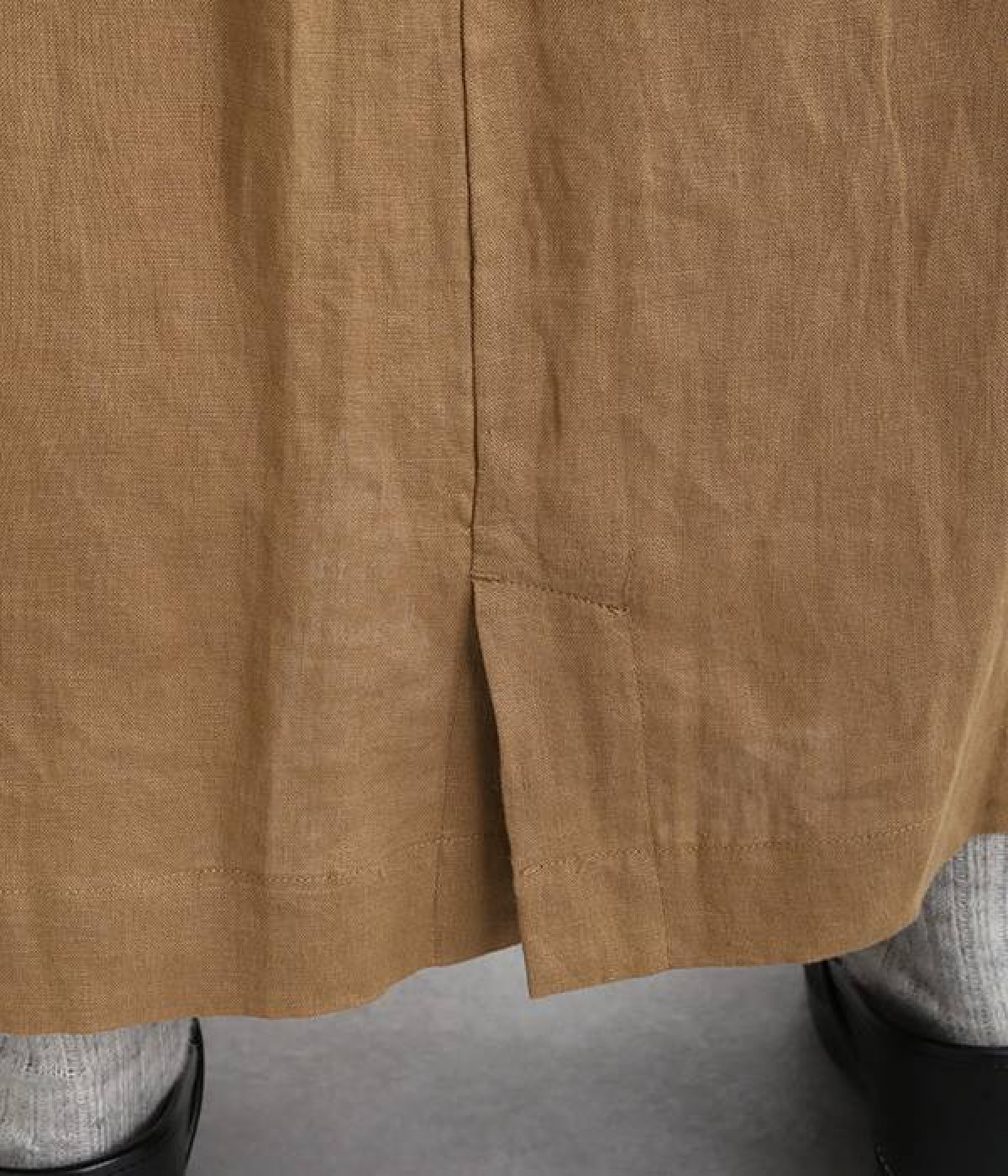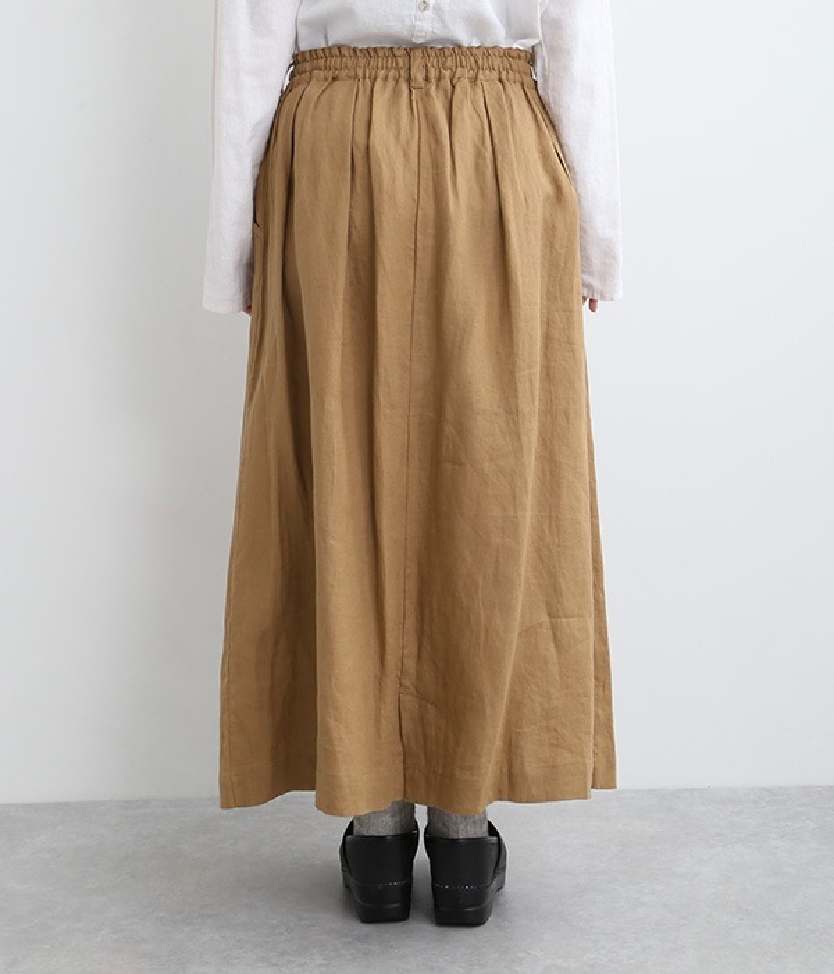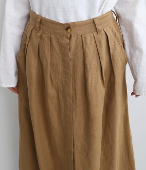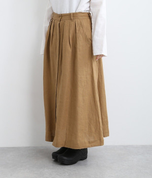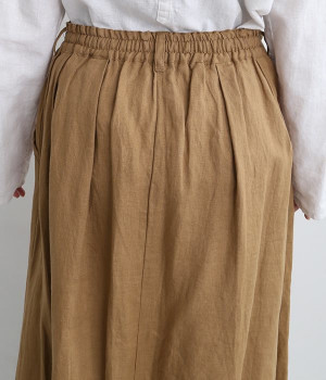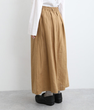 洗いざらしのようなナチュラルなシワが浮かび、こなれた着こなしが叶うリネンスカートです。フロントはボタンを隠す比翼仕立てを取り入れた、すっきり見えする大人仕様。トップスインがきれいに見えるよう、ウエスト前はフラットに、後ろのみにゴムを入れたハーフイージータイプです。フレアラインは広がりをおさえているため、落ち着いた雰囲気ではけるのも◎。裏地なしで軽やかに着用でき、ロング丈でもストレスなく日常使いが可能です。