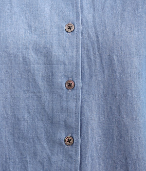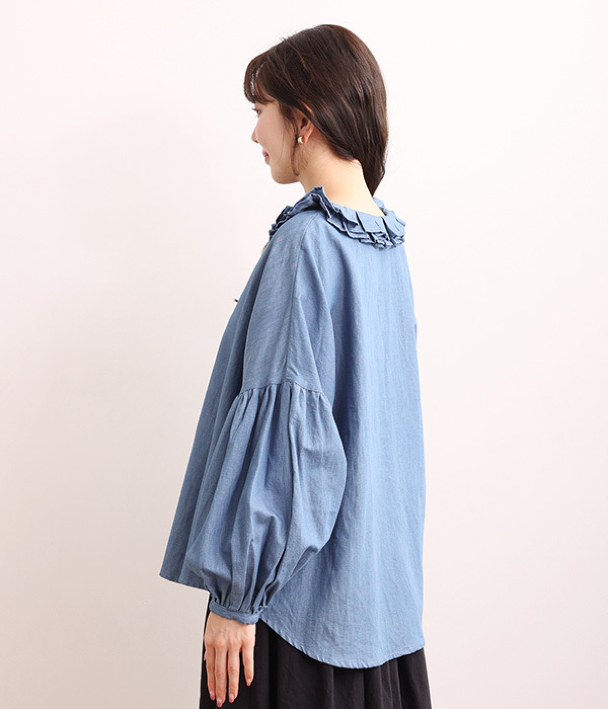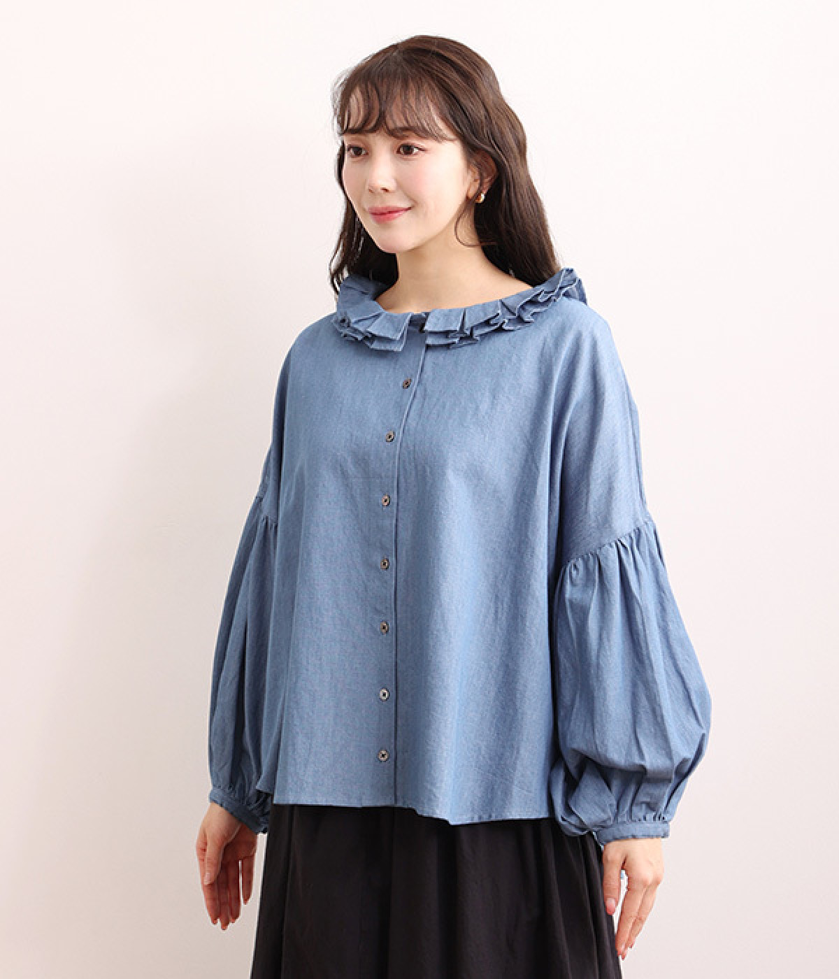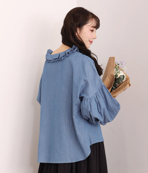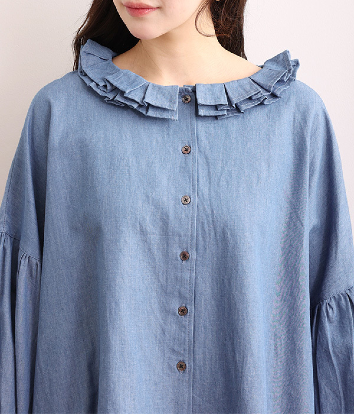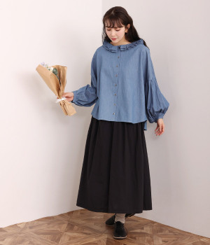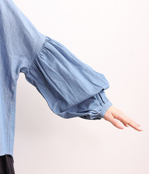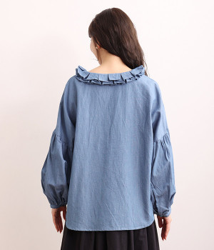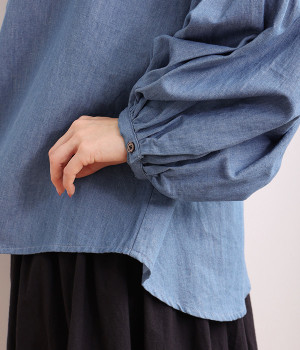 細番手リネン&コットンの肌にやさしいタッチが心地良い、厚みをおさえたデニムブラウス。顔まわりを華やかに飾る二重のプリーツ襟、ふんわりやさしい雰囲気のボリューム袖で見栄えする一枚に仕上げています。フロントと袖口にはつややかな貝ボタンを取り入れ、上品なエッセンスもさりげなく。生地に通気性があるので、汗ばむ日にもさわやかな気分で着こなせます。
