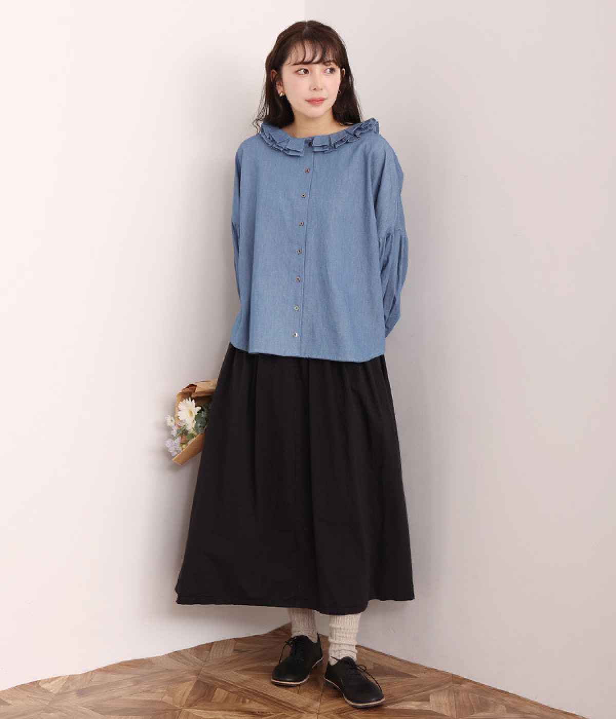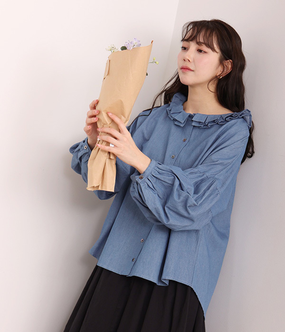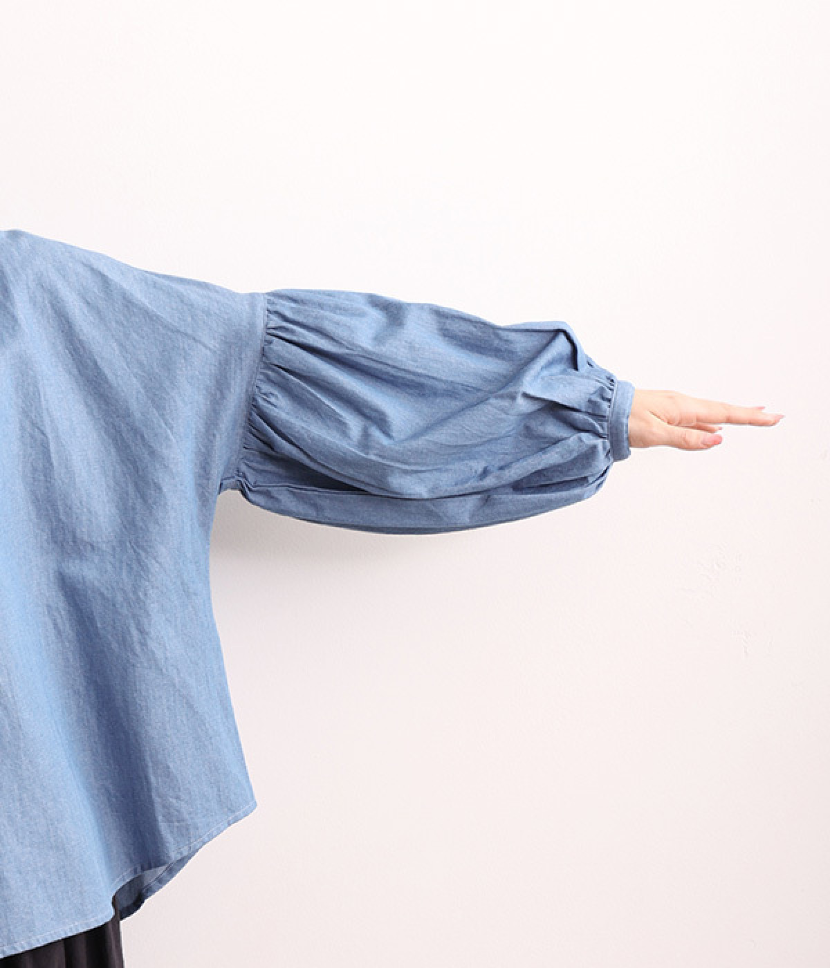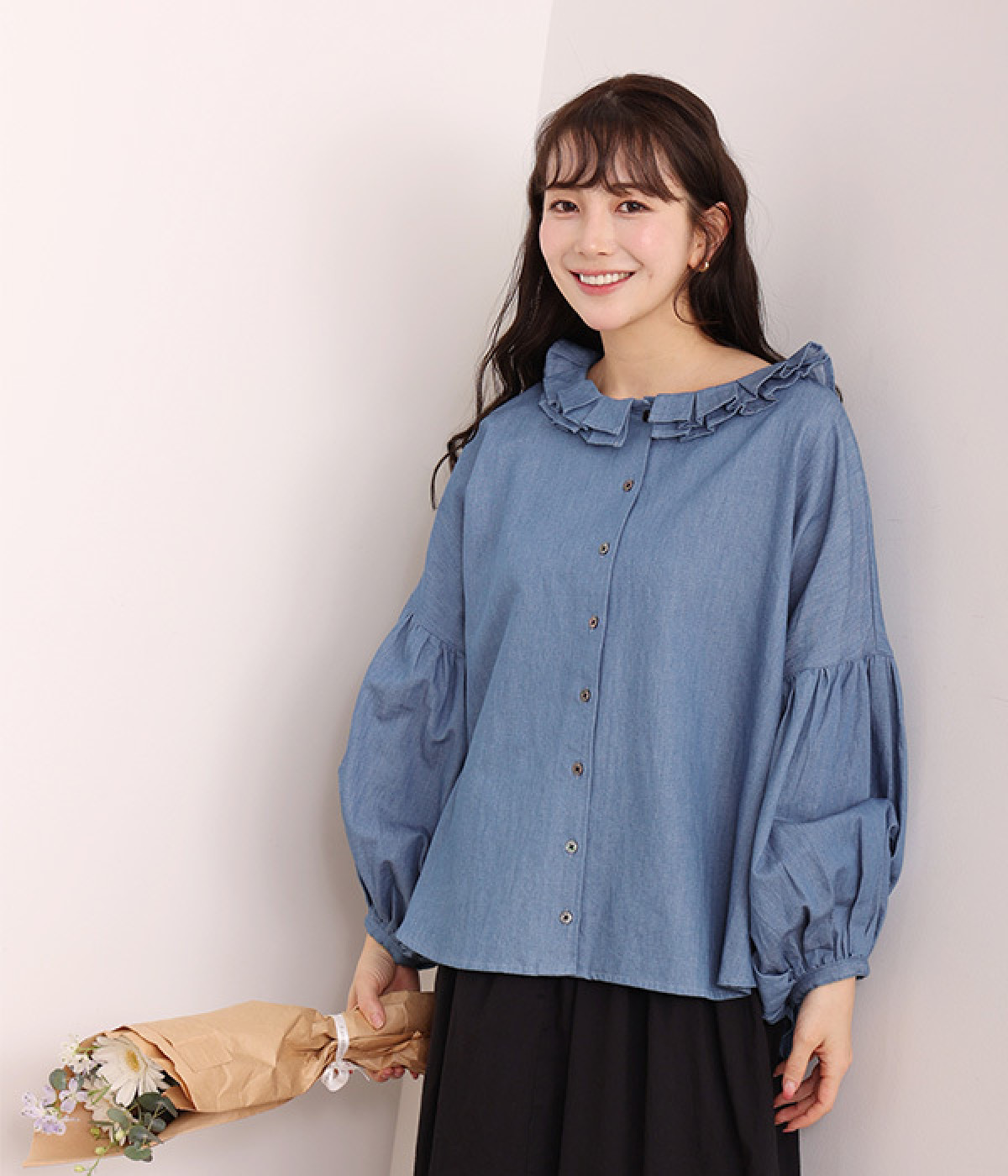 細番手リネン&コットンの肌にやさしいタッチが心地良い、厚みをおさえたデニムブラウス。顔まわりを華やかに飾る二重のプリーツ襟、ふんわりやさしい雰囲気のボリューム袖で見栄えする一枚に仕上げています。フロントと袖口にはつややかな貝ボタンを取り入れ、上品なエッセンスもさりげなく。生地に通気性があるので、汗ばむ日にもさわやかな気分で着こなせます。