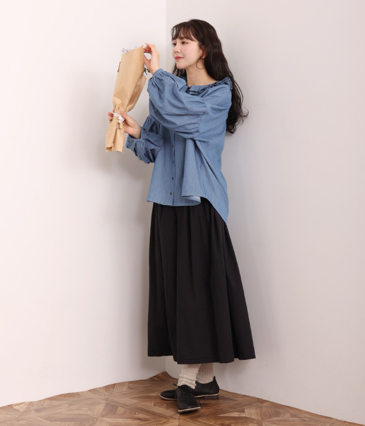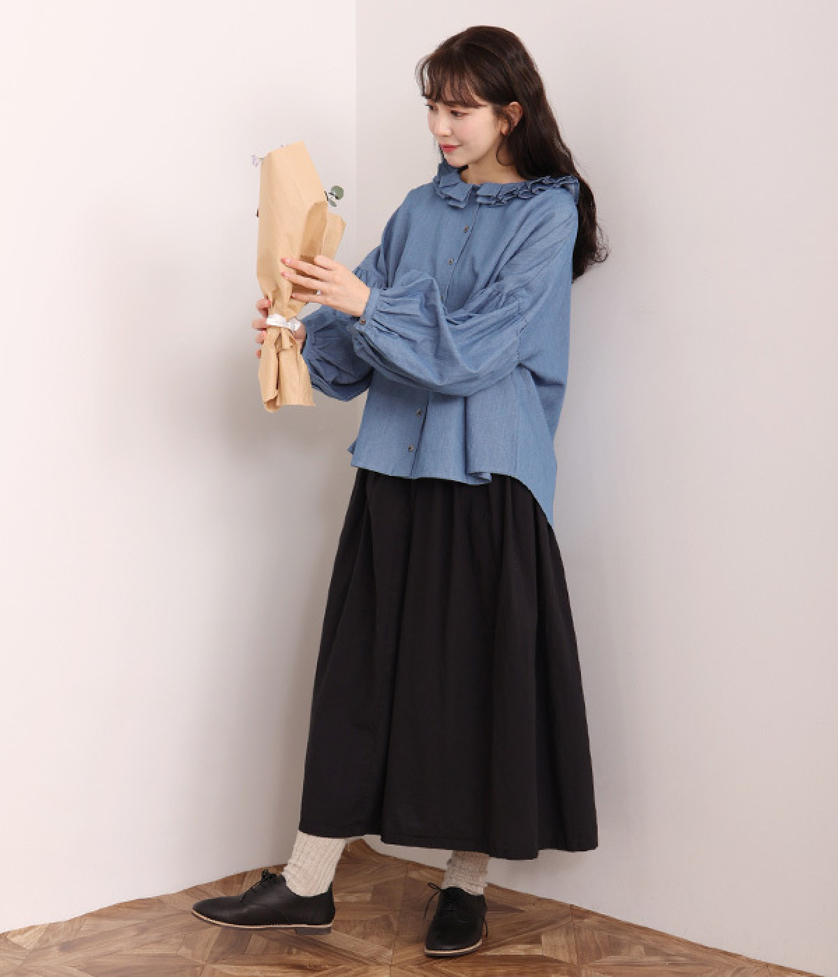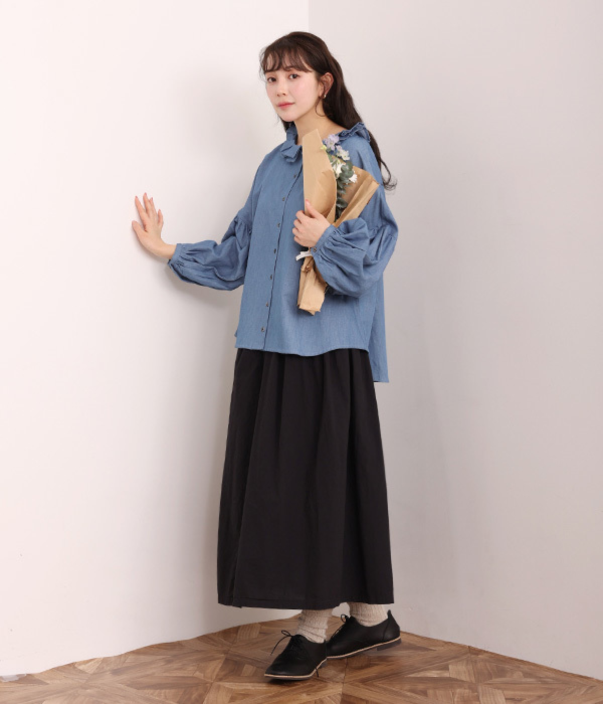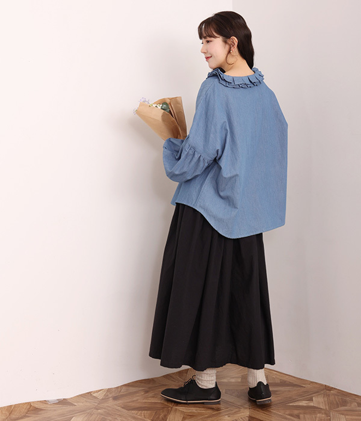 細番手リネン&コットンの肌にやさしいタッチが心地良い、厚みをおさえたデニムブラウス。顔まわりを華やかに飾る二重のプリーツ襟、ふんわりやさしい雰囲気のボリューム袖で見栄えする一枚に仕上げています。フロントと袖口にはつややかな貝ボタンを取り入れ、上品なエッセンスもさりげなく。生地に通気性があるので、汗ばむ日にもさわやかな気分で着こなせます。