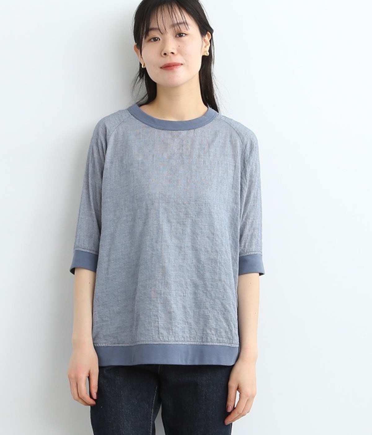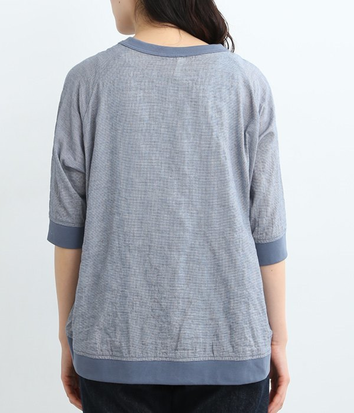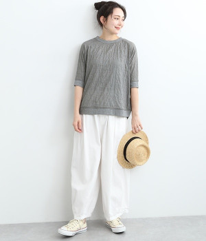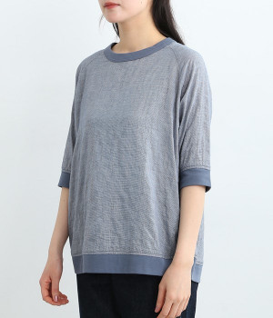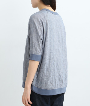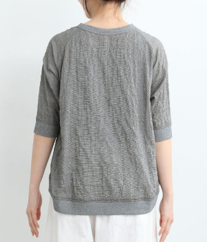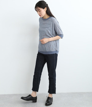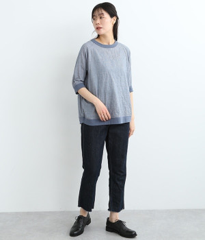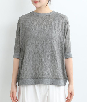 レーヨンシルク混の、ほのかにシアーな素材を使用したプルオーバーブラウス。軽やかさや風通りの良さ、清涼感などさまざまな素材の特性を併せ持っているので、汗ばむ季節にも快適に着用できます。部分的にリブを取り入れ、デザイン性と心地良いフィット性を欲張りました。がんばりすぎない、大人なこなれスタイルにマッチする一枚です。