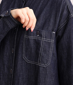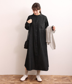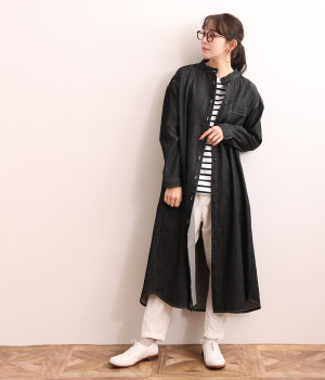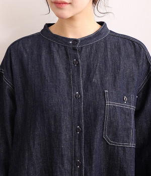 洗いざらしのリネンコットン生地で織り上げた、着こなすほどに肌になじんでいくシャツワンピース。深い色合いのデニム地のため、配色ステッチやネップ、織りの糸がよく見えるナチュラルな顔つきの一枚です。ゆとりのあるサイズに仕上げているので、単体での着用だけでなく重ね着がマストになる季節にも活躍。フロントと袖口には身生地と色を合わせた猫目ボタンをあしらってかわいらしいポイントに。きちんとした印象のバンドカラーは、ラフな羽織りスタイルでも品の良さを保ってくれます。