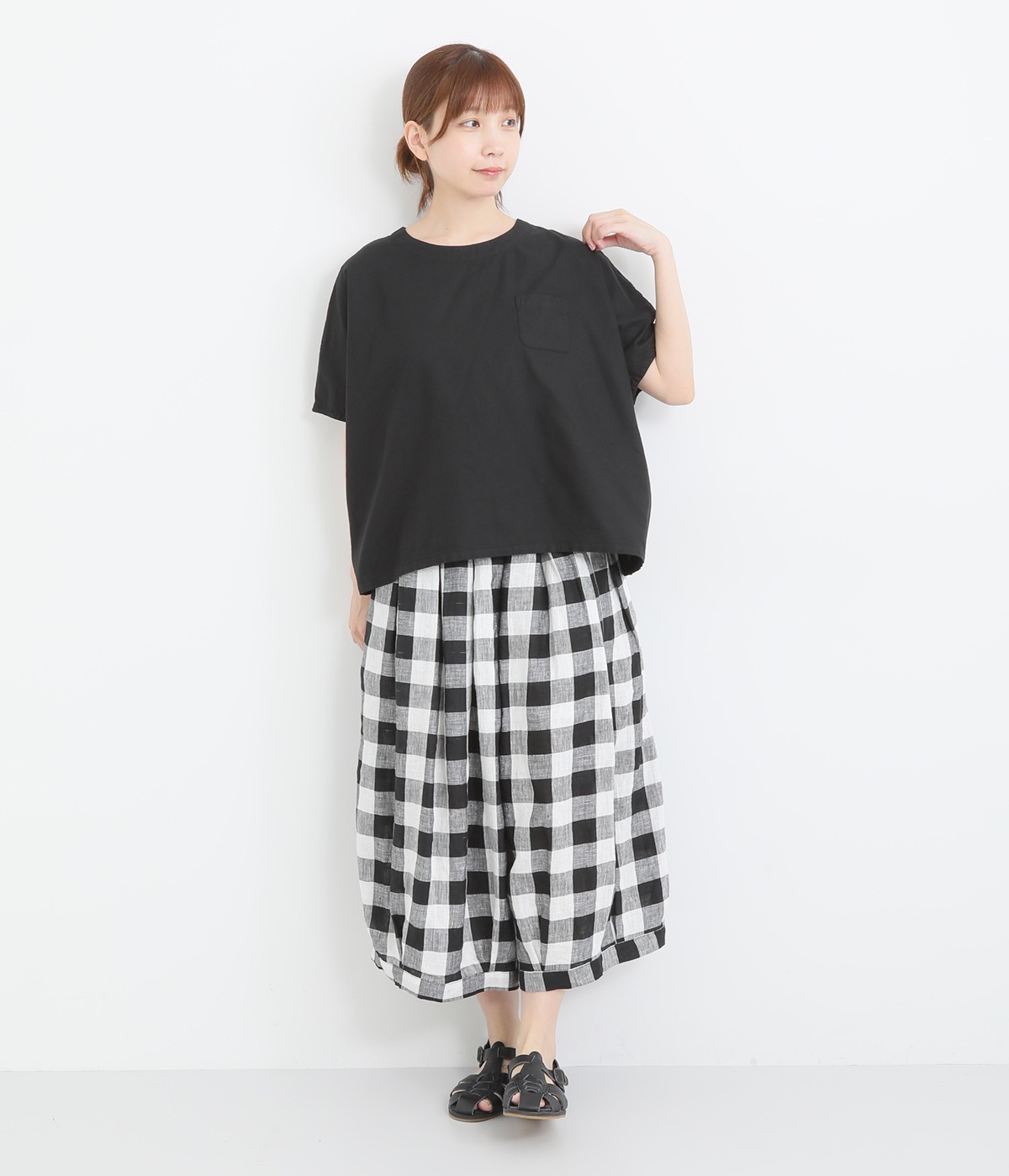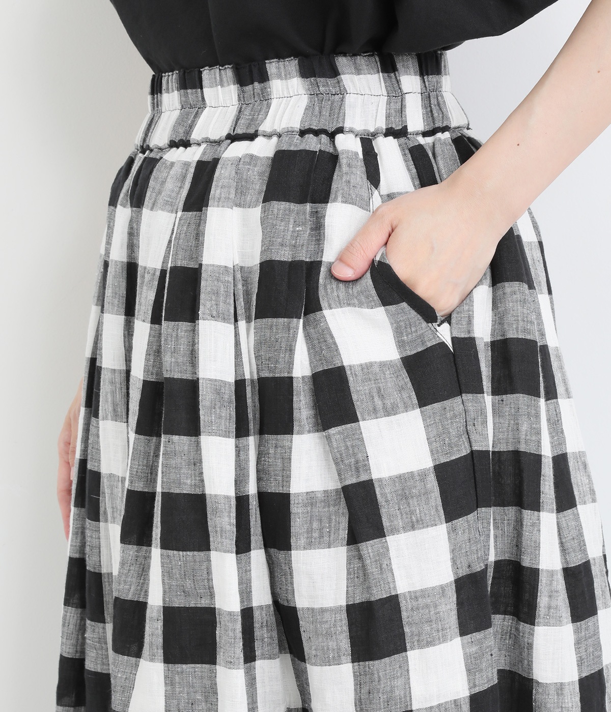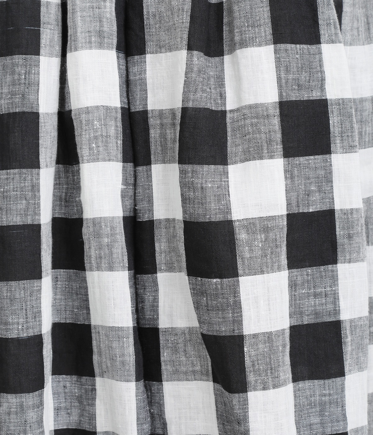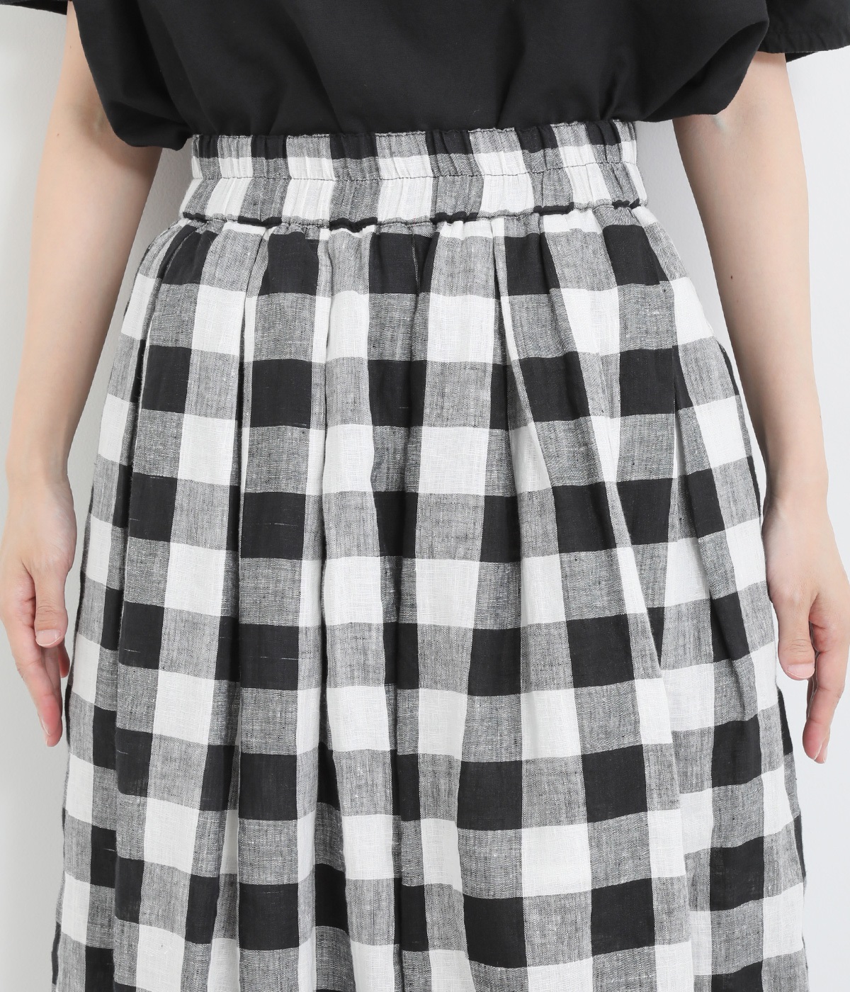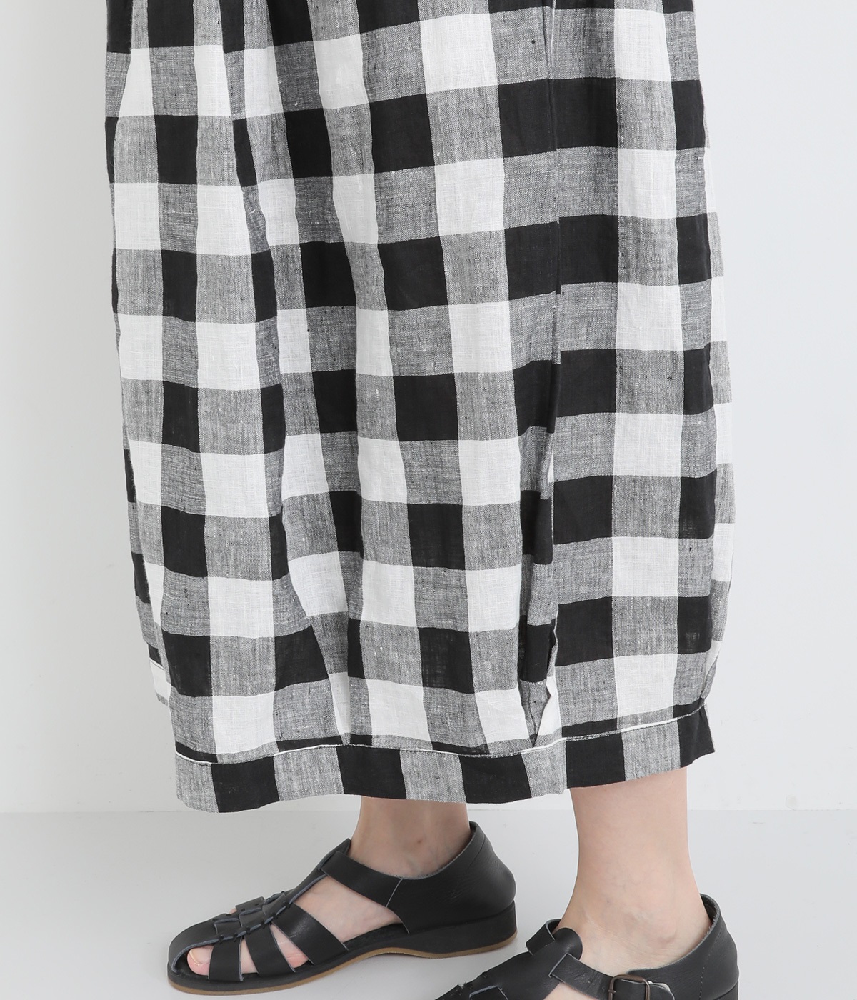 ナチュラルな風合いが魅力的なブロックチェックリネン生地を使用しています。さらりとした質感が着心地が良く、軽やかな薄手素材で見た目にもさわやか。裏地をつけて透け感を若干おさえました。