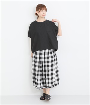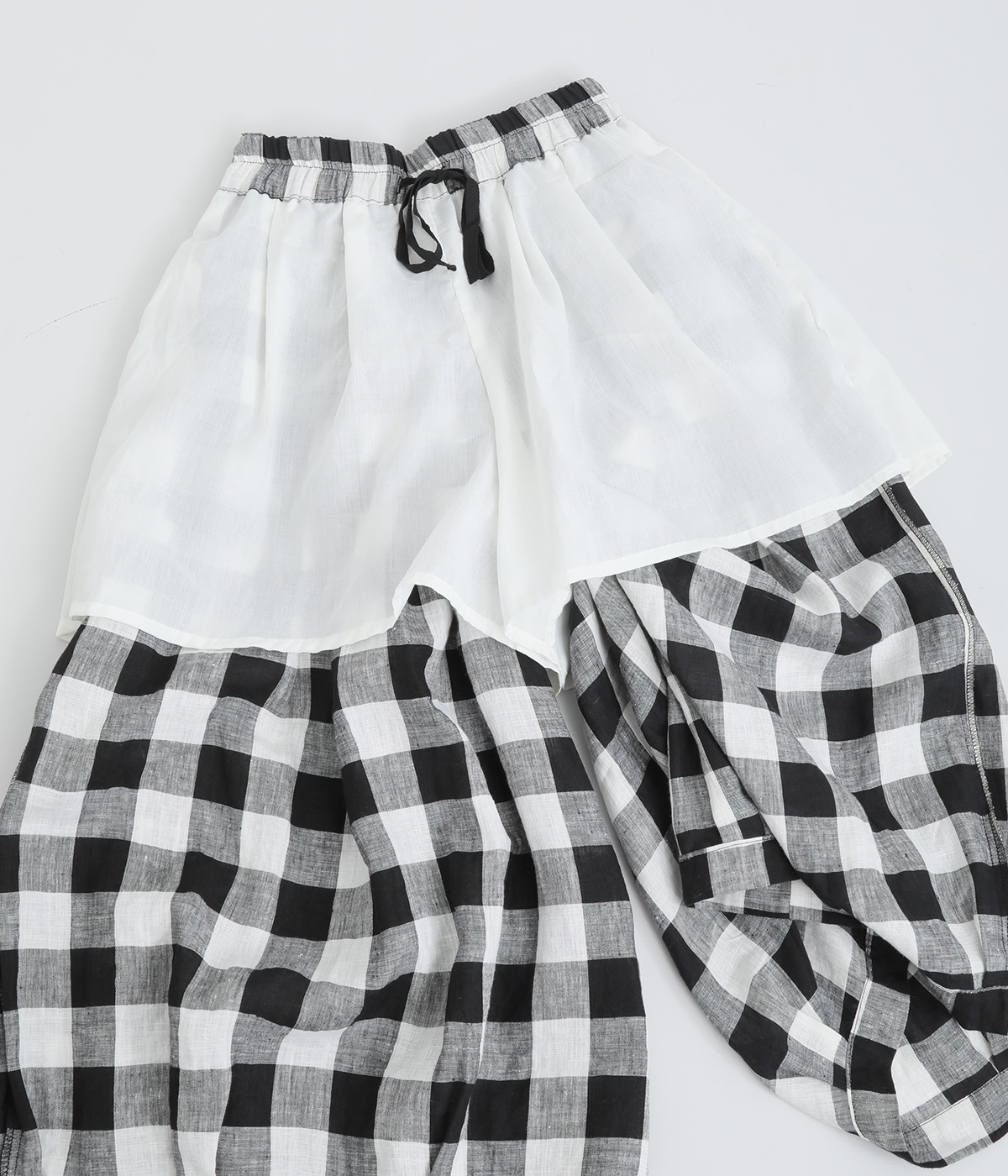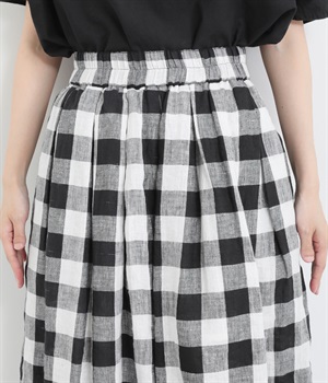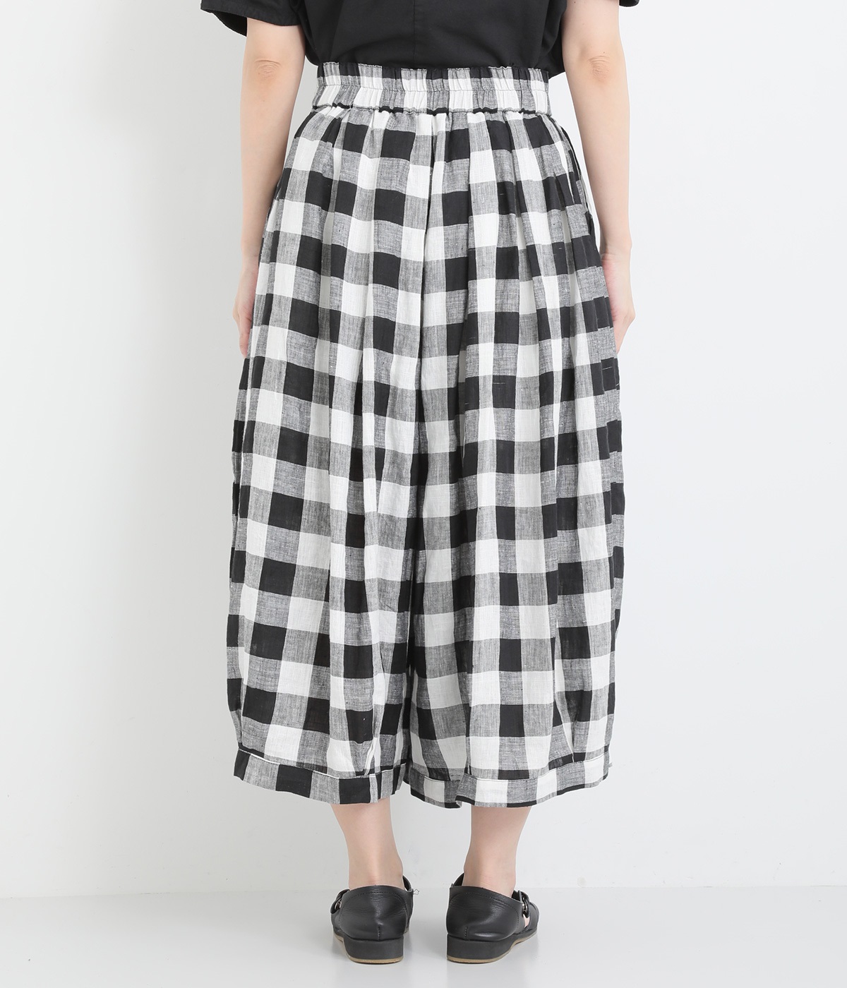 先染めのブロックチェック柄が着こなしになじみやすくもポイント使いになるパンツです。ウエストにギャザーを入れてボリュームを出し、裾タックで立体感をプラス。ウエストはトップスインもきれいに決まる太めの平ゴム仕様です。