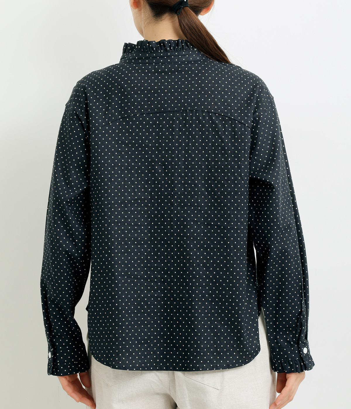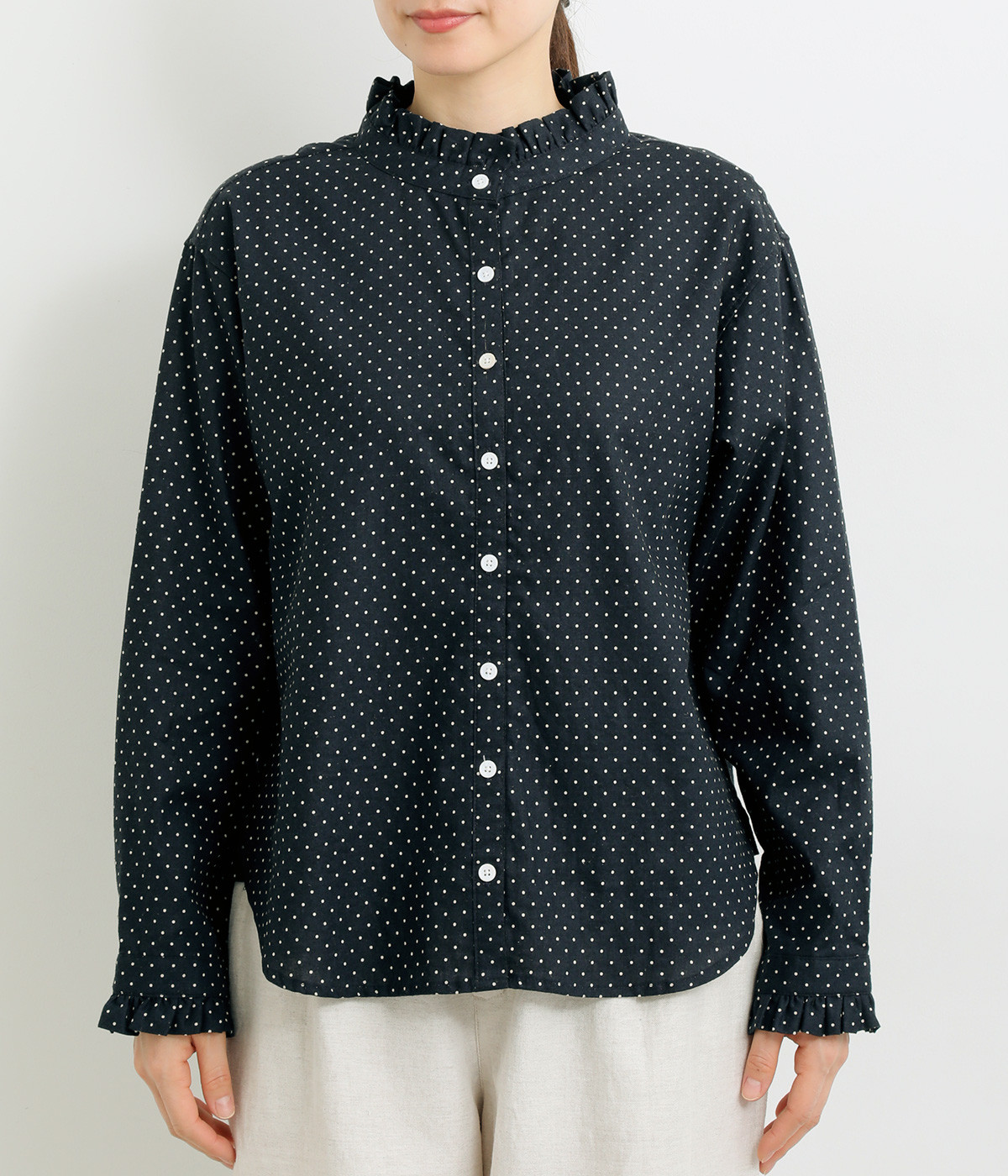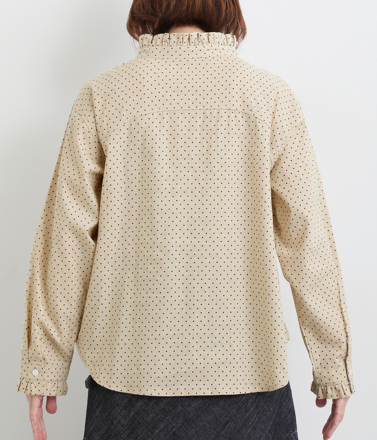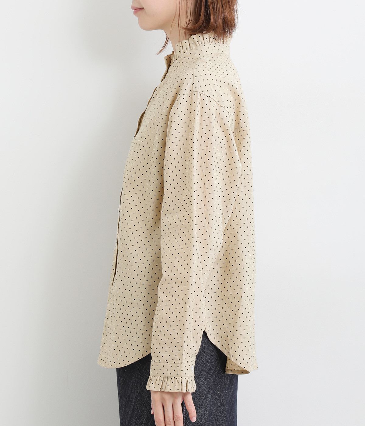 襟と袖口に施されたフリルがフェミニンなアクセント