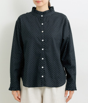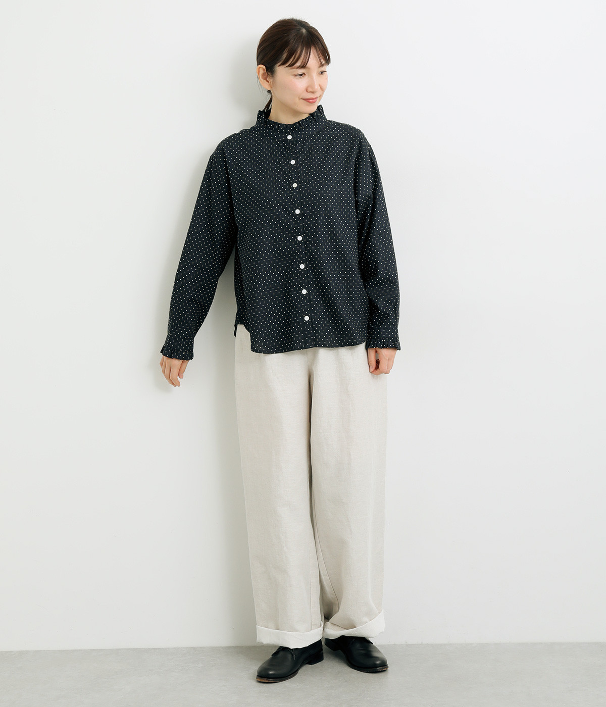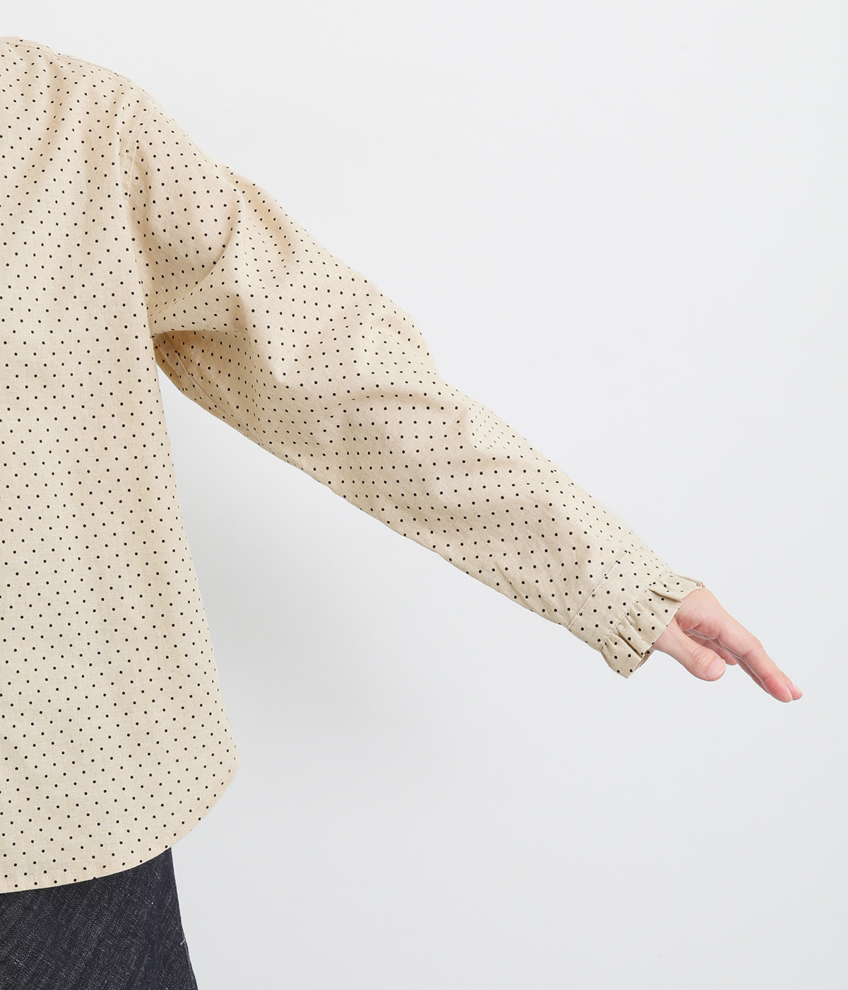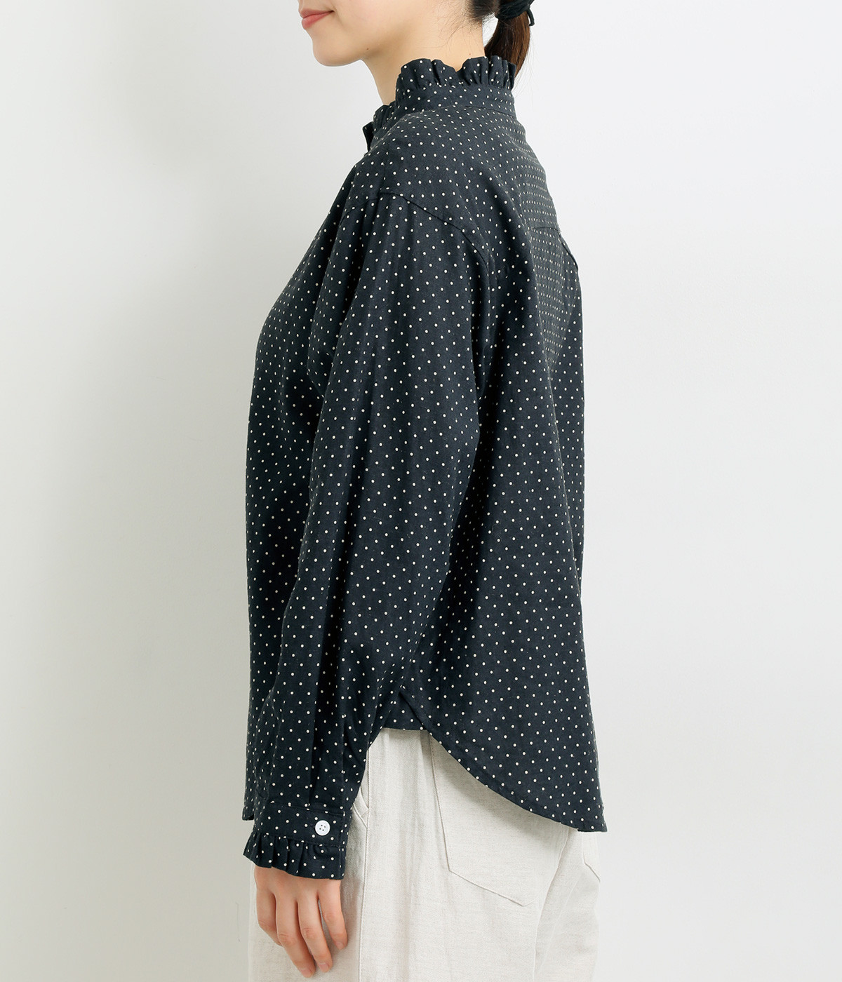 襟と袖口に施されたフリルがフェミニンなアクセント