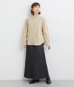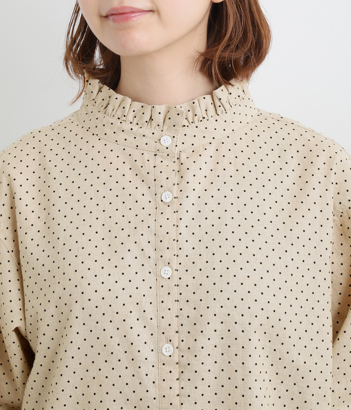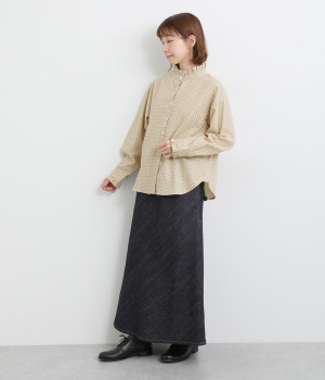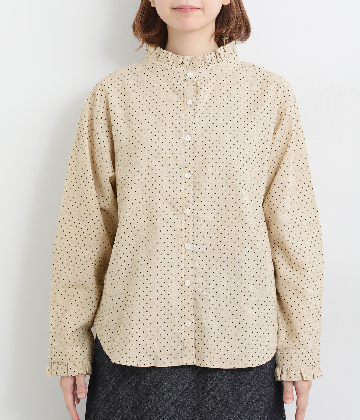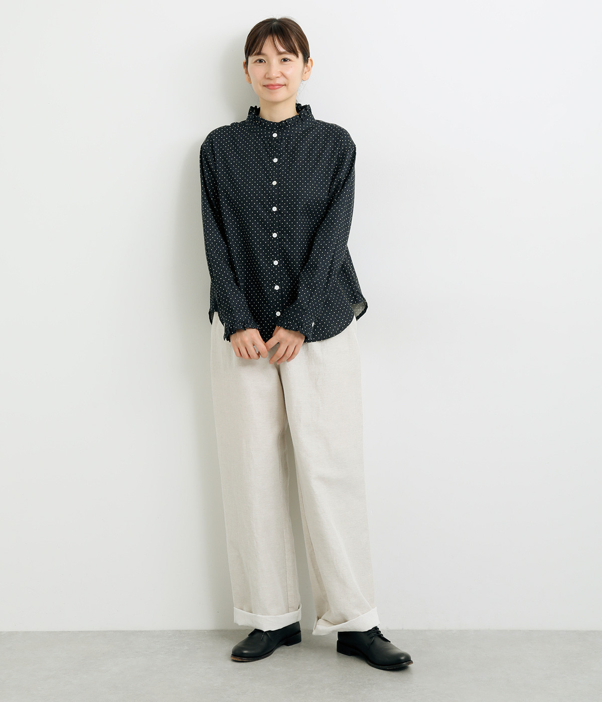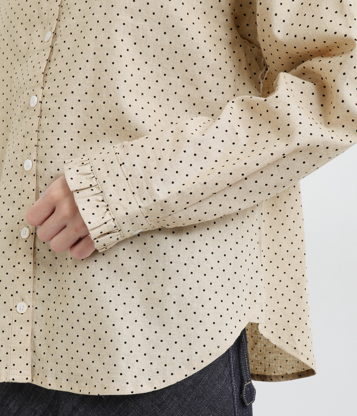 襟と袖口に施されたフリルがフェミニンなアクセント