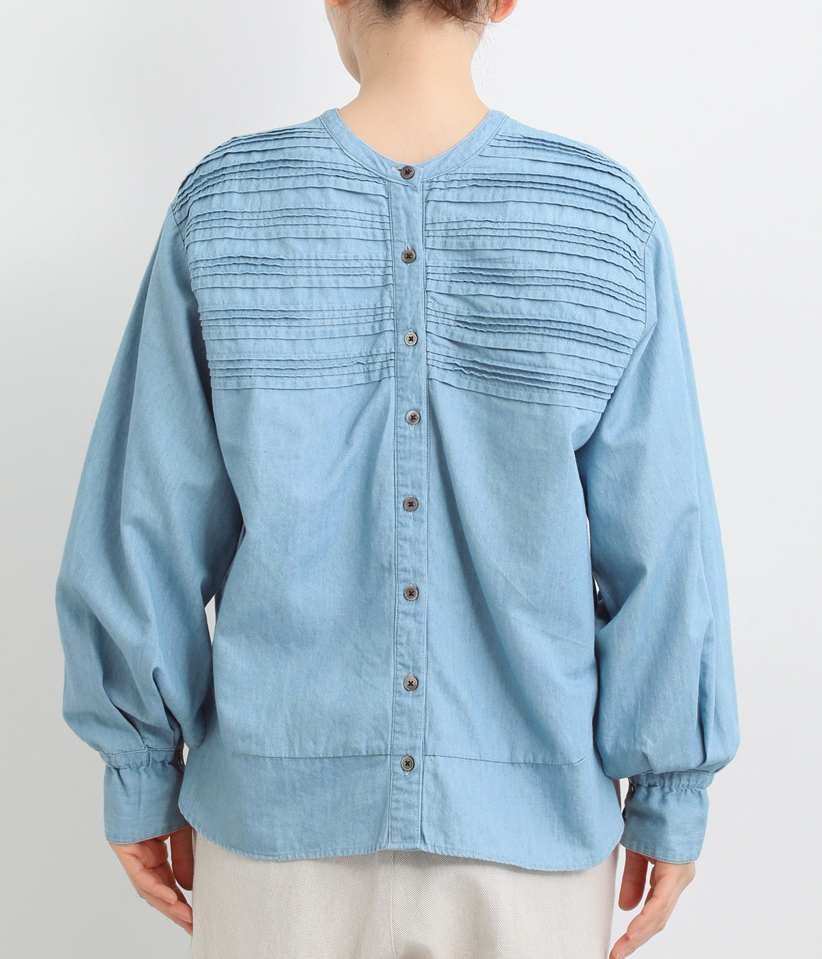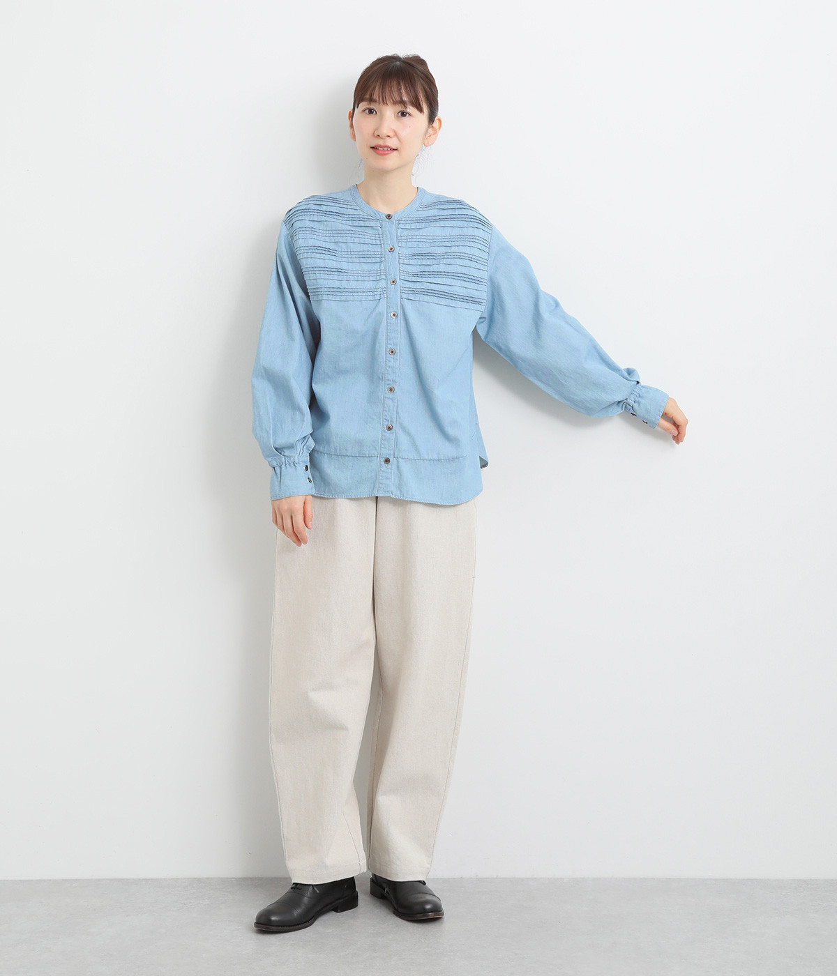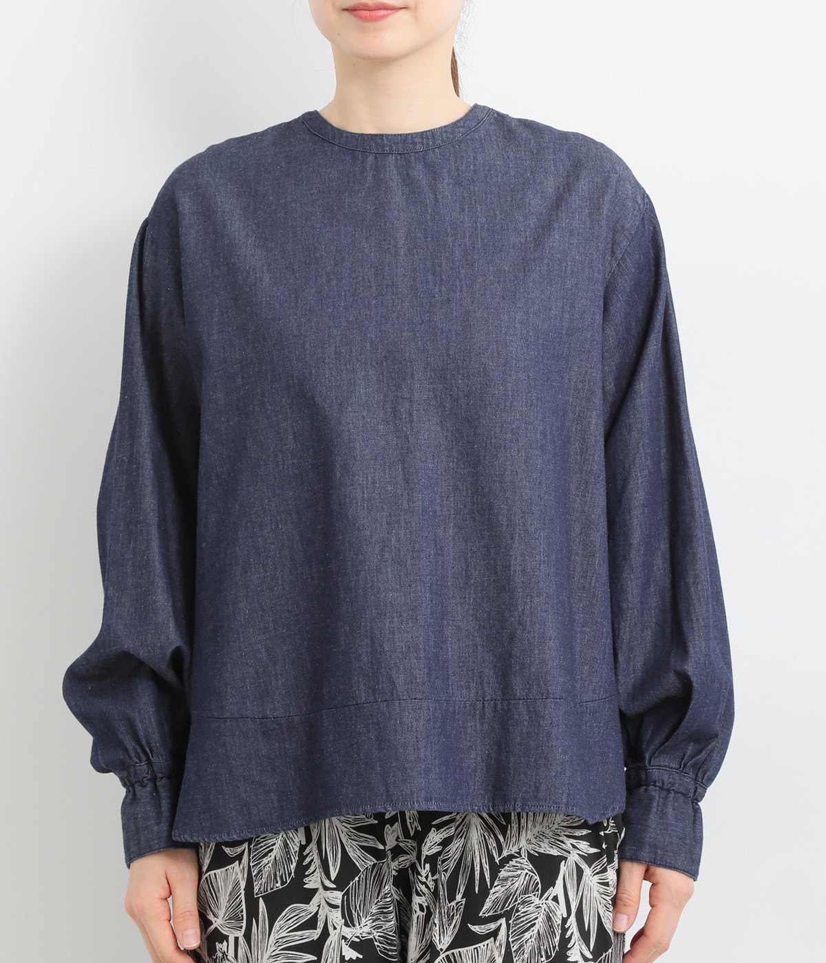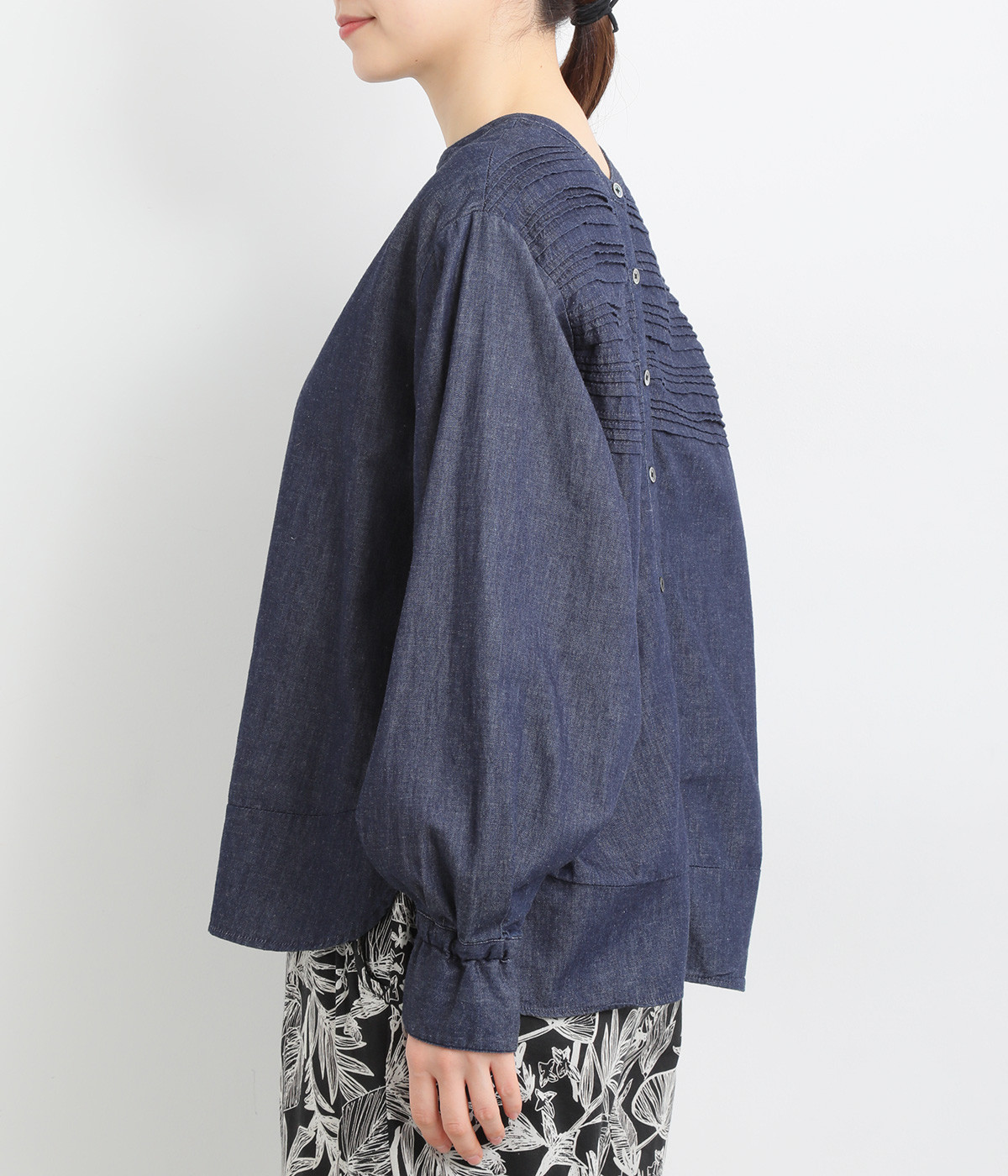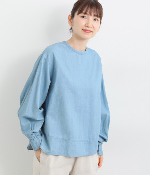 袖口まわりはゴムシャーリングでフェミニンなニュアンスをプラス