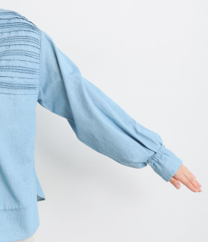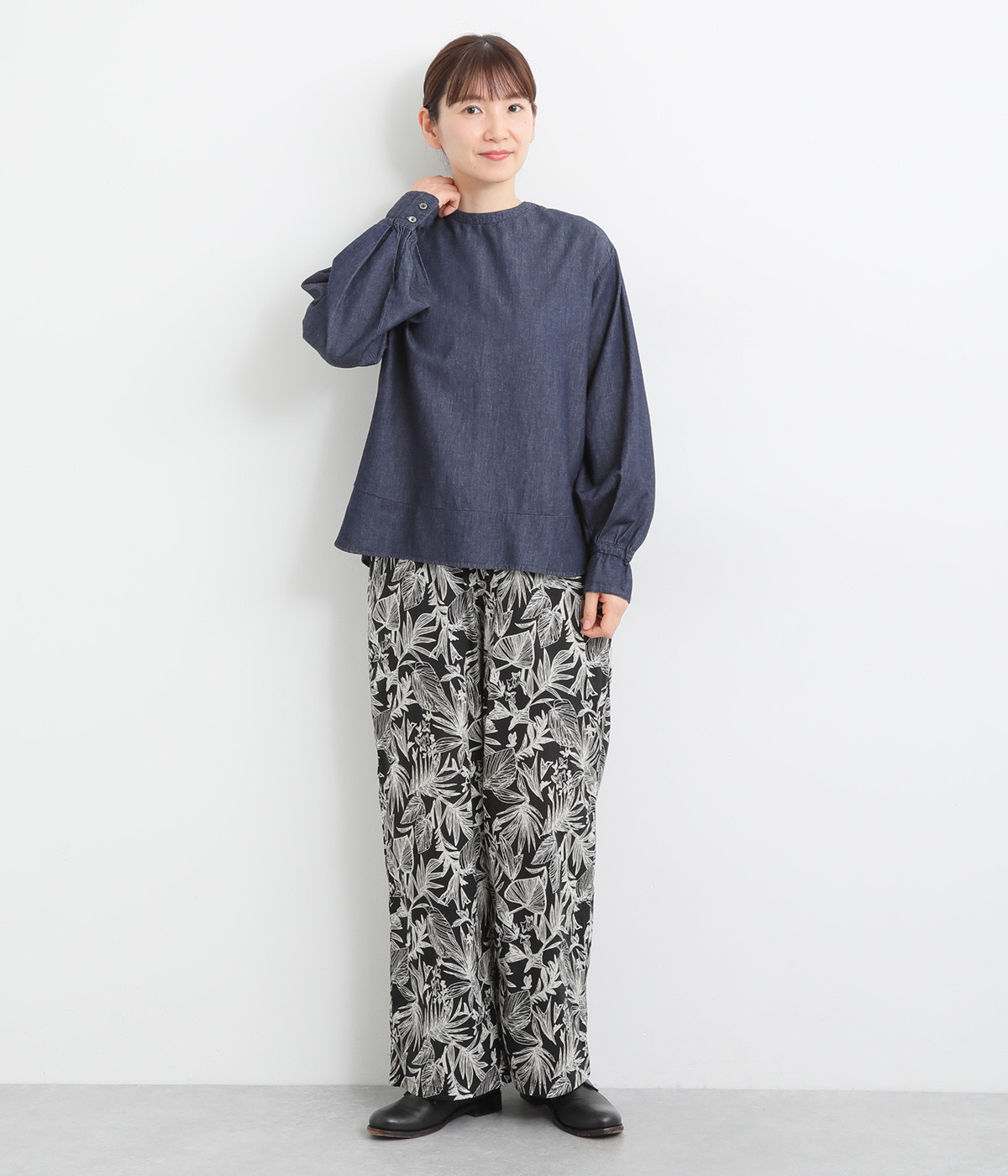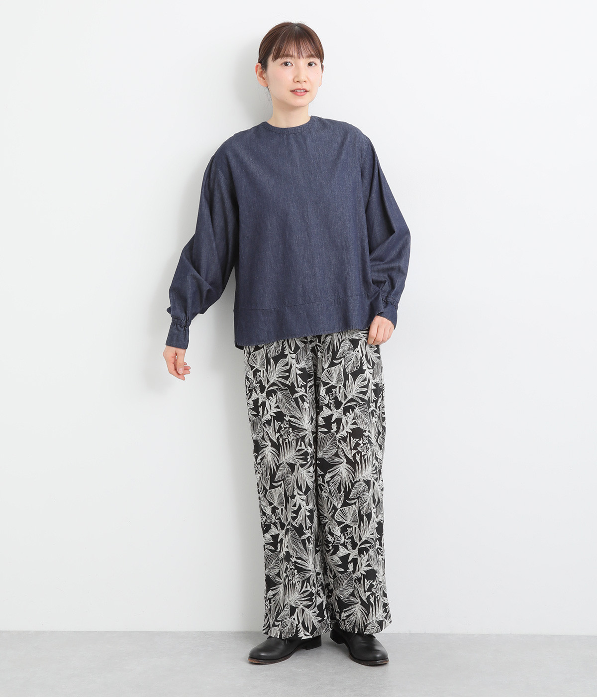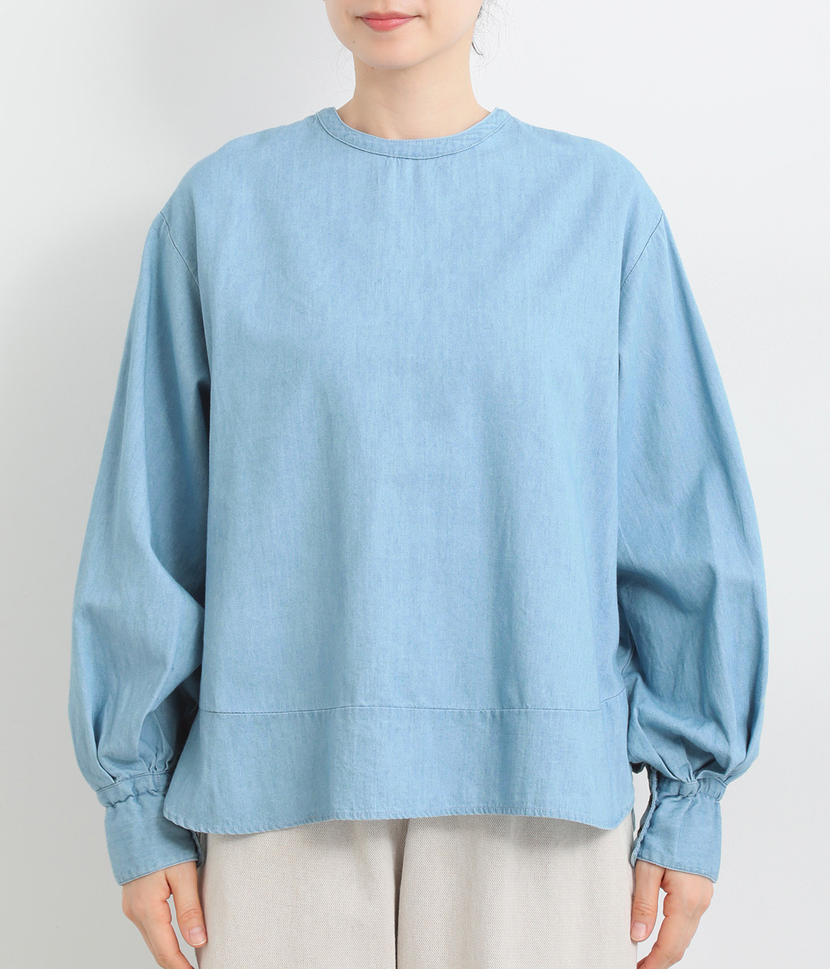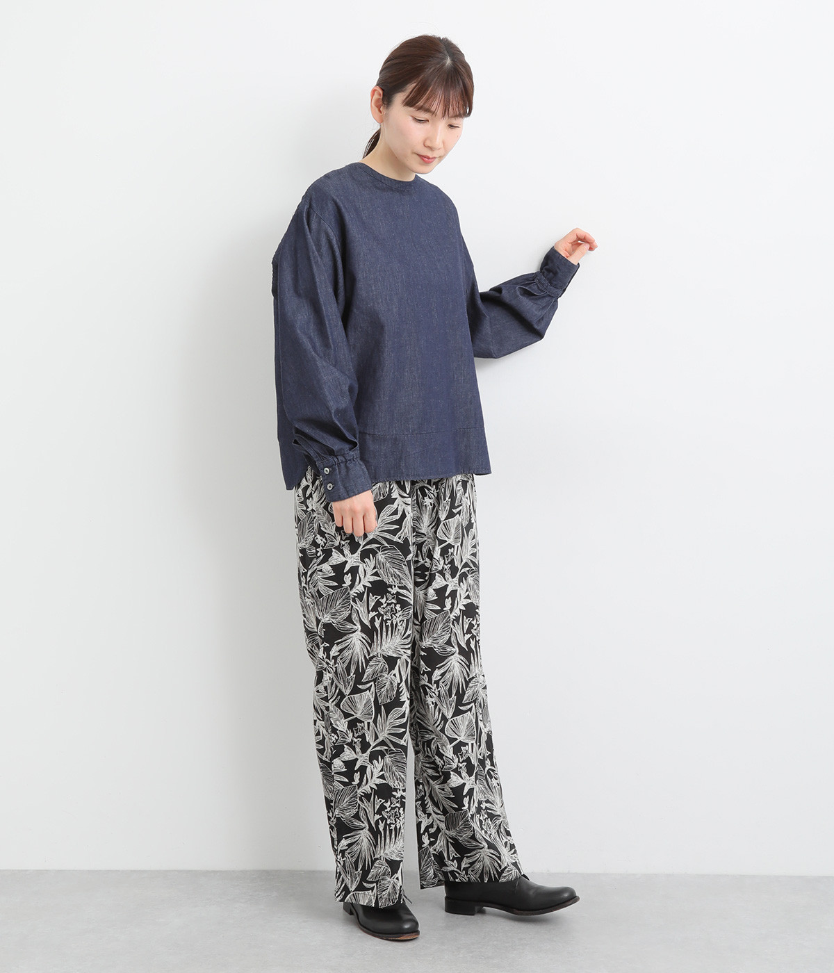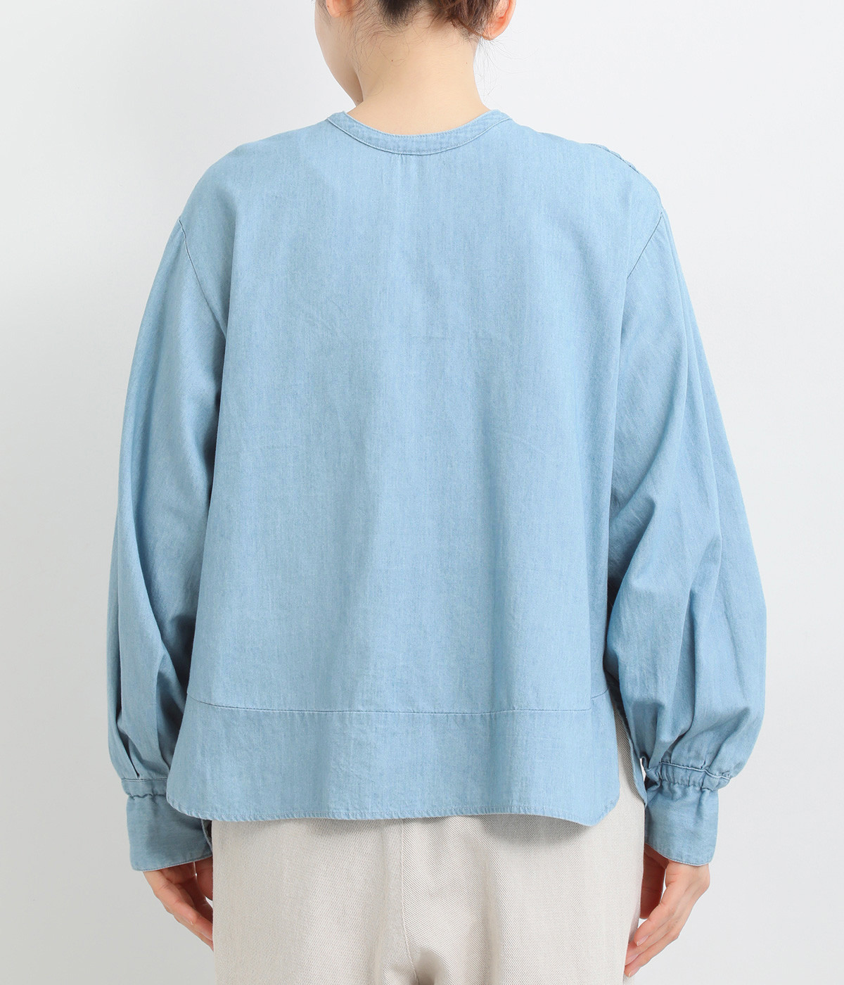 袖口まわりはゴムシャーリングでフェミニンなニュアンスをプラス