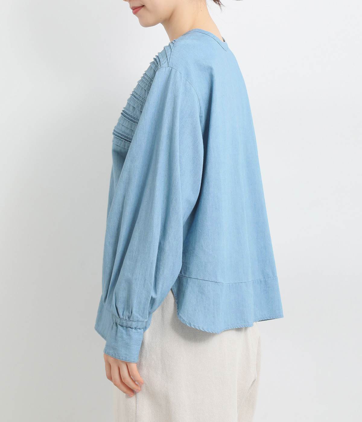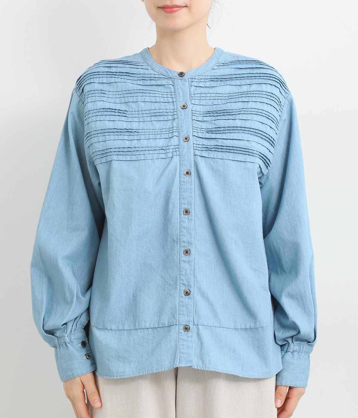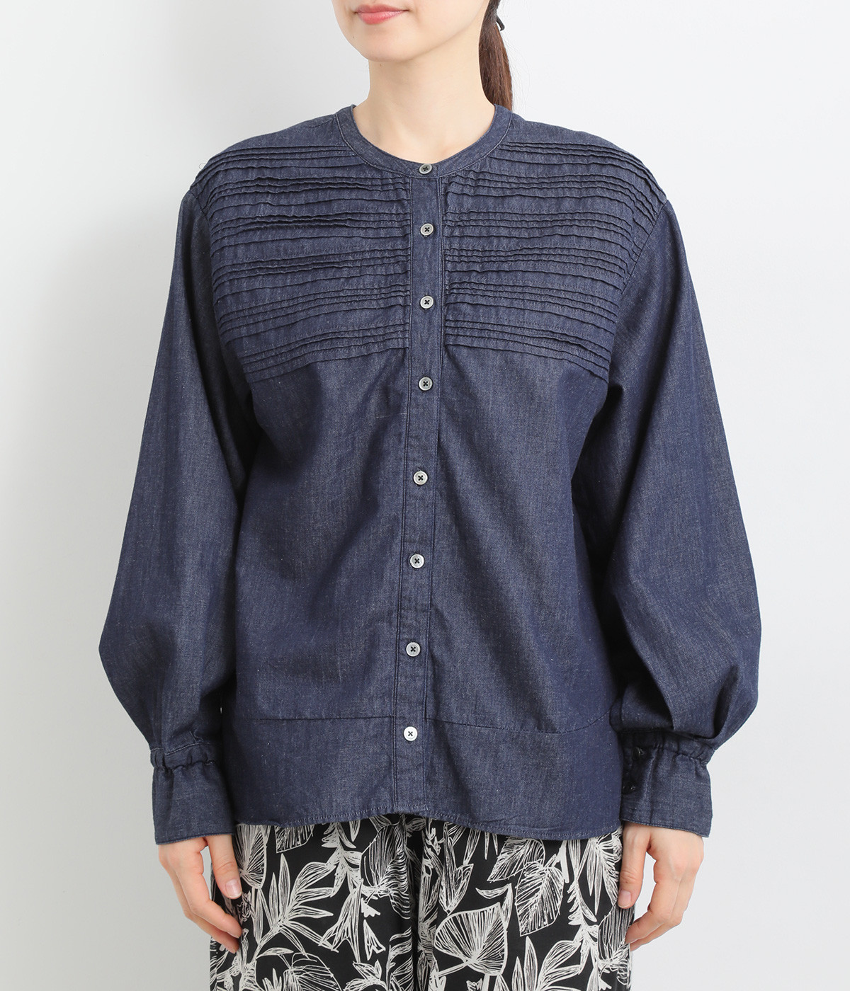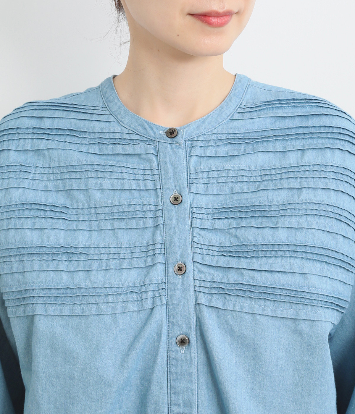 胸元に施された24本のボーダーピンタックがアイキャッチに