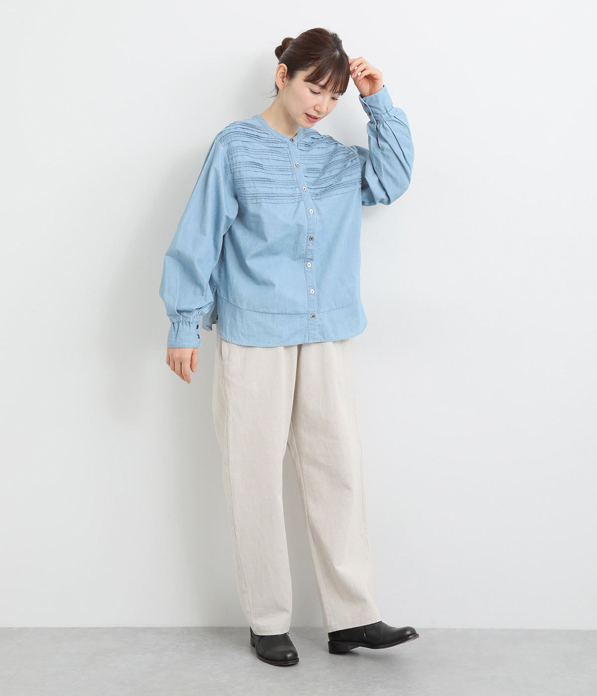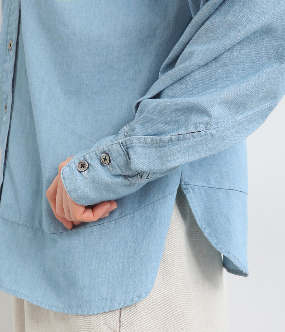 おだやかに光る本貝ボタンのコントラストがさり気ないポイント