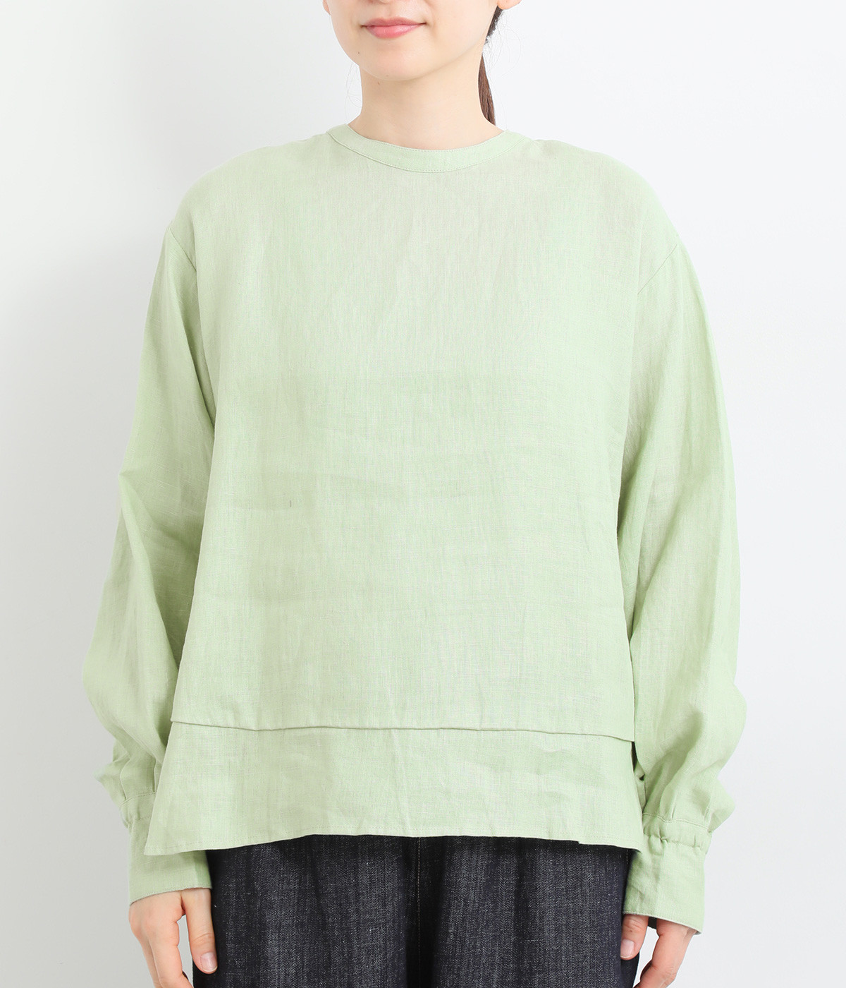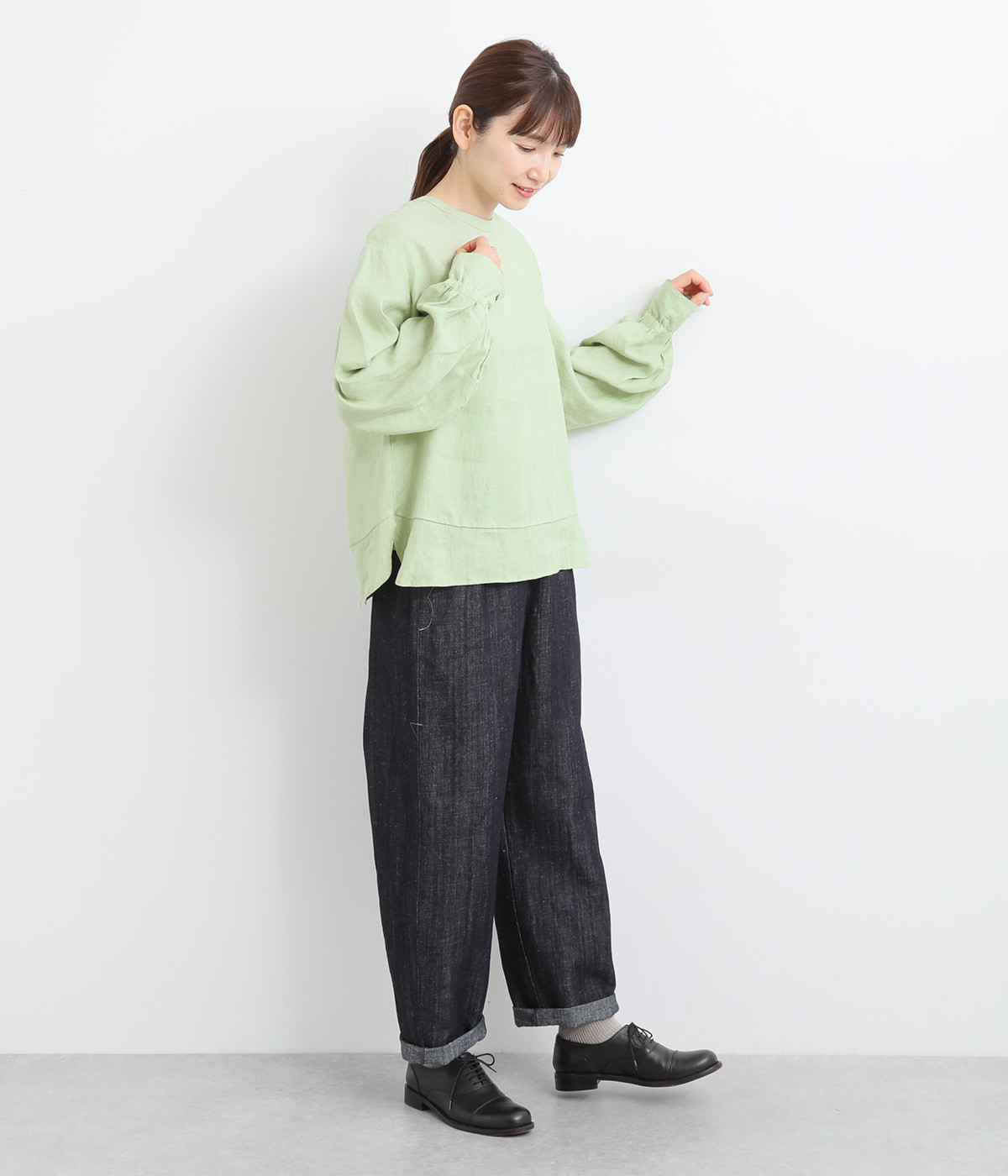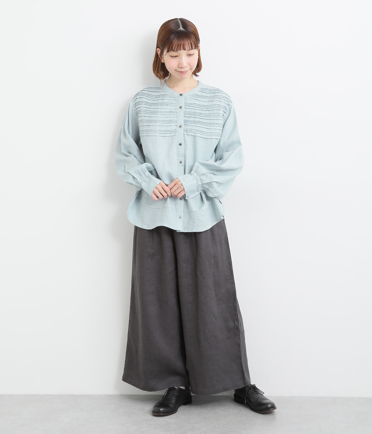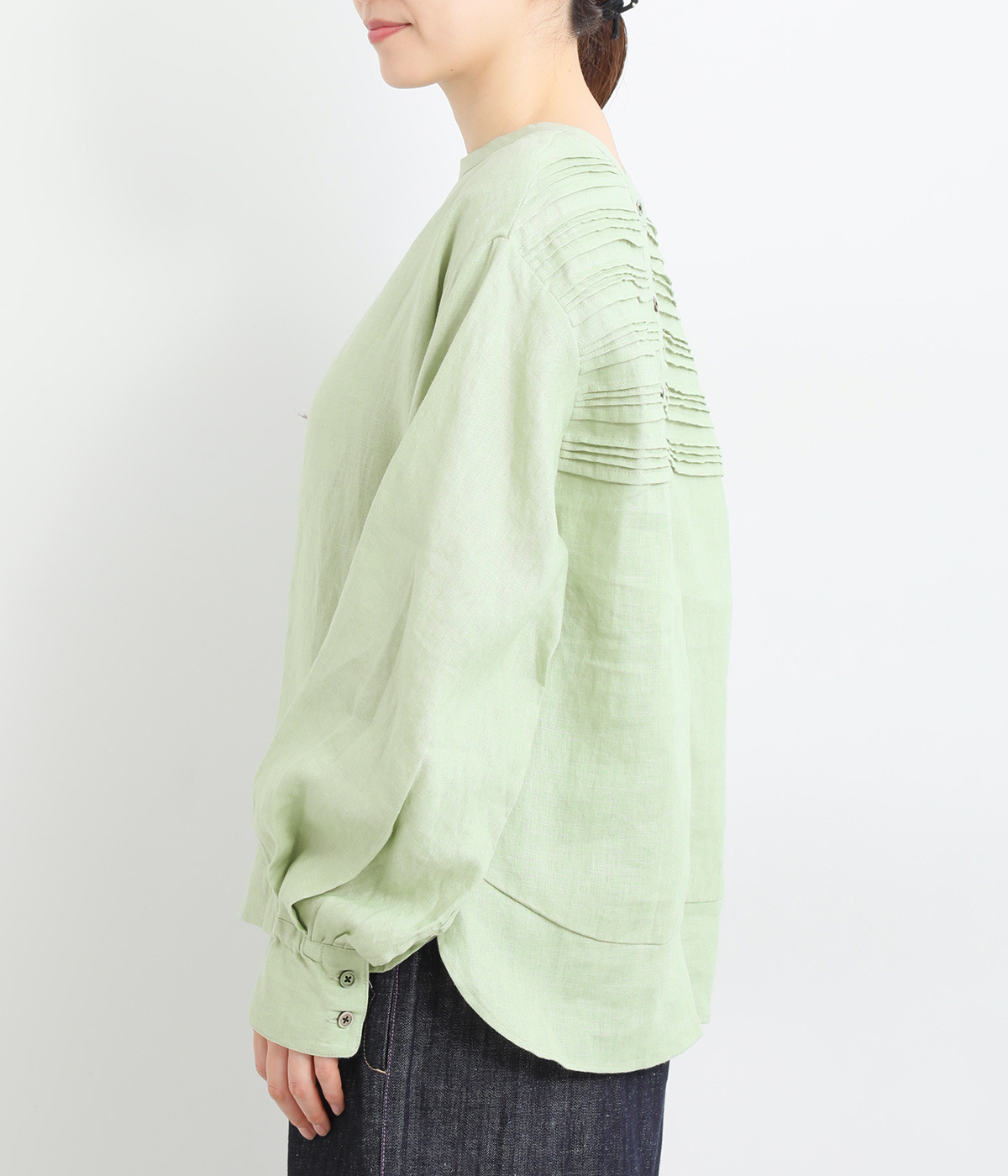 袖口ゴムシャーリング加工でふわりとボリューム感を