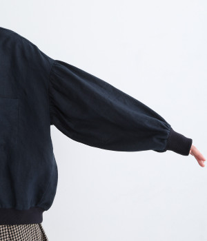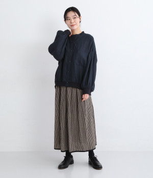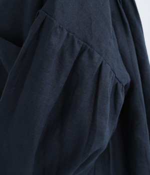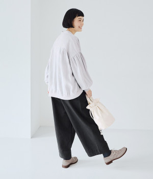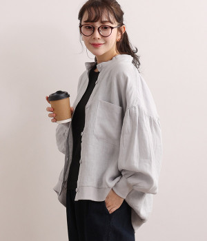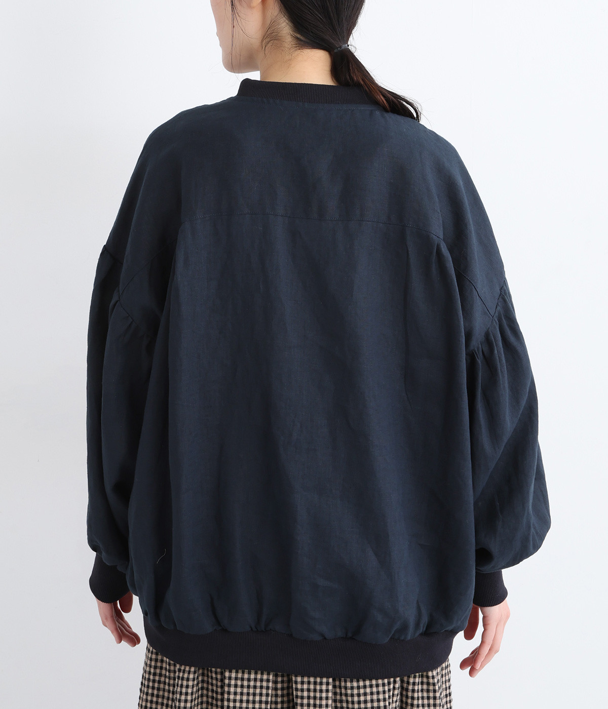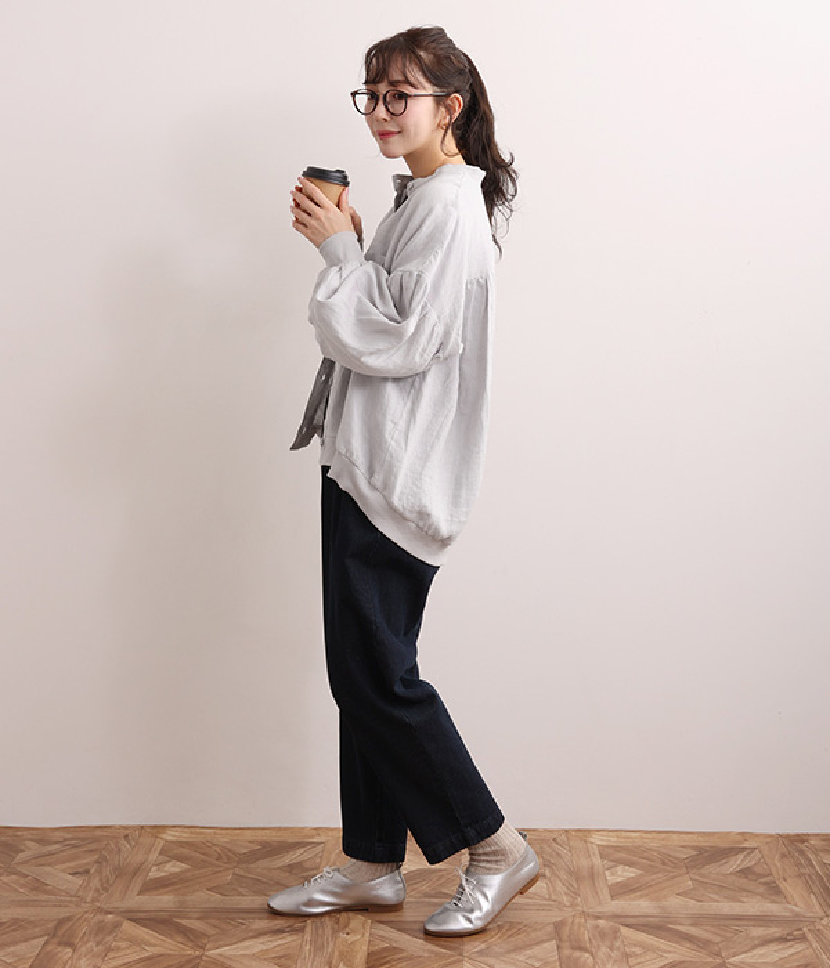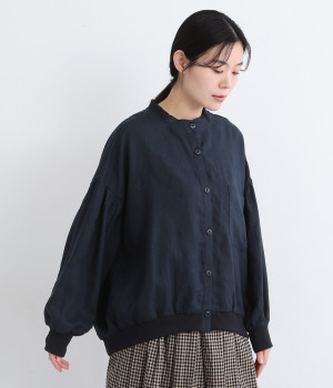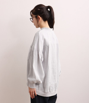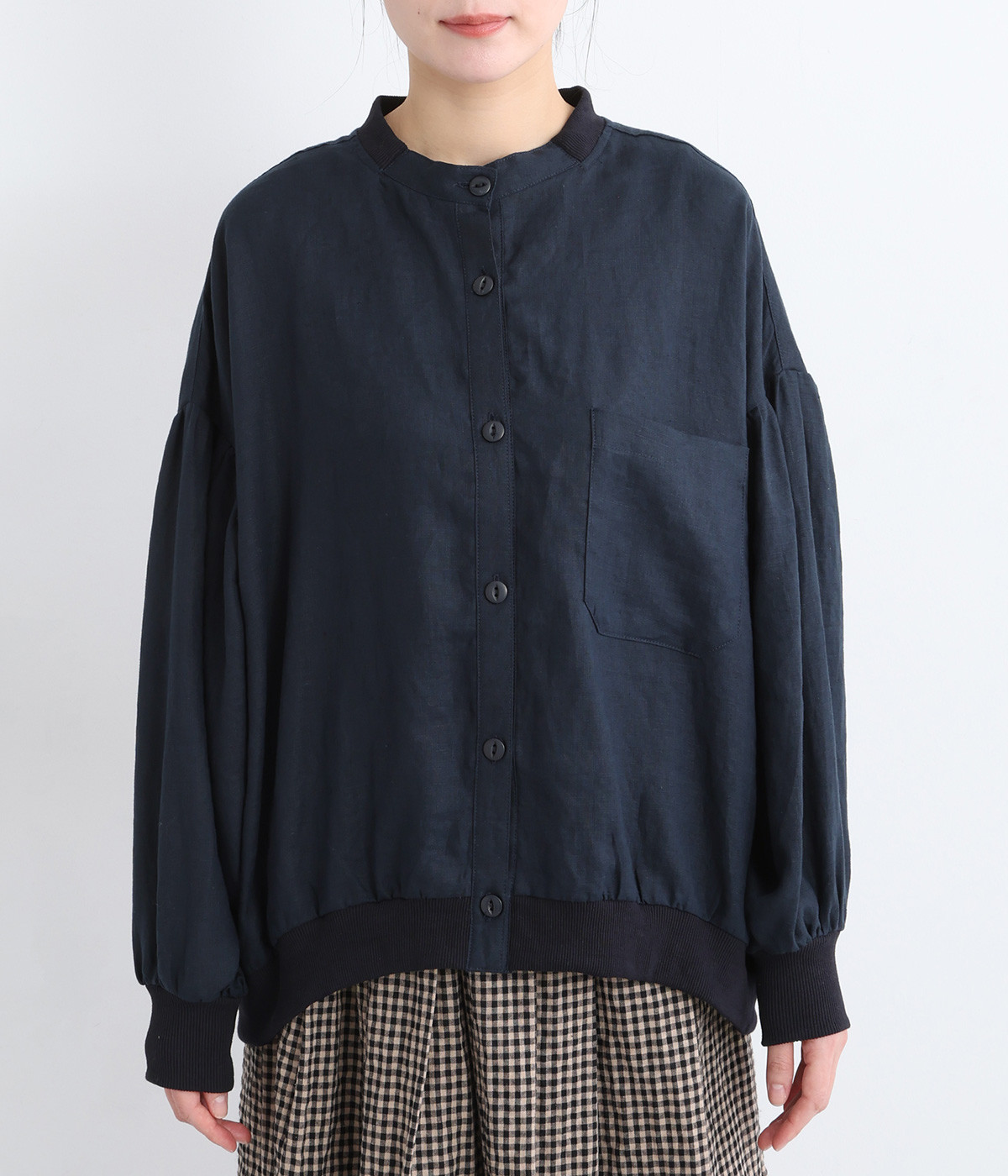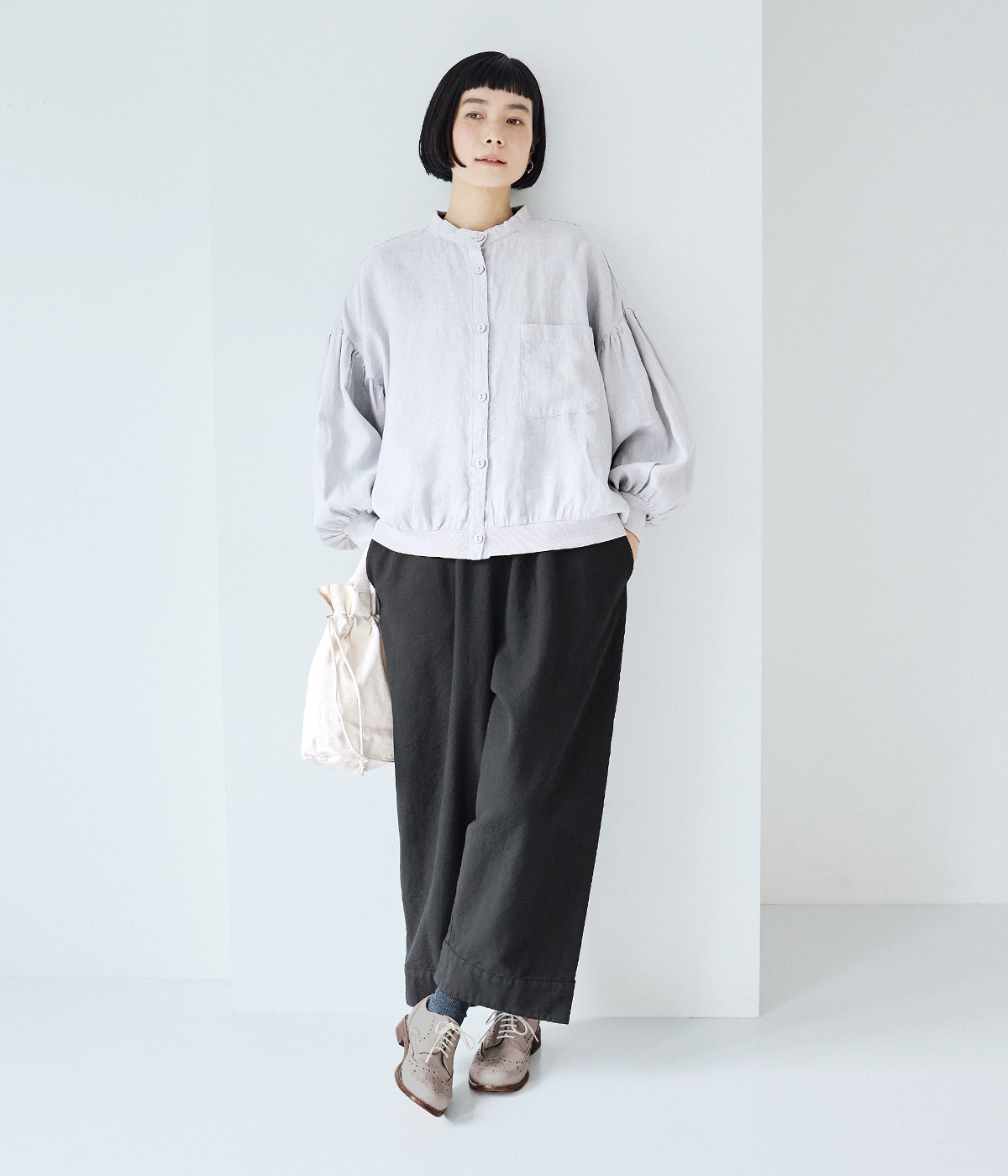 着心地が良く、通気性に優れたリネン素材を使用したブラウス。生地のシワ感も麻ならではで、アイロンがけの手間が少ないのも着こなしやすいポイントです。部分的に入れたリブ使いでフィットを高めつつ、ふんわりボリューム袖&ワイドな身幅でゆるっとした雰囲気に仕立てました。ボタンを開いて羽織りとしても◎。