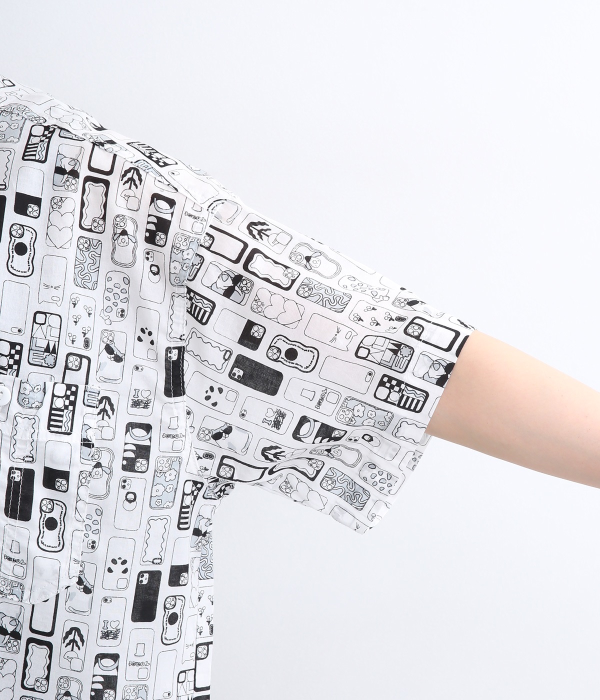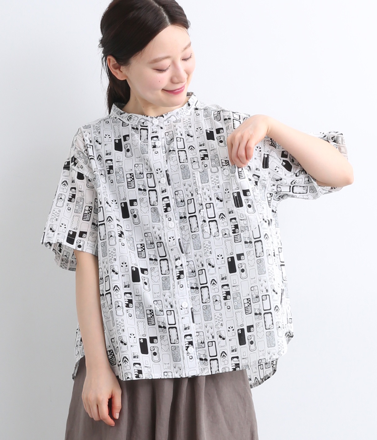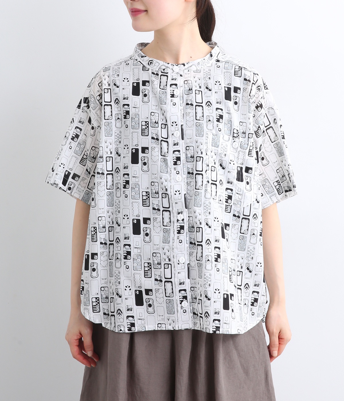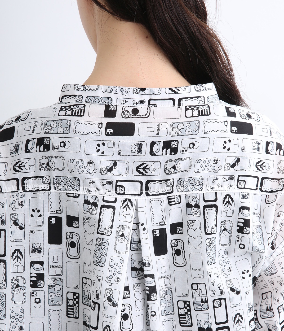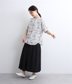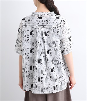 【素材】細番手の糸を平織りにした、薄手でさらっとしたコットンローン生地を使用。通気性に優れ、爽やかな風が心地よく抜けます。【デザイン】ユニークでキャッチーなプリントが視線を集める半袖シャツ。ゆったりとしたボックスシルエットに、抜け感のあるラウンドヘムを合わせ、軽やかな雰囲気に。印象的な柄が際立つ、シンプルなデザインに仕上げました。