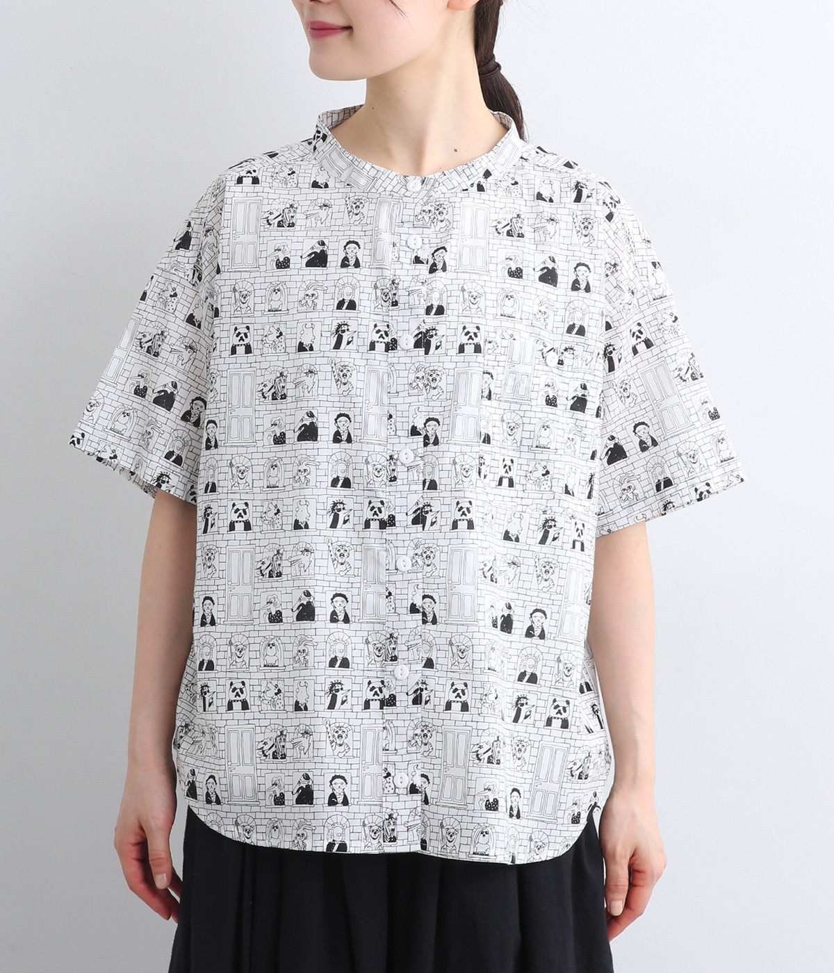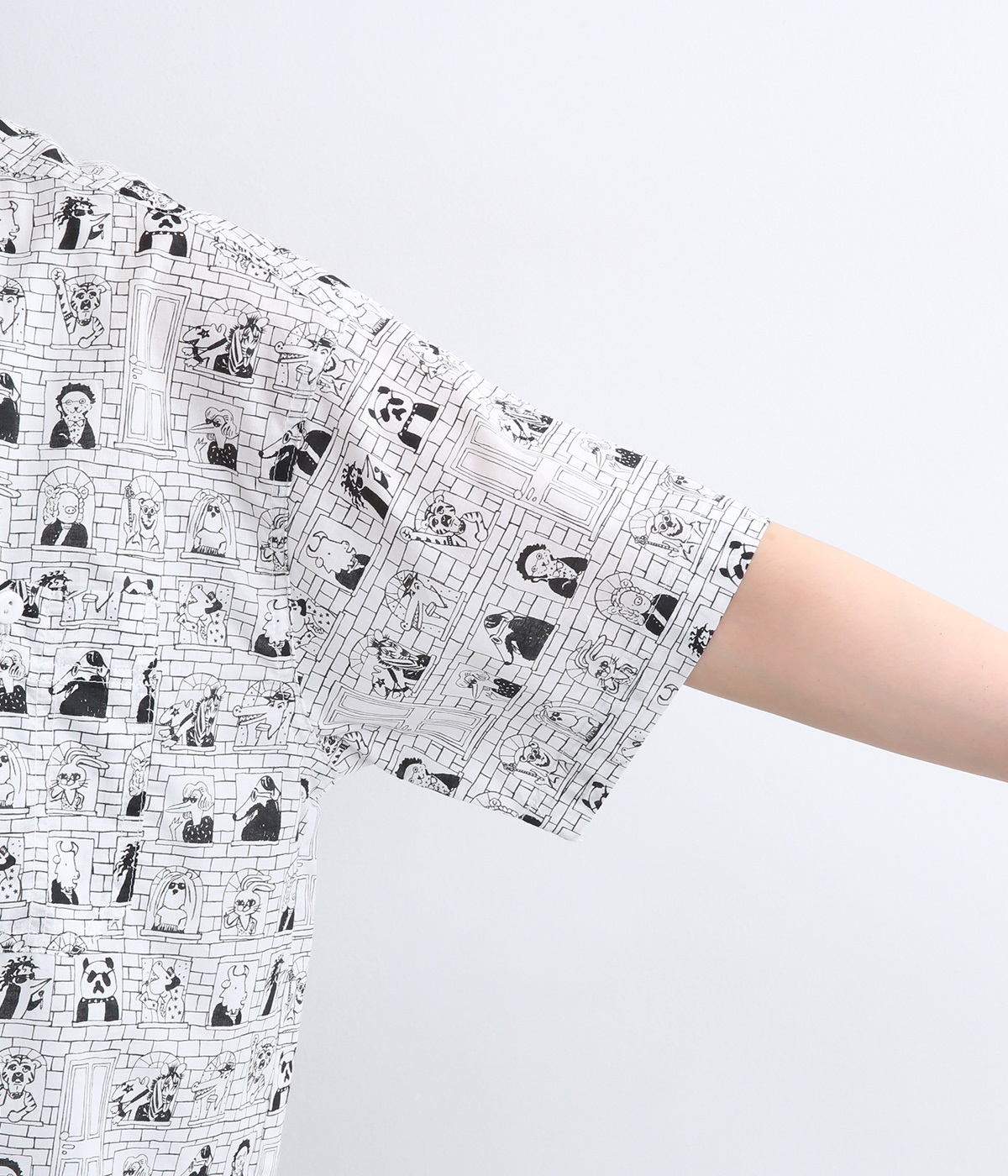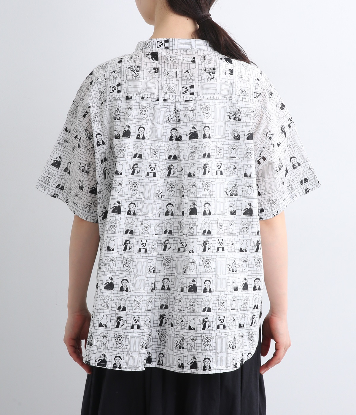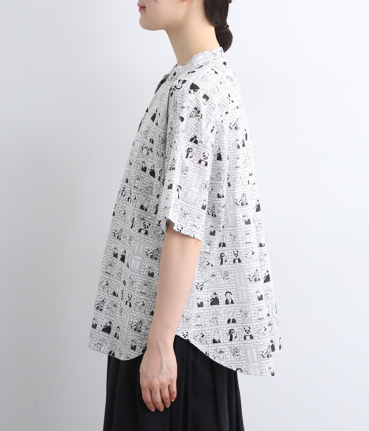【素材】細番手の糸を平織りにした、薄手でさらっとしたコットンローン生地を使用。通気性に優れ、爽やかな風が心地よく抜けます。【デザイン】ユニークでキャッチーなプリントが視線を集める半袖シャツ。ゆったりとしたボックスシルエットに、抜け感のあるラウンドヘムを合わせ、軽やかな雰囲気に。印象的な柄が際立つ、シンプルなデザインに仕上げました。