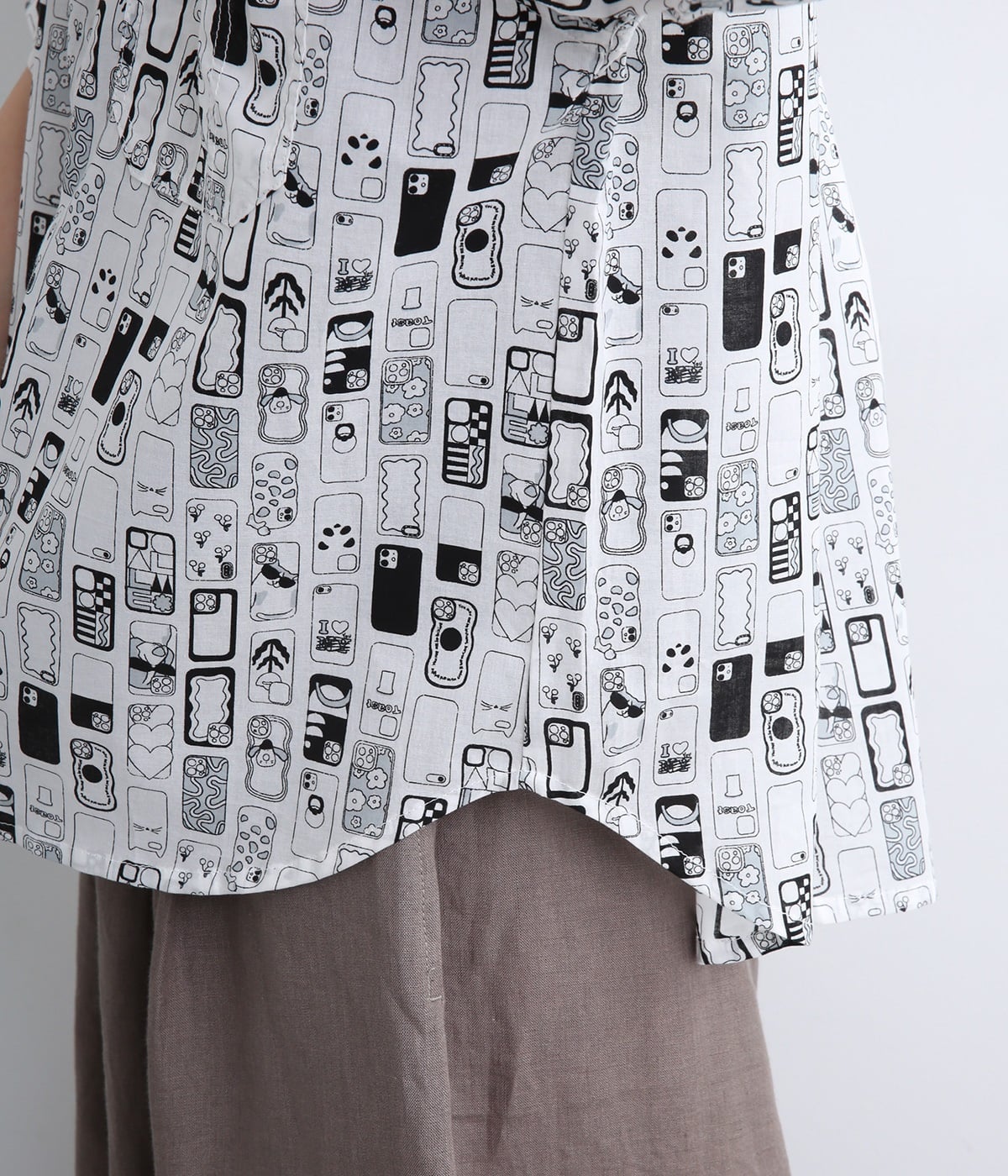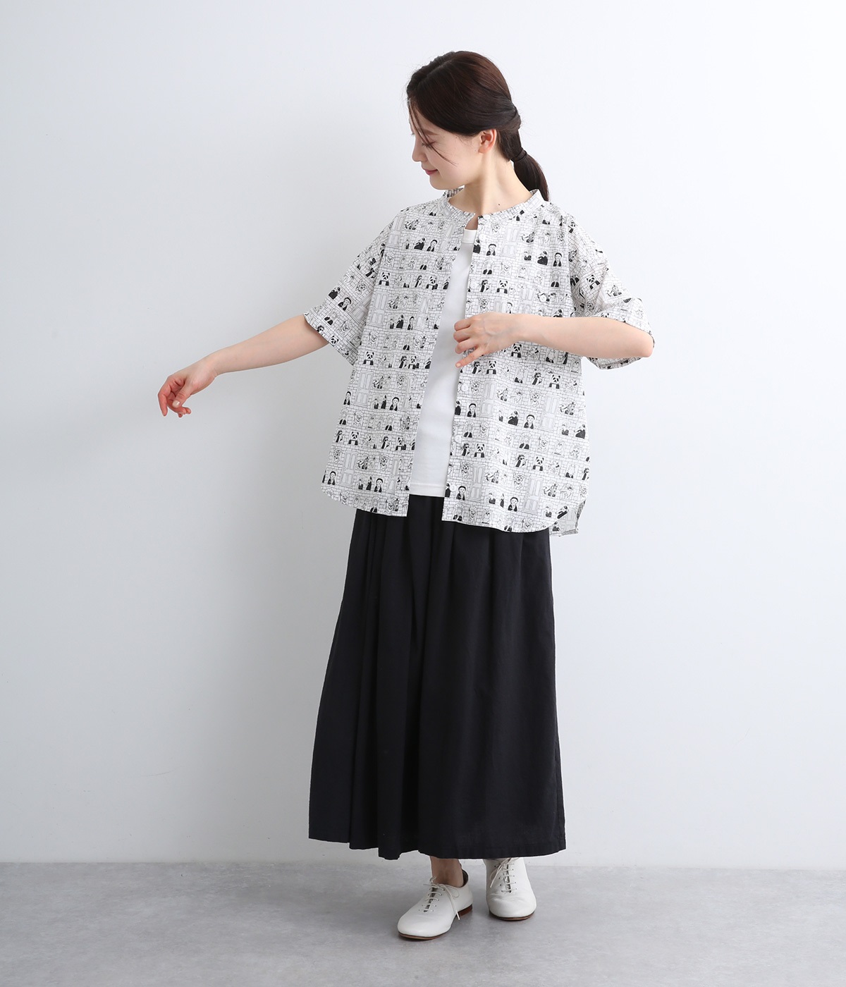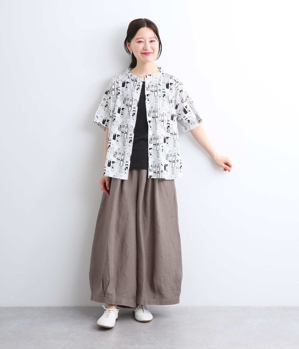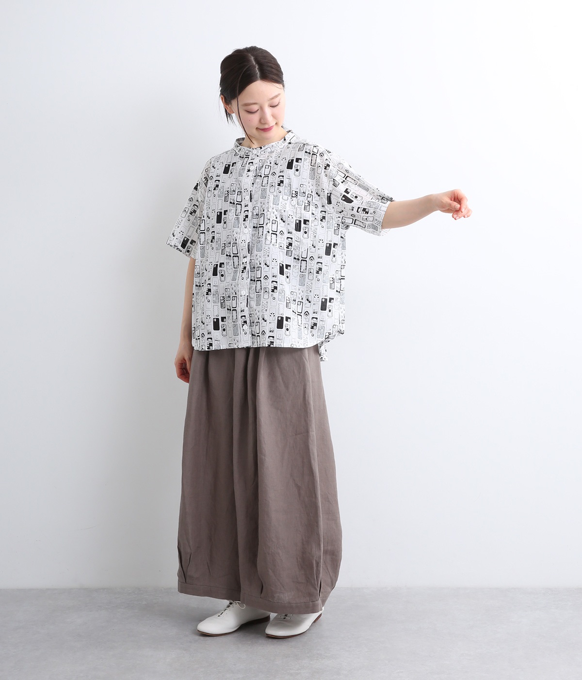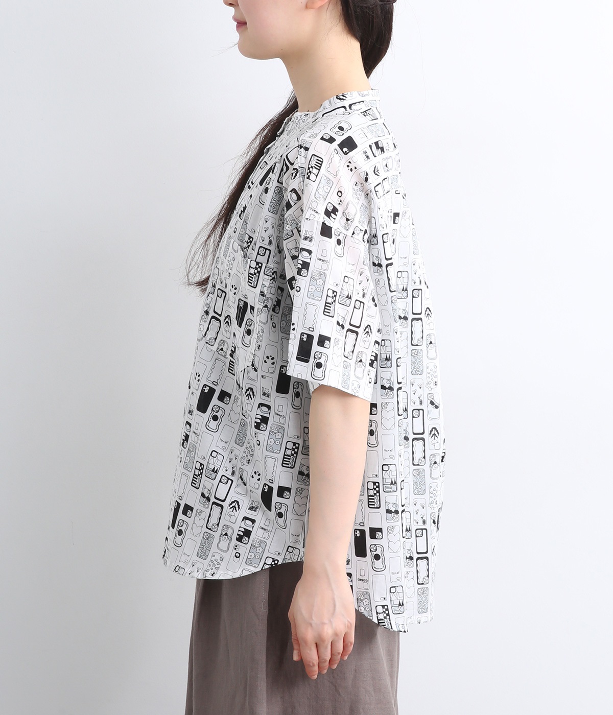 【素材】細番手の糸を平織りにした、薄手でさらっとしたコットンローン生地を使用。通気性に優れ、爽やかな風が心地よく抜けます。【デザイン】ユニークでキャッチーなプリントが視線を集める半袖シャツ。ゆったりとしたボックスシルエットに、抜け感のあるラウンドヘムを合わせ、軽やかな雰囲気に。印象的な柄が際立つ、シンプルなデザインに仕上げました。