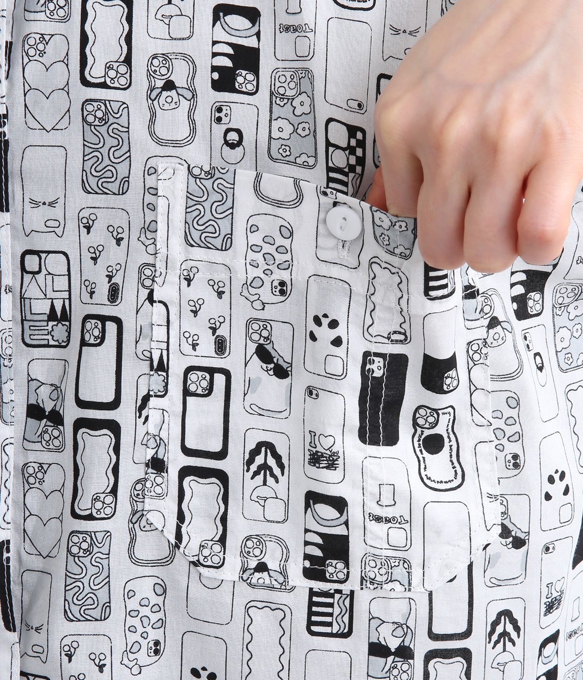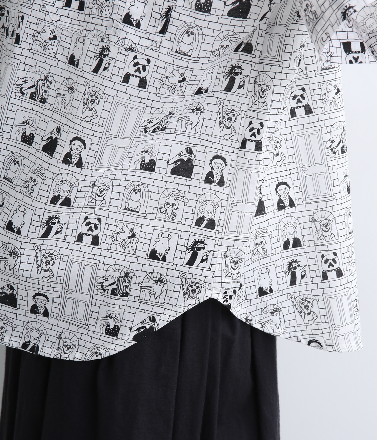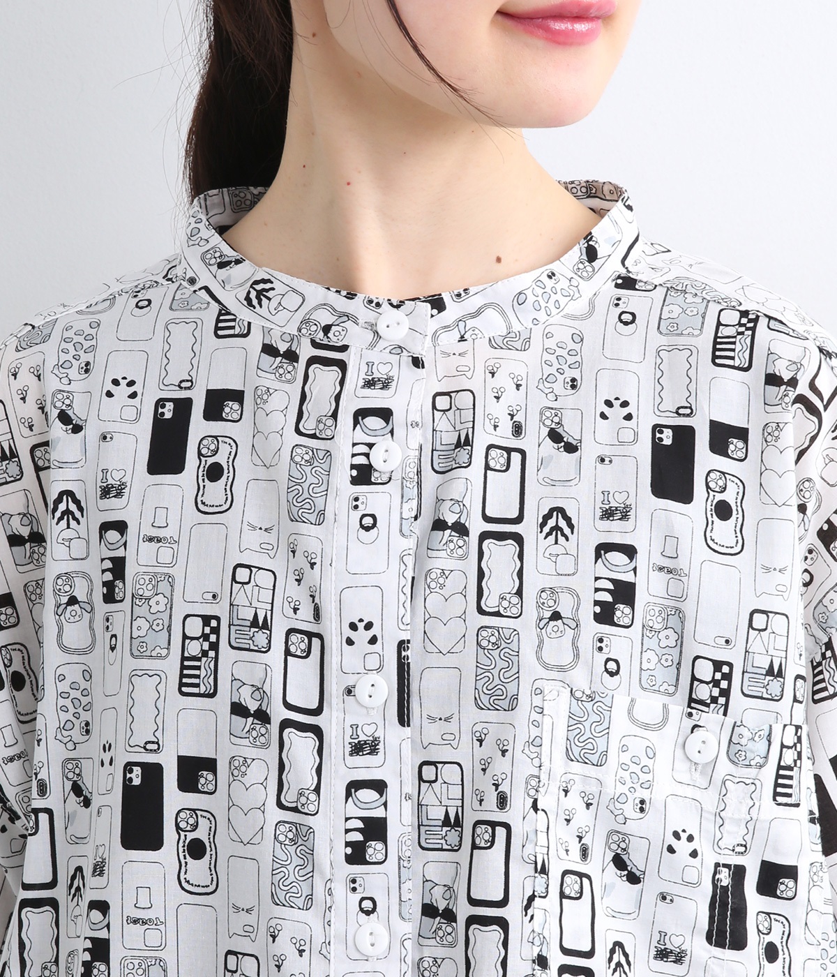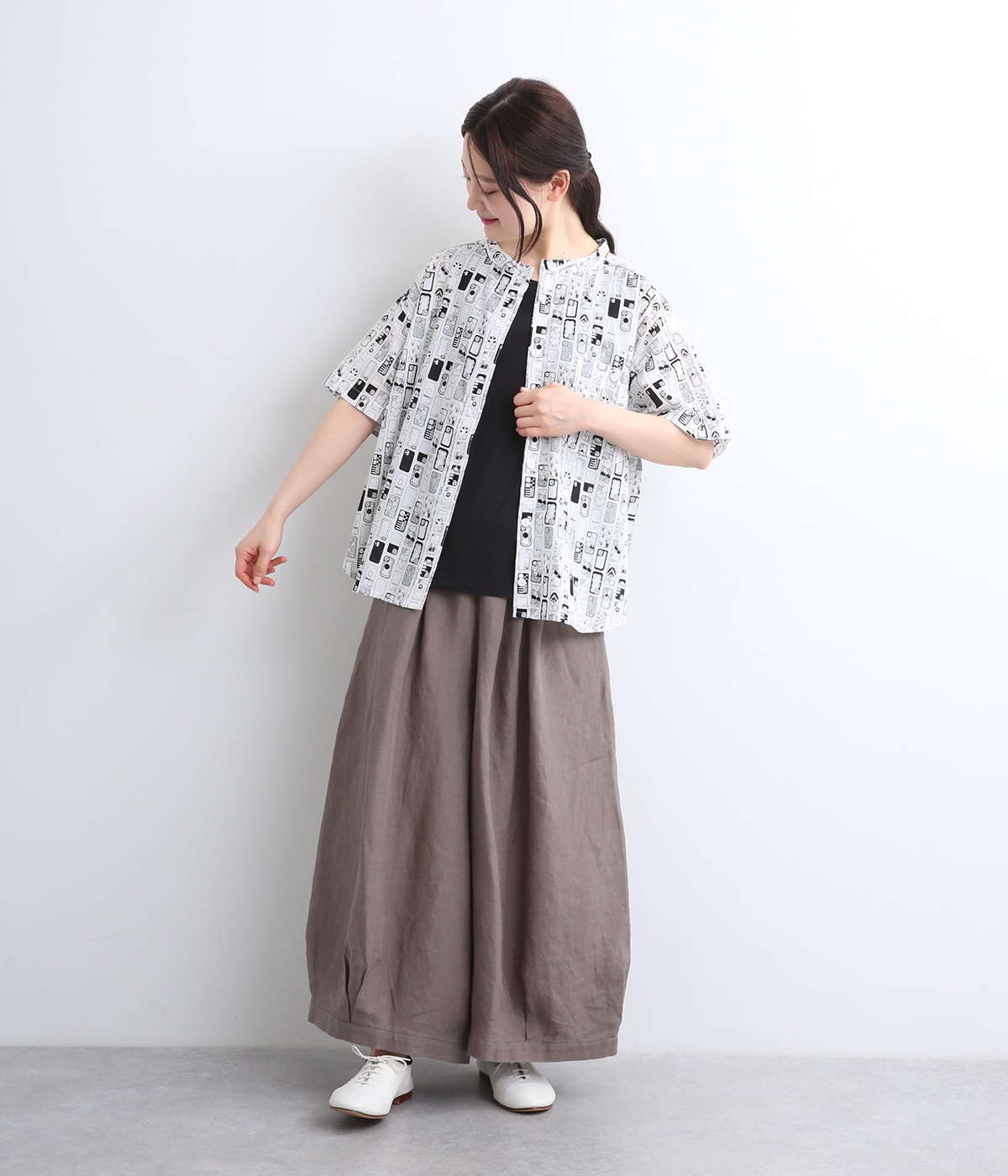 【素材】細番手の糸を平織りにした、薄手でさらっとしたコットンローン生地を使用。通気性に優れ、爽やかな風が心地よく抜けます。【デザイン】ユニークでキャッチーなプリントが視線を集める半袖シャツ。ゆったりとしたボックスシルエットに、抜け感のあるラウンドヘムを合わせ、軽やかな雰囲気に。印象的な柄が際立つ、シンプルなデザインに仕上げました。